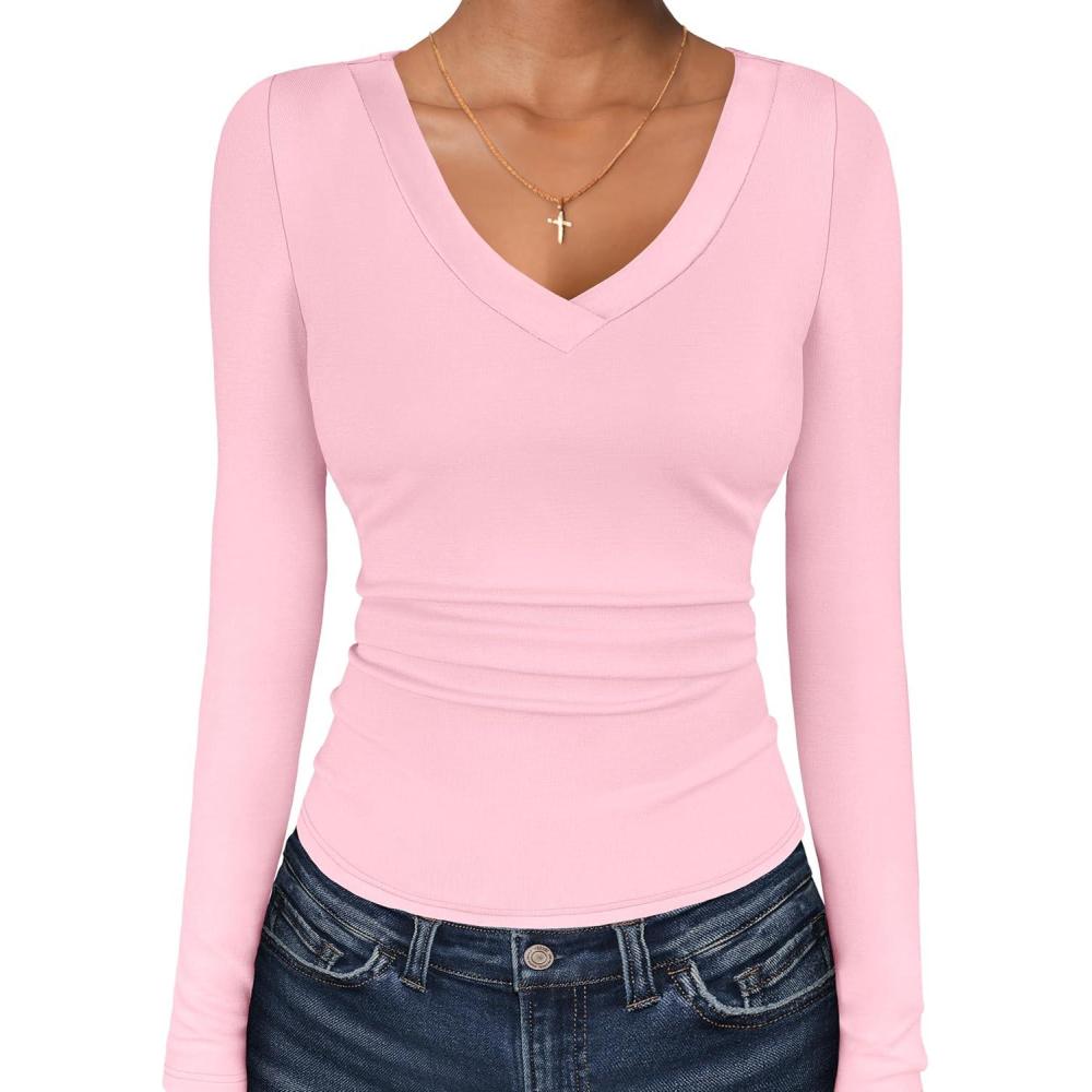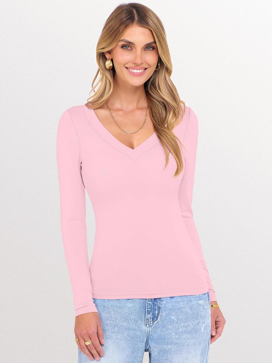 ANRABESS Long Sleeve Shirts for Women V Neck Basic Tees Top Casual Going Out Tshirt Workout Outfits 2025 Fall Fashion Clothes(Light Pink)