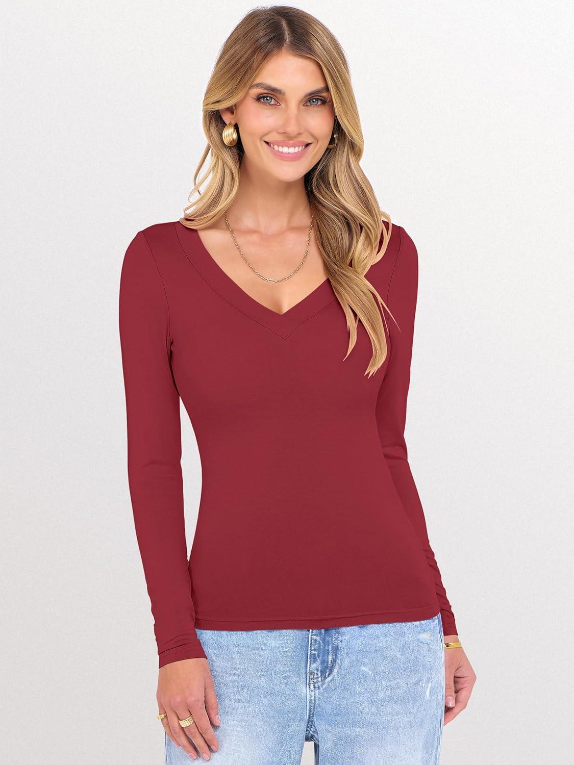 ANRABESS Long Sleeve Shirts for Women V Neck Basic Tees Top Casual Going Out Tshirt Workout Outfits 2025 Fall Fashion Clothes(Red)