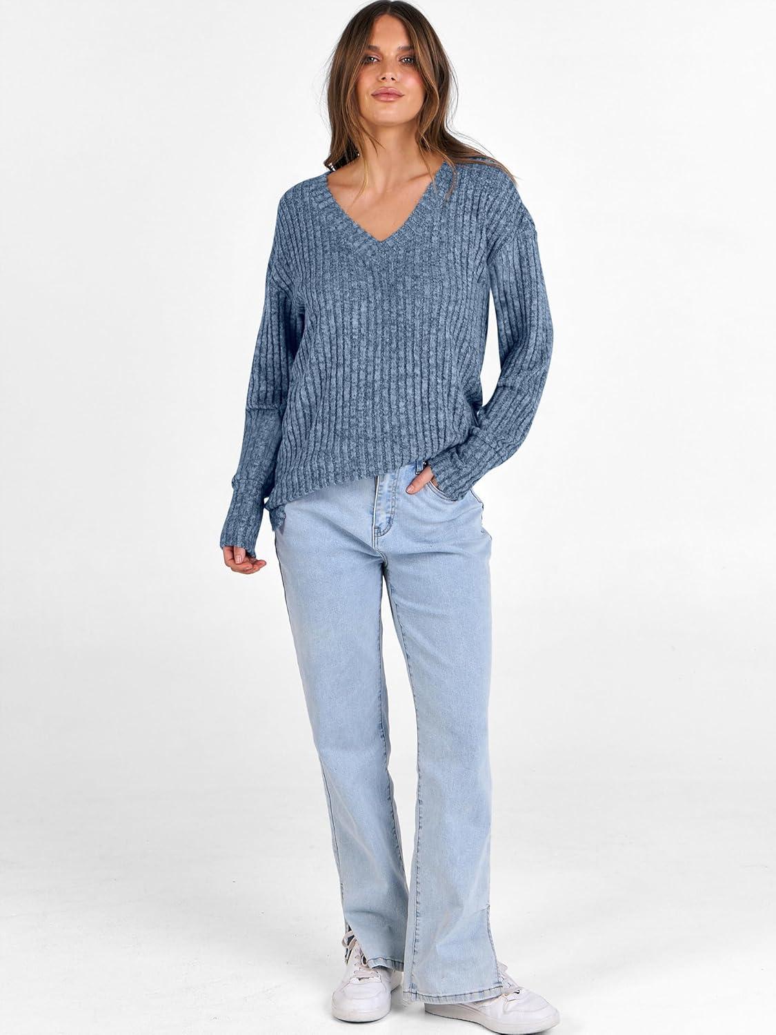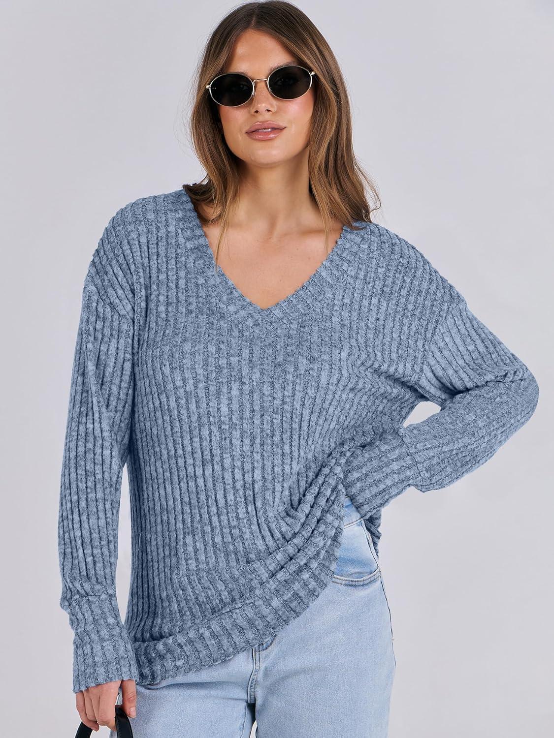ANRABESS Long Sleeve Shirts for Women V Neck Casual Fall Tops Loose Fit Lightweight Sweaters Tunic Fashion 2025 Clothes(Dark Blue)