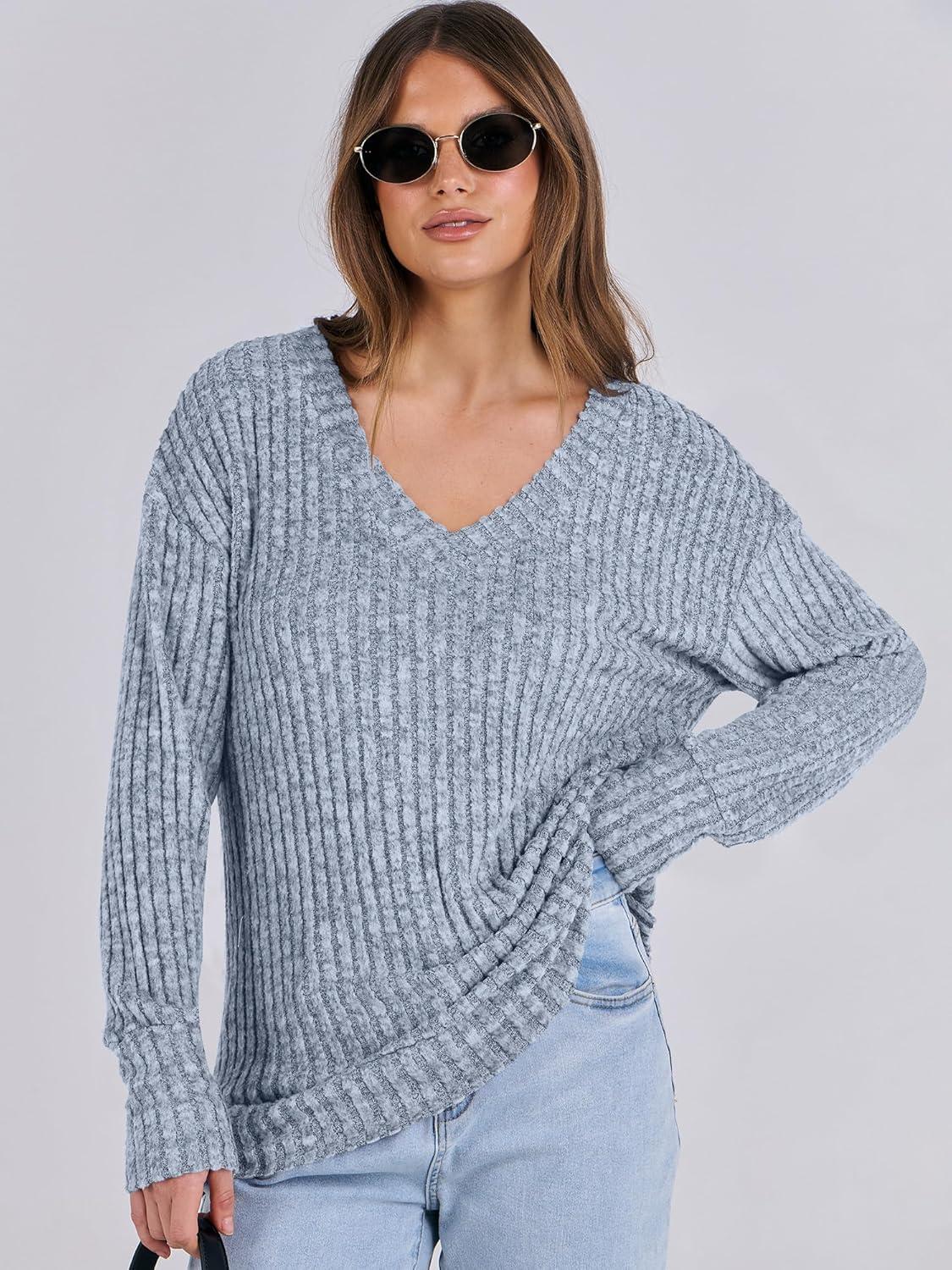 ANRABESS Long Sleeve Shirts for Women V Neck Casual Fall Tops Loose Fit Lightweight Sweaters Tunic Fashion 2025 Clothes(Lake Blue)