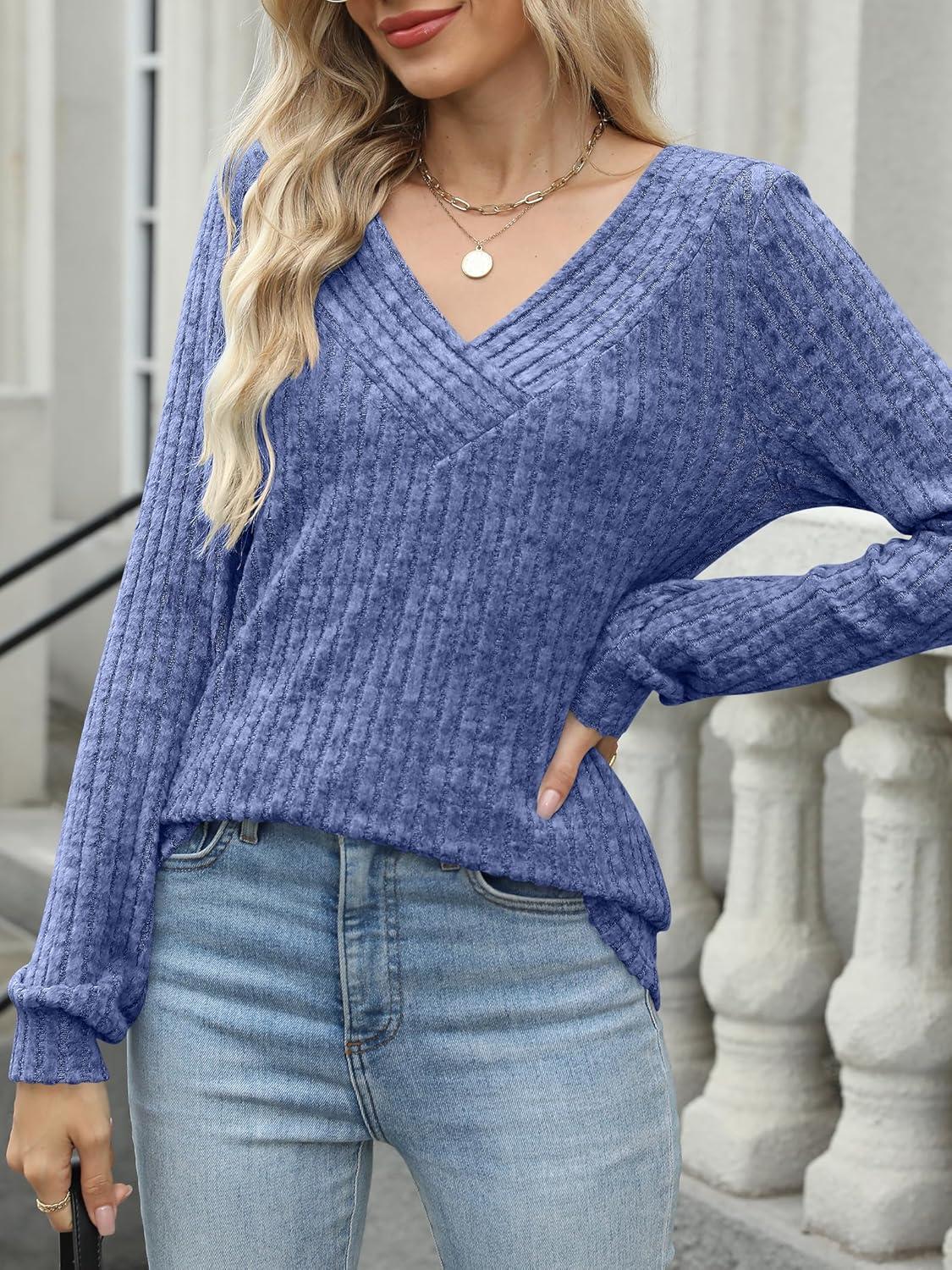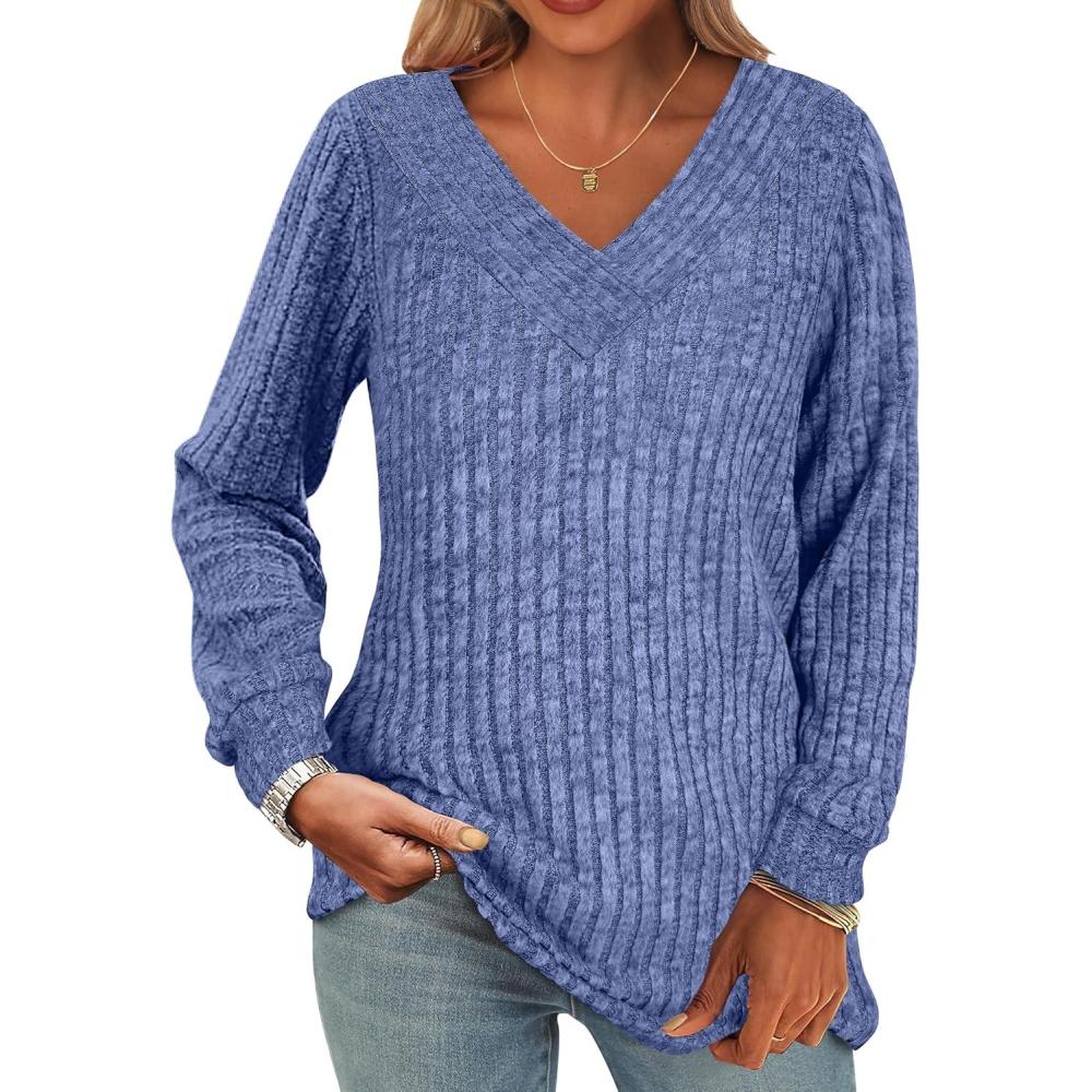 ANRABESS Long Sleeve Shirts for Women V Neck Tunic Tops Business Casual Loose Fall Lightweight Sweaters Fashion Clothes 2025(Blue)