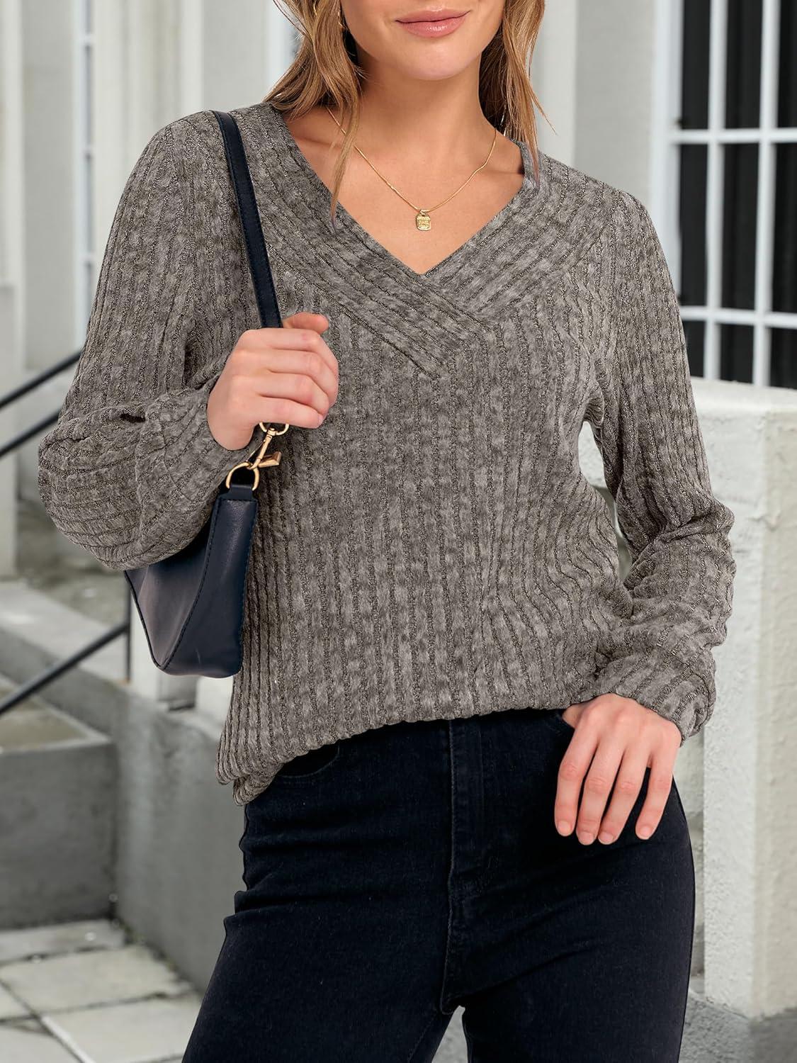 ANRABESS Long Sleeve Shirts for Women V Neck Tunic Tops Business Casual Loose Fall Lightweight Sweaters Fashion Clothes 2025(Coffee)