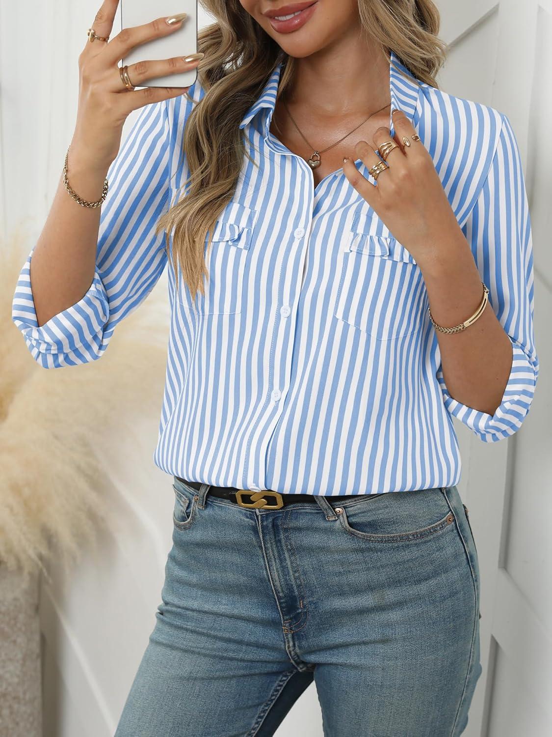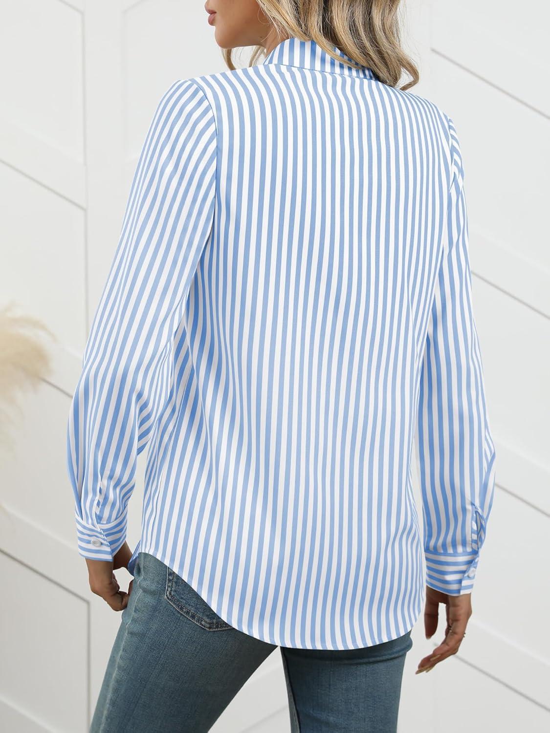 ANRABESS Long Sleeve Striped Shirts for Women Button Down Cute Tops 2026 Spring V Neck Businese Casual Blouses with Pockets(Blue Striped)