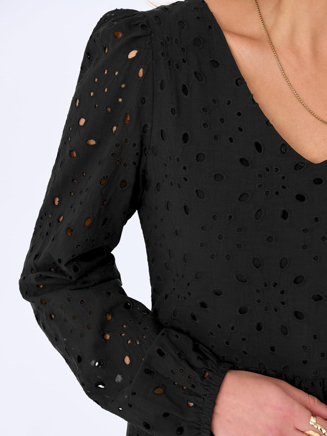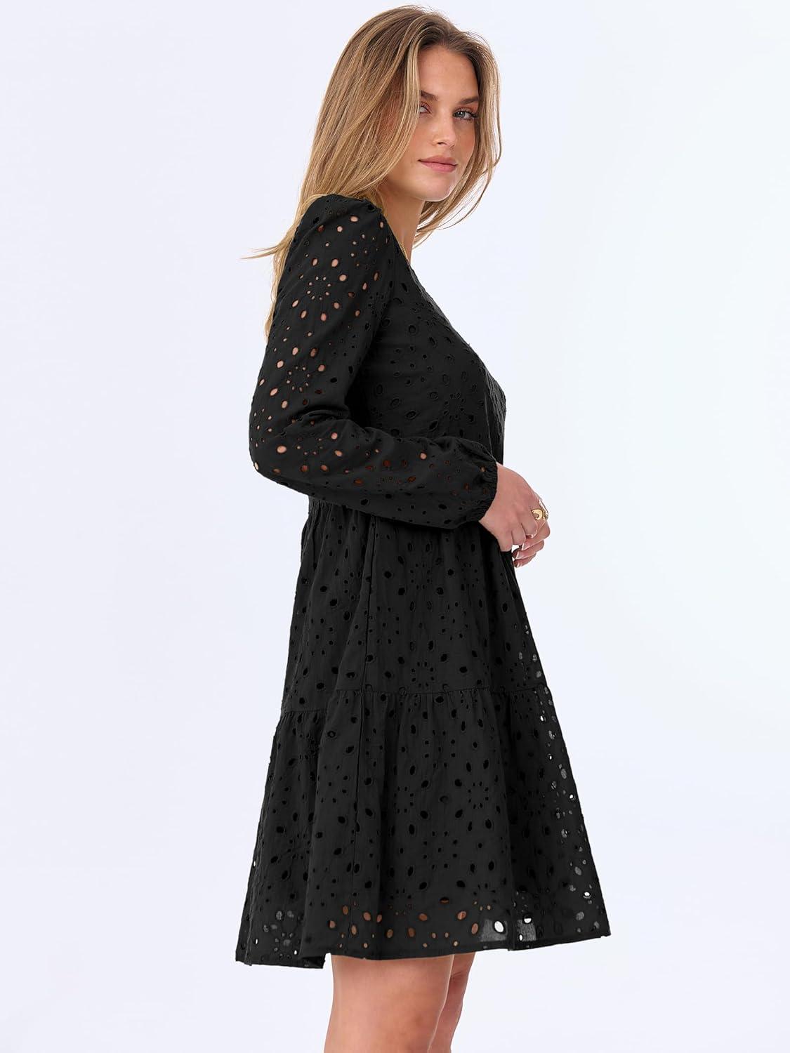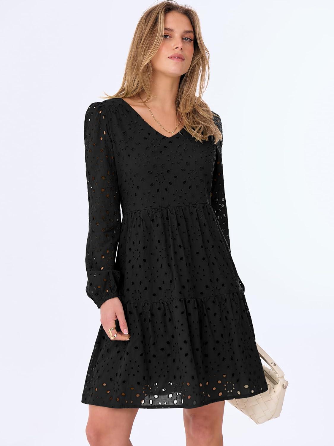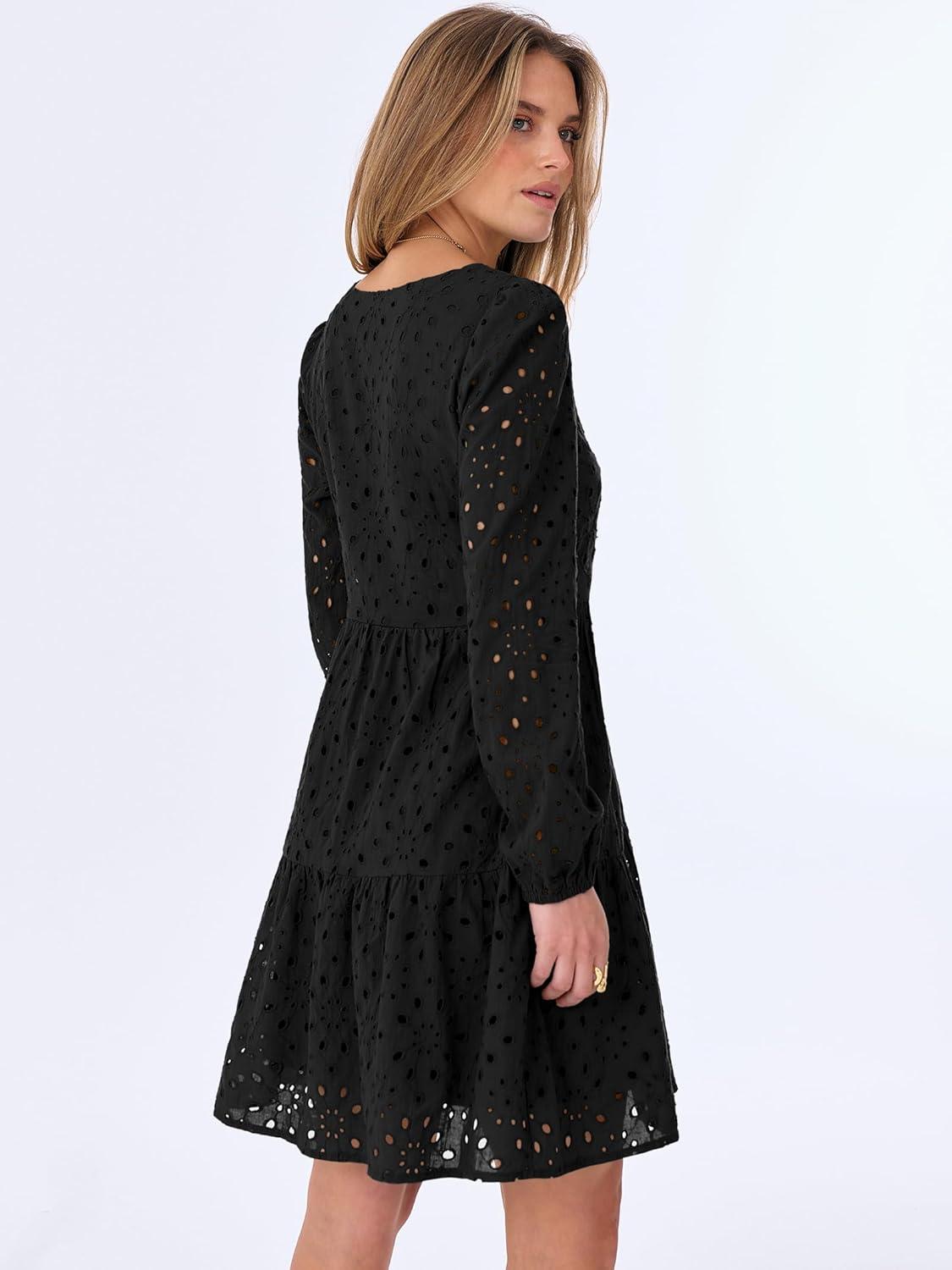 ANRABESS Long Sleeve V Neck Dresses for Women Eyelet Hollow Out Business Casual Tiered 2025 Fall Mini Dress with Pockets(Black)