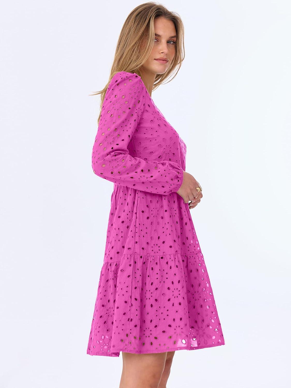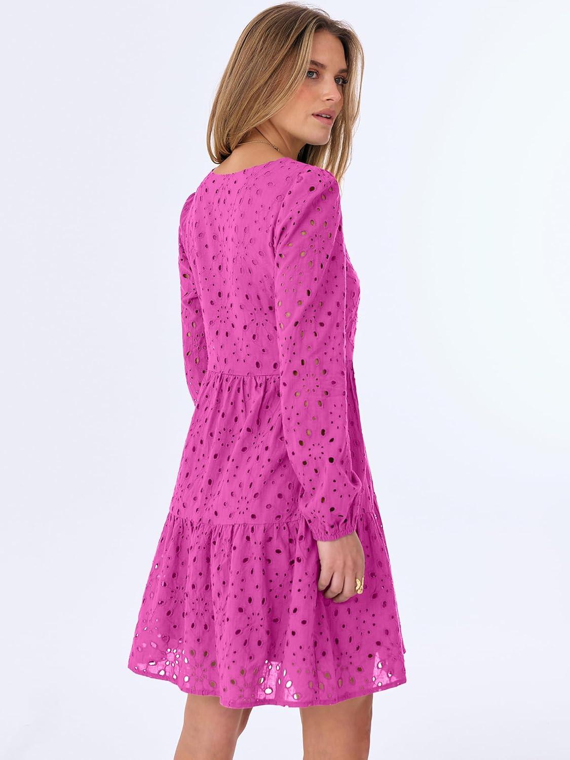 ANRABESS Long Sleeve V Neck Dresses for Women Eyelet Hollow Out Business Casual Tiered 2025 Fall Mini Dress with Pockets(Hot Pink)