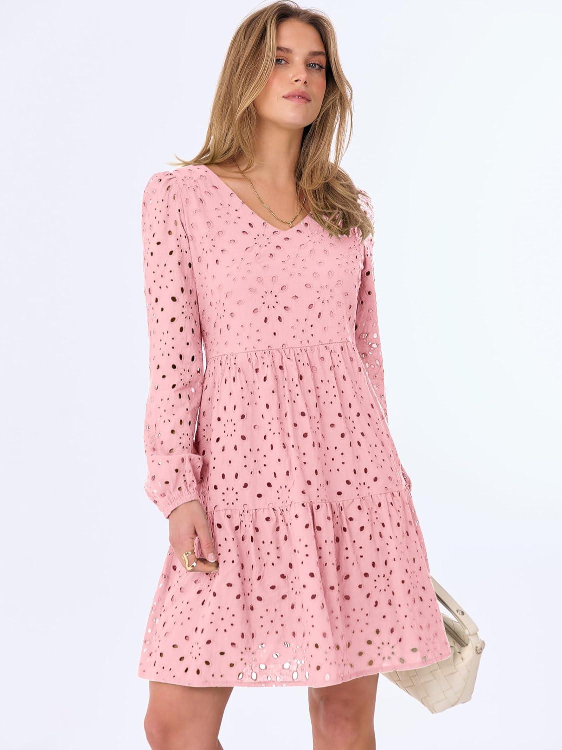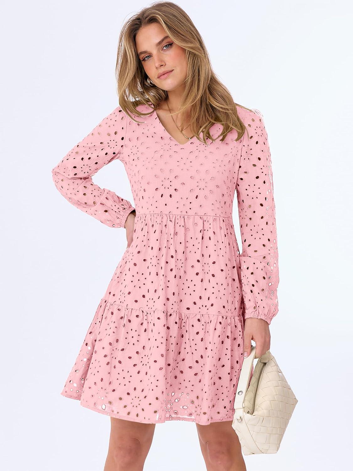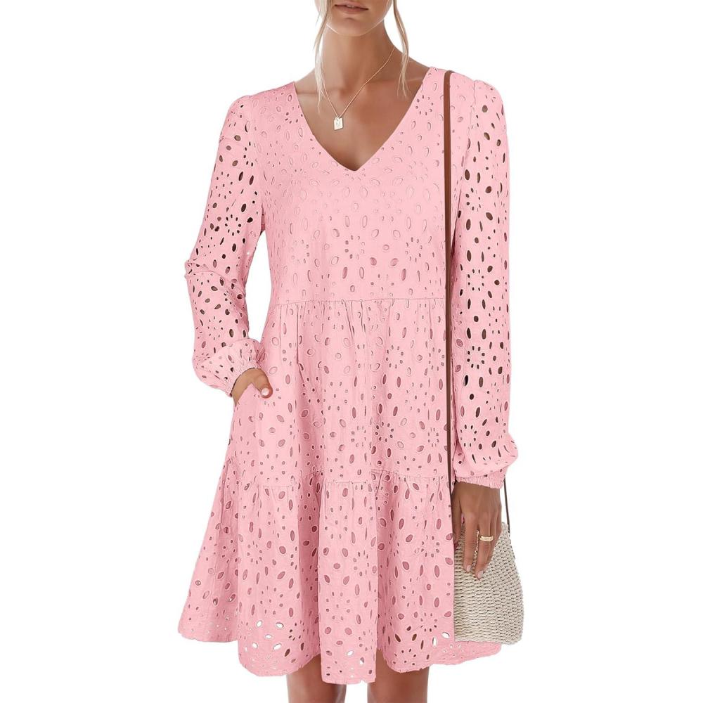 ANRABESS Long Sleeve V Neck Dresses for Women Eyelet Hollow Out Business Casual Tiered 2025 Fall Mini Dress with Pockets(Pink)