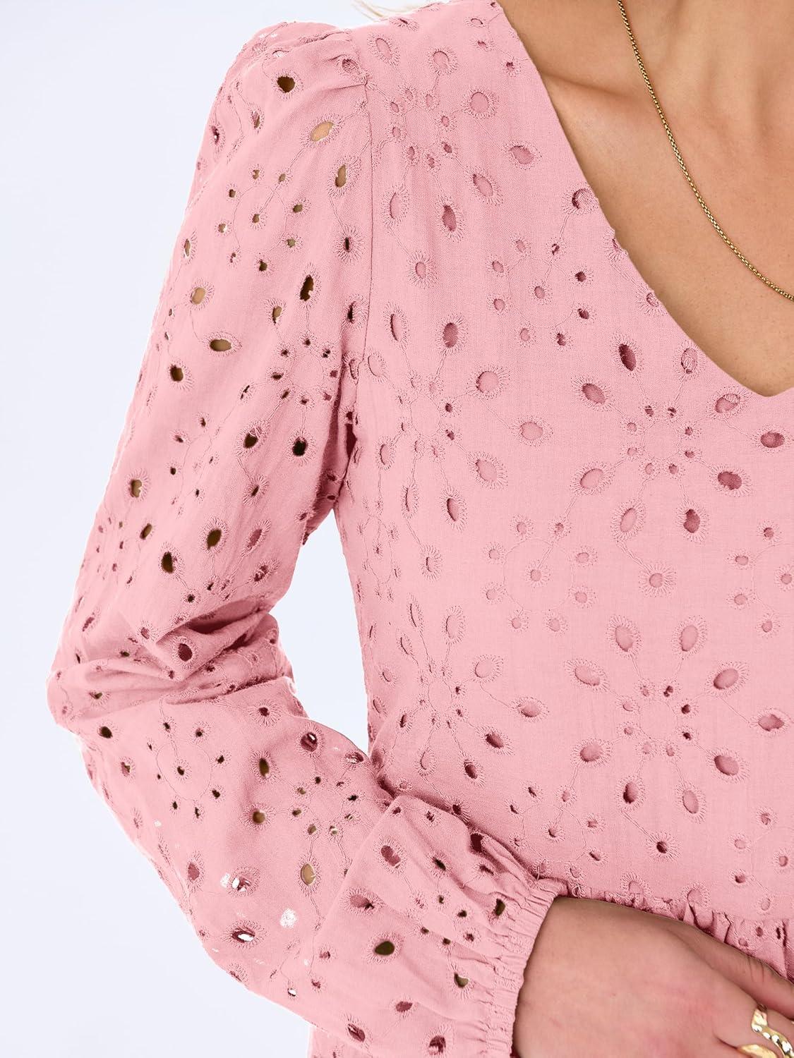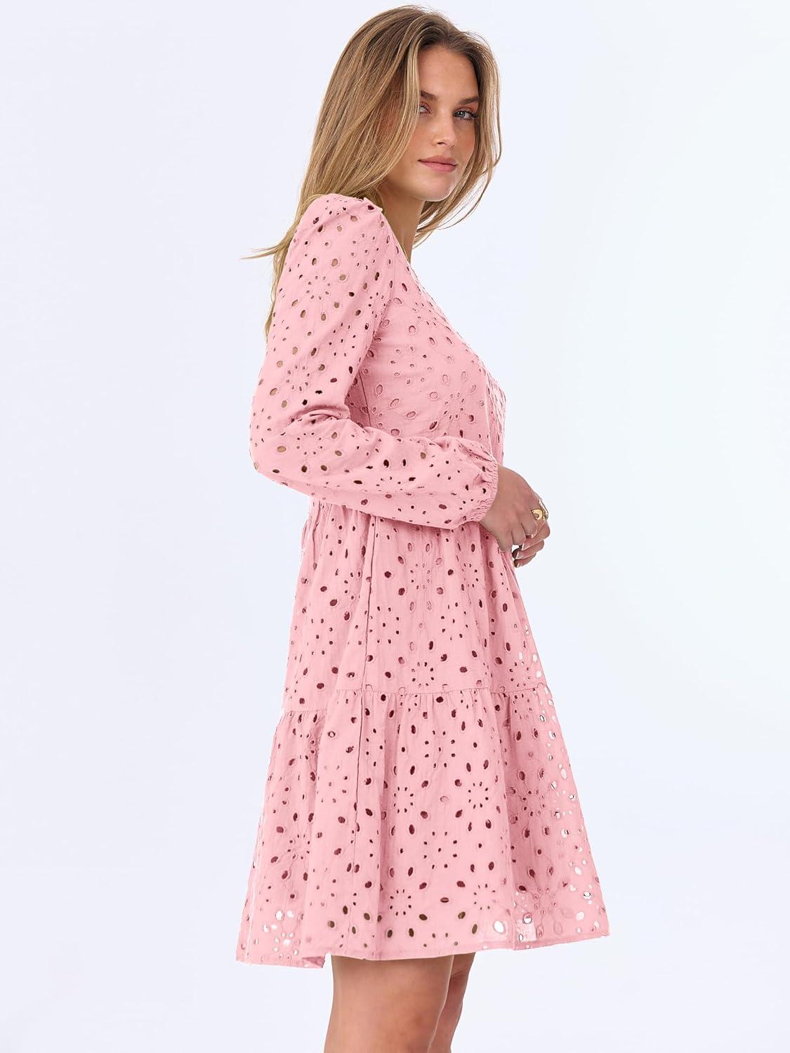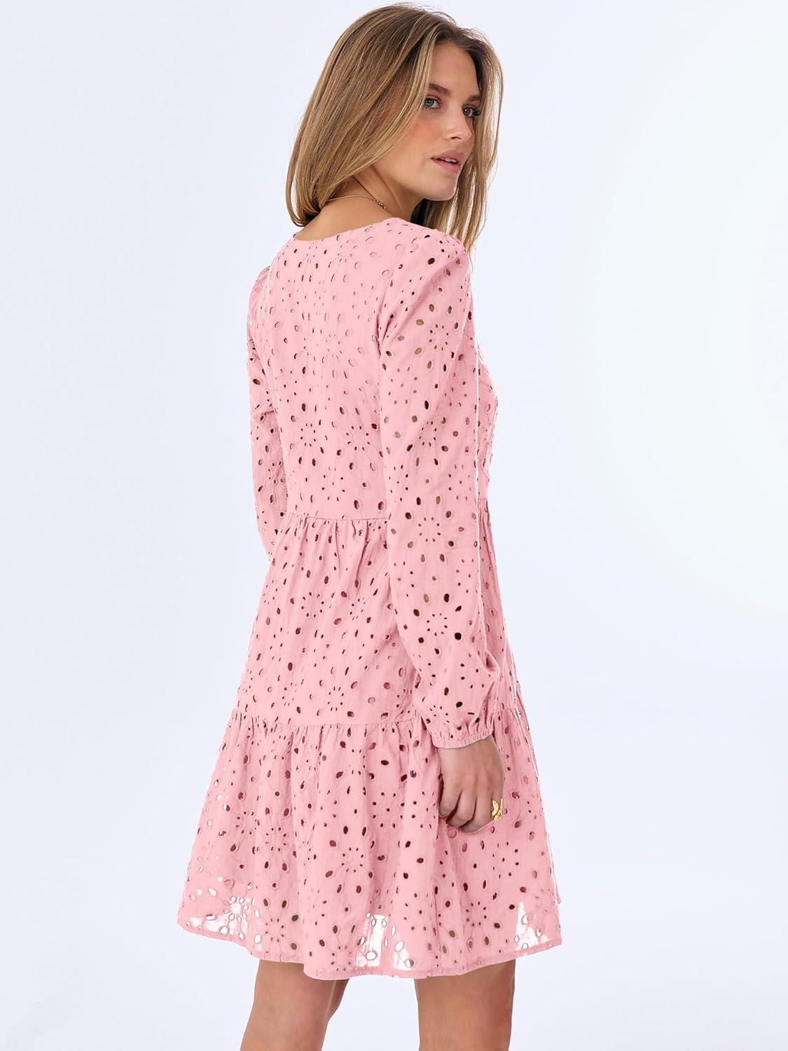 imageANRABESS Long Sleeve V Neck Dresses for Women Eyelet Hollow Out Business Casual Tiered 2025 Fall Mini Dress with PocketsPink