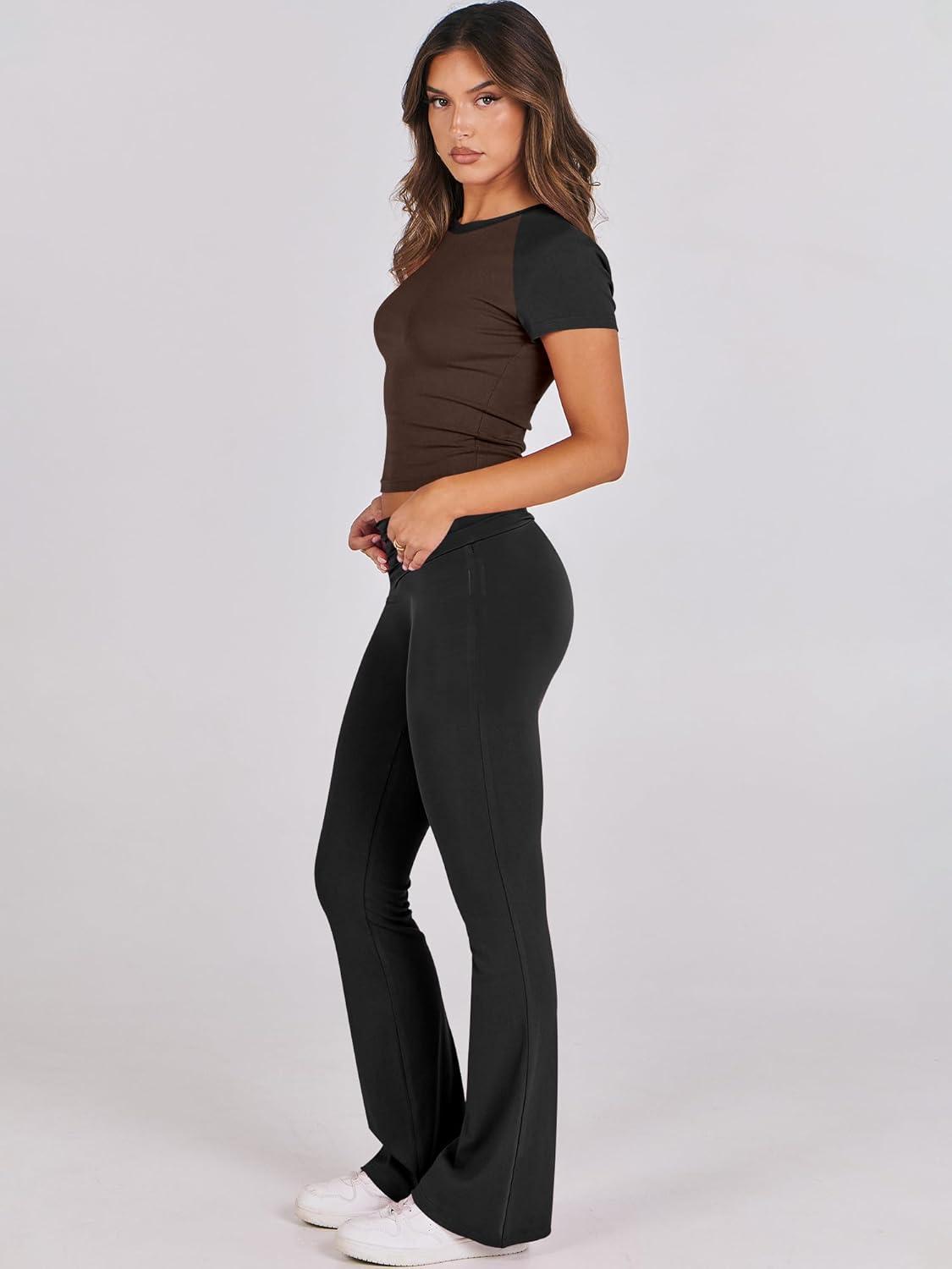 ANRABESS Lounge Sets for Women 2 Piece Foldover Yoga Flare Leggings Pants Crop Tops Casual Y2K Outfits Matching Tracksuit Set(Brown Black)