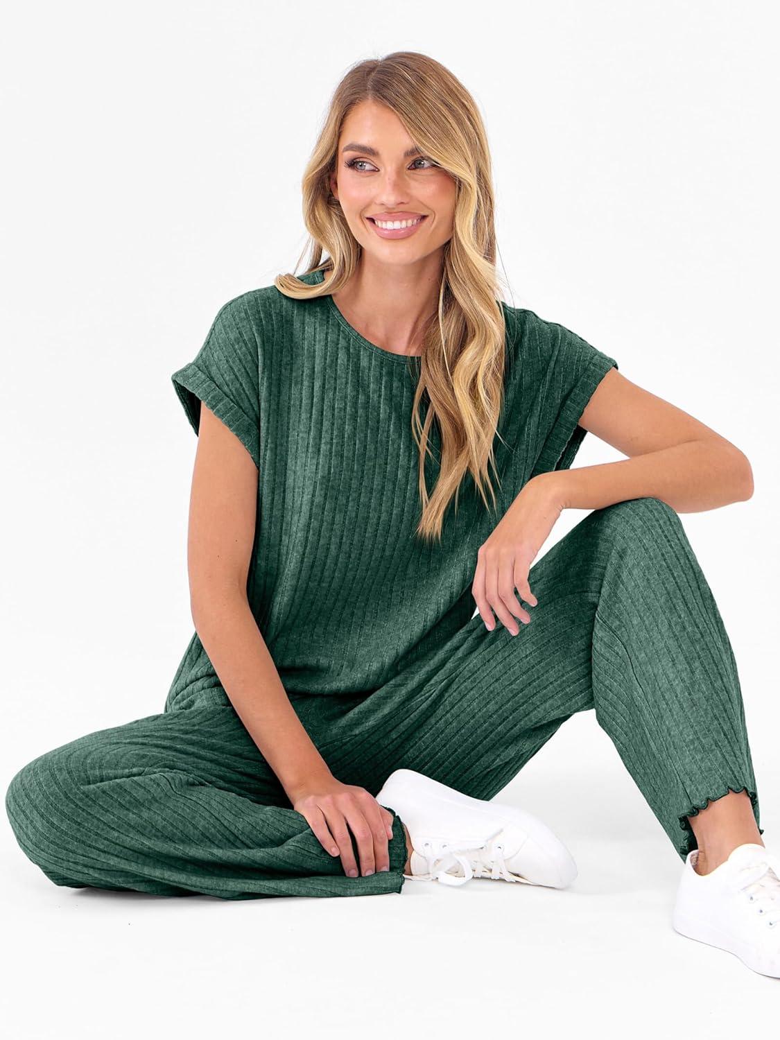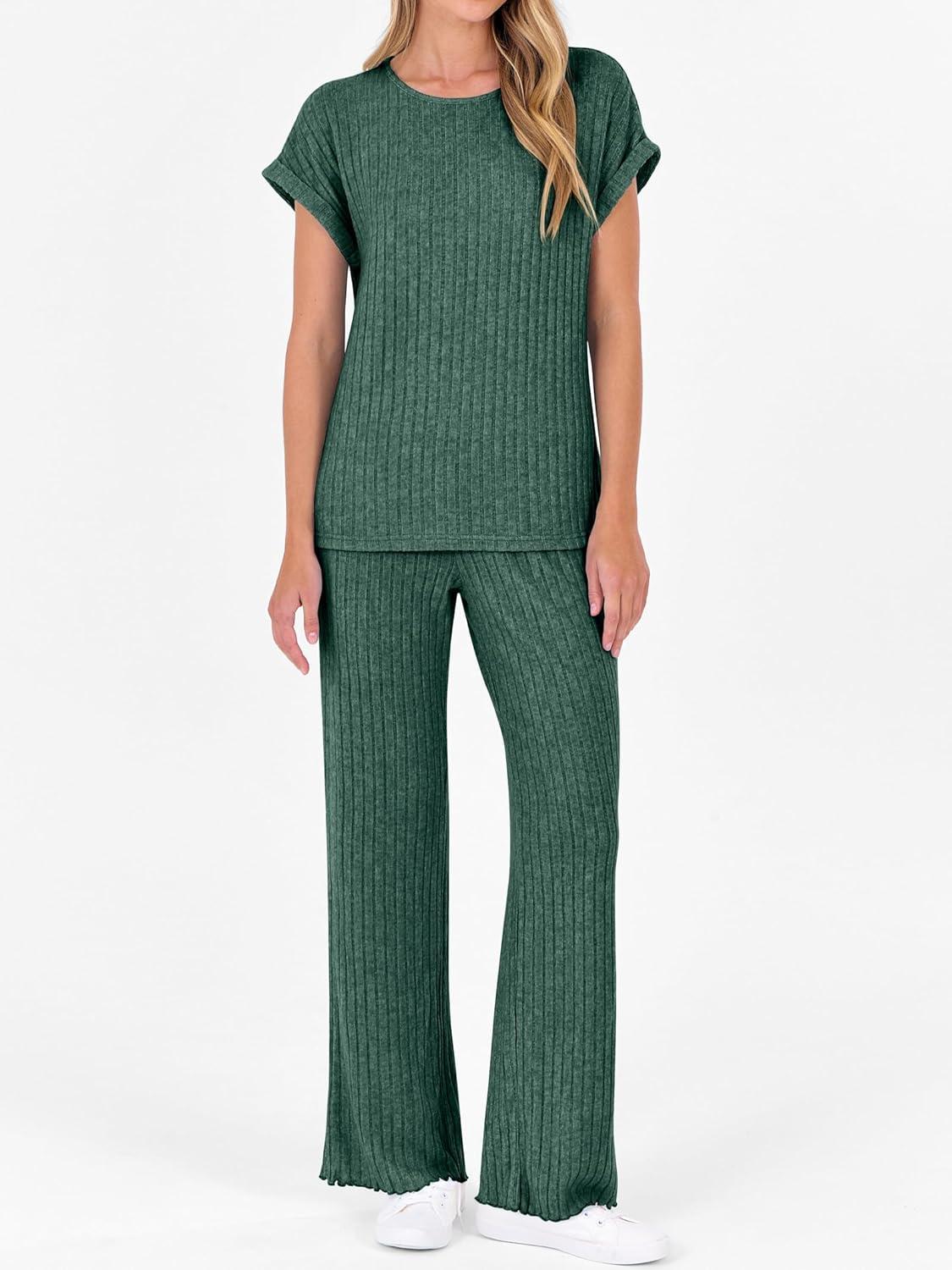 ANRABESS Lounge Sets For Women Fall Ribbed Knit 2 Piece Pajama Sets Casual Short Sleeve Top and Long Pants Matching Outfits(Green)