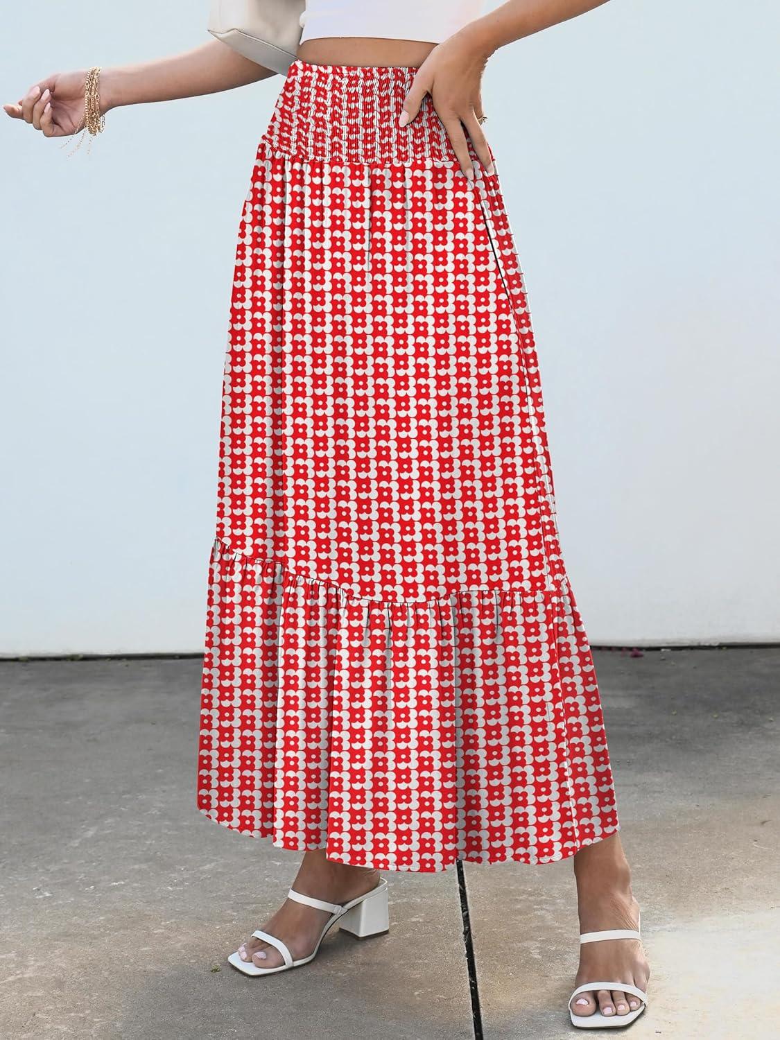 ANRABESS Maxi Skirts for Women 2025 Summer Boho Long Flowy Floral Elastic High Waist Skirt Casual Travel Skirt with Pockets(Red Floral)