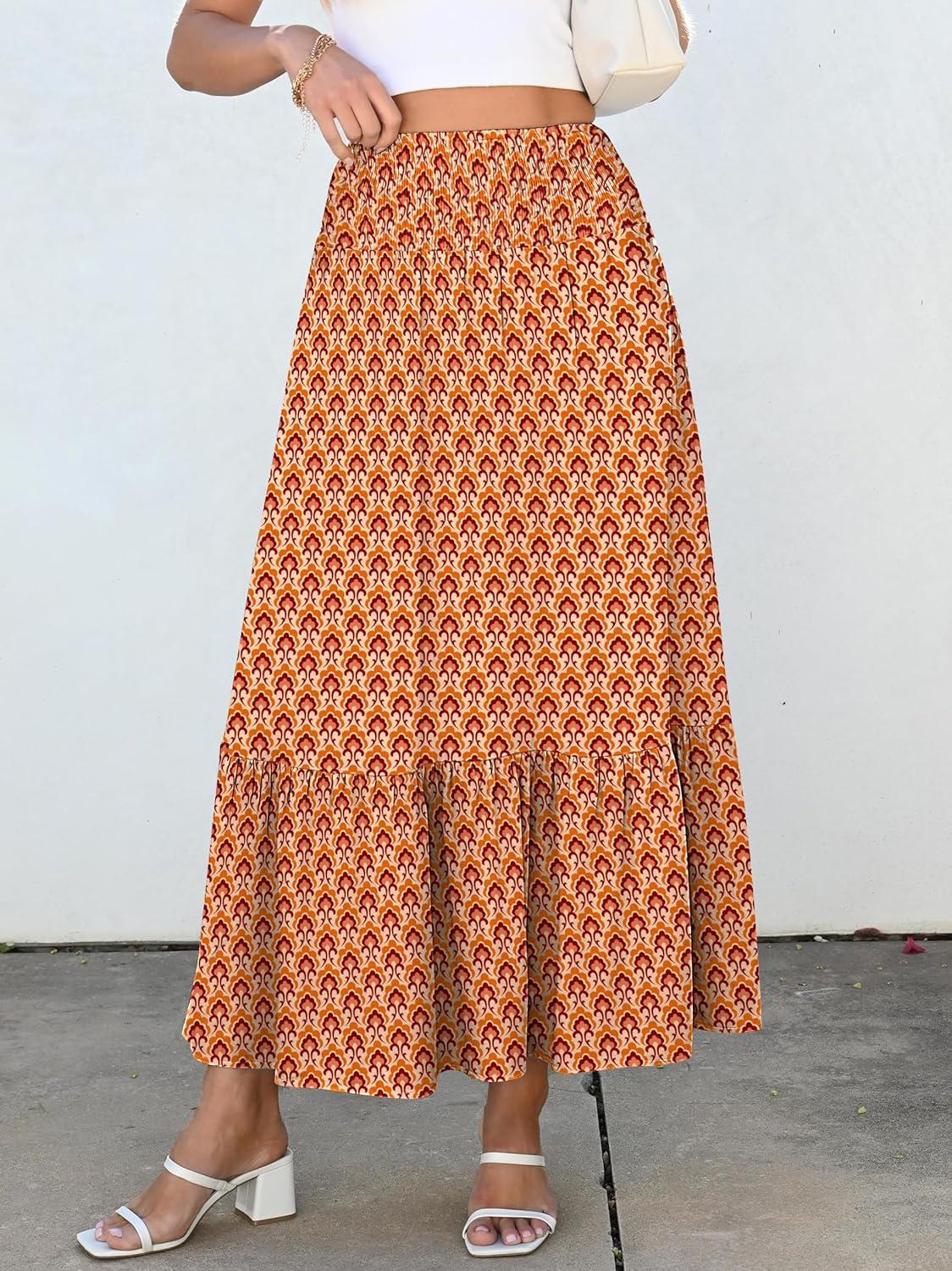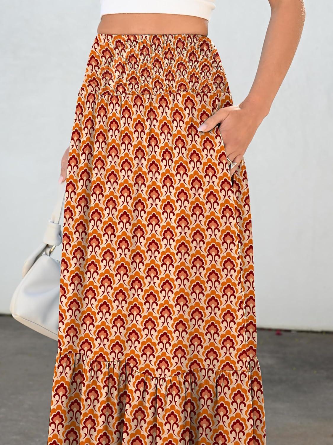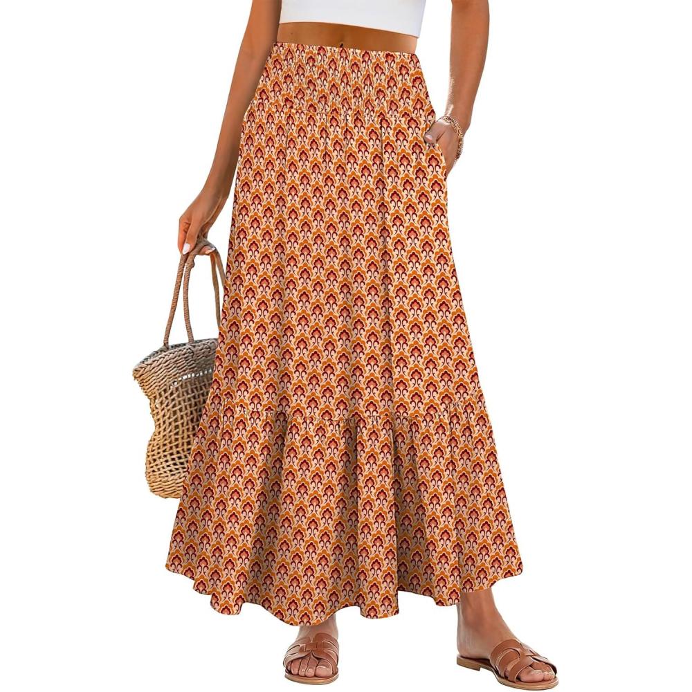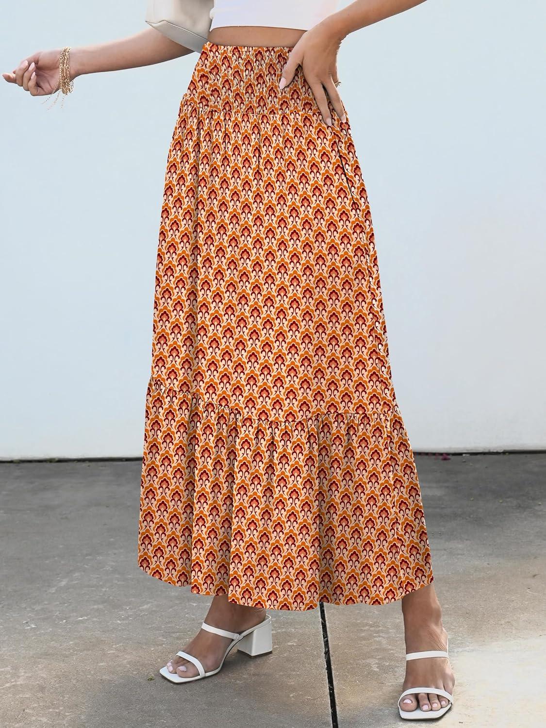 ANRABESS Maxi Skirts for Women 2026 Summer Boho Long Flowy Floral Elastic High Waist Skirt Casual Travel Skirt with Pockets(Orange)