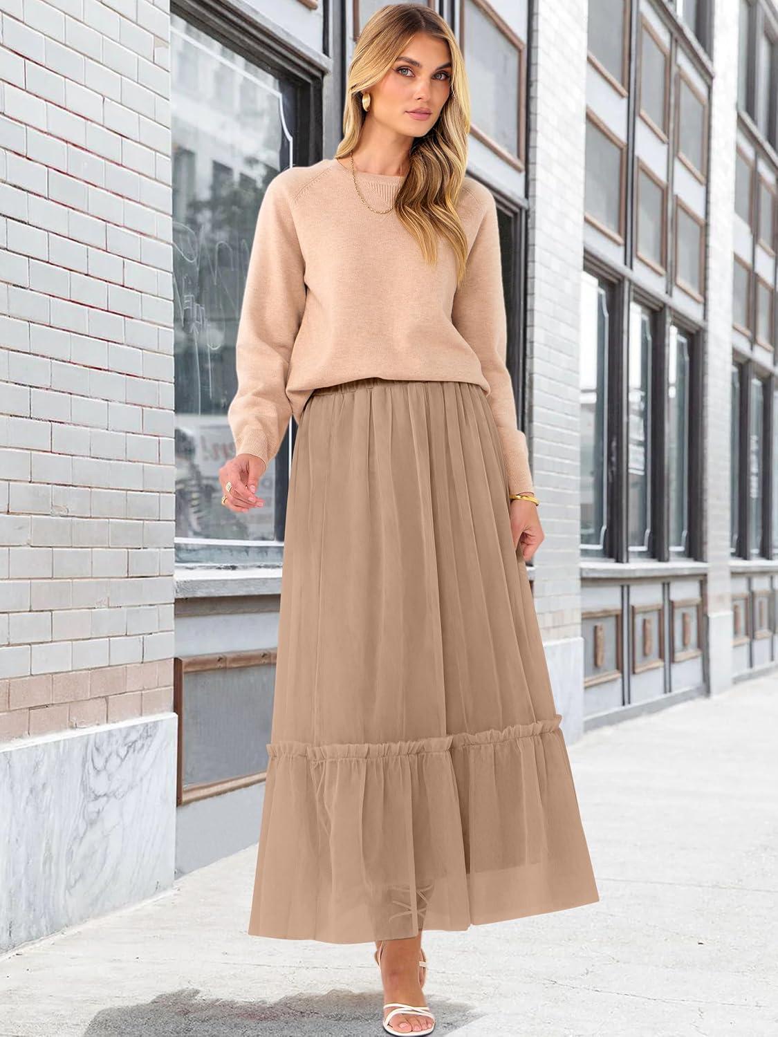ANRABESS Maxi Skirts for Women Tulle Long Tiered Elastic High Waisted A Line Flowy Dressy Casual Skirt 2025 Fall Trendy(Nutmeg)