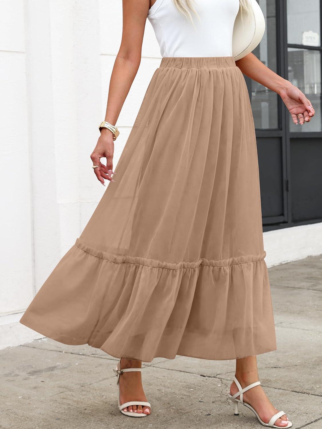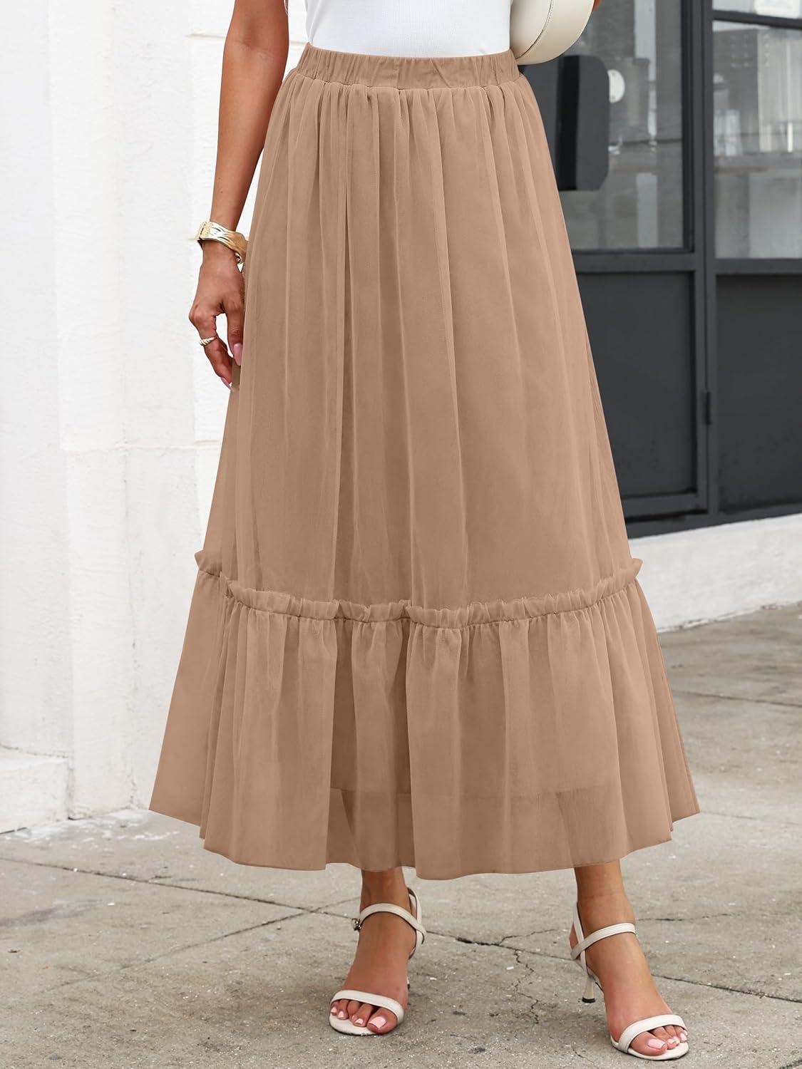 ANRABESS Maxi Skirts for Women Tulle Long Tiered Elastic High Waisted A Line Flowy Dressy Casual Skirt 2025 Fall Trendy(Light Tan)