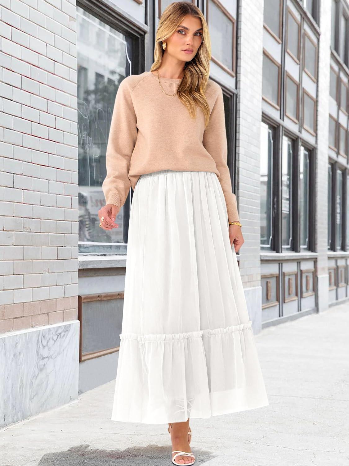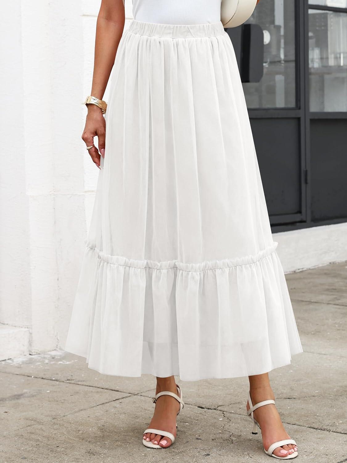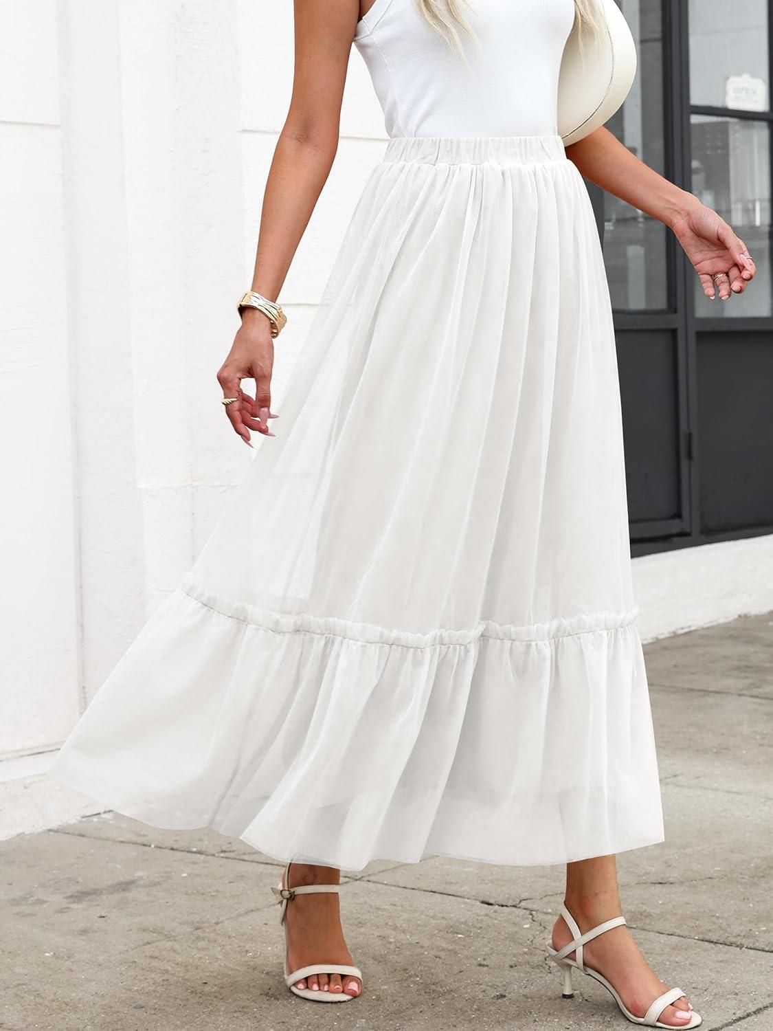 ANRABESS Maxi Skirts for Women Tulle Long Tiered Elastic High Waisted A Line Flowy Dressy Casual Skirt 2025 Fall Trendy(White)