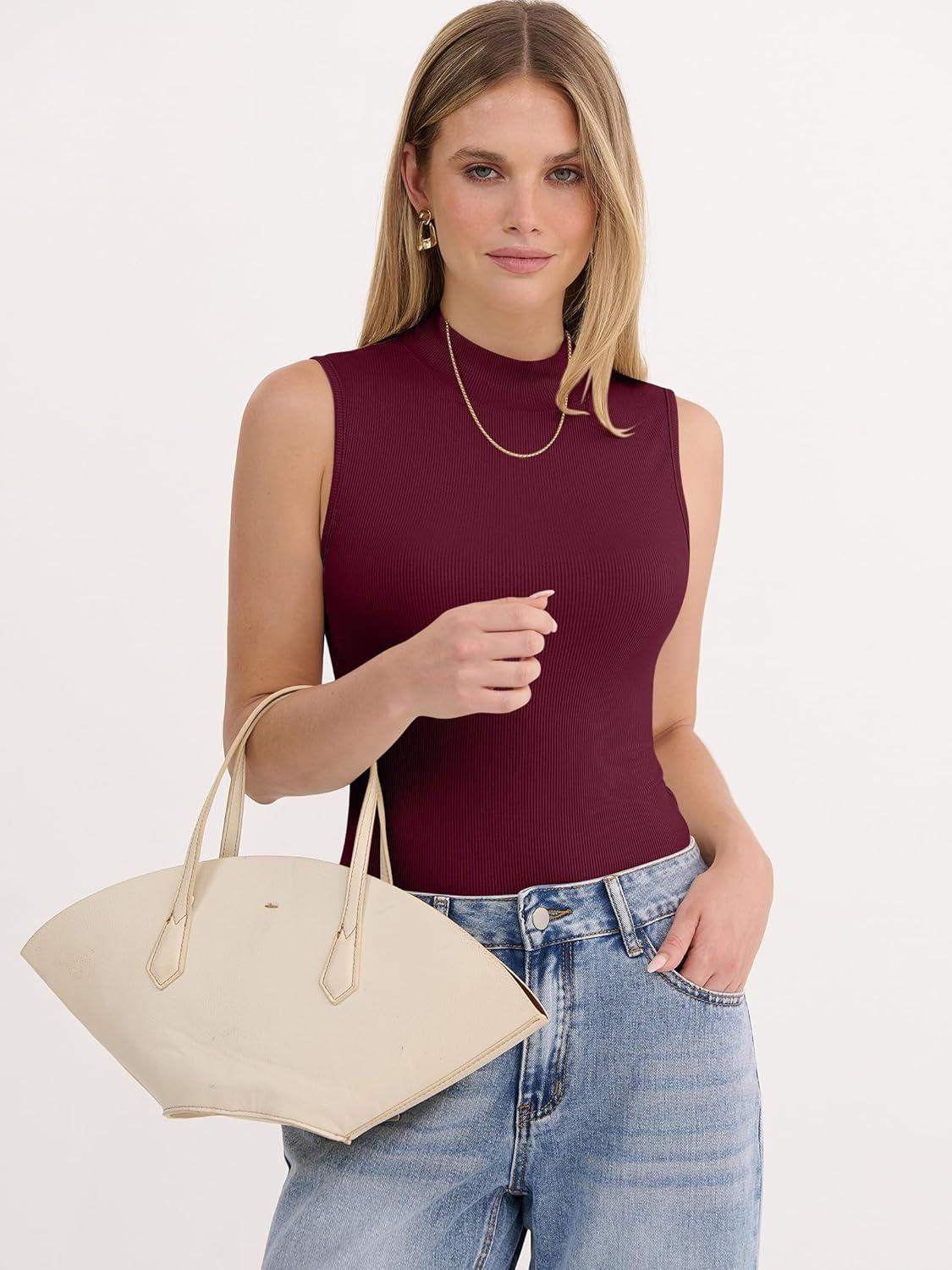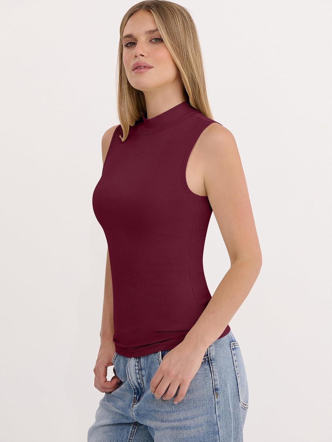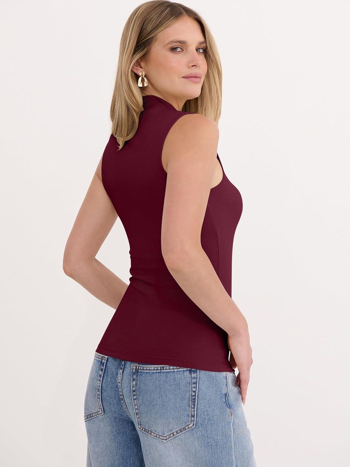 ANRABESS Mock Neck Tank Tops for Women Ribbed Knit Sleeveless Top Slim Fit 2026 Summer Casual Basic Layer Shirts(Deep Red)