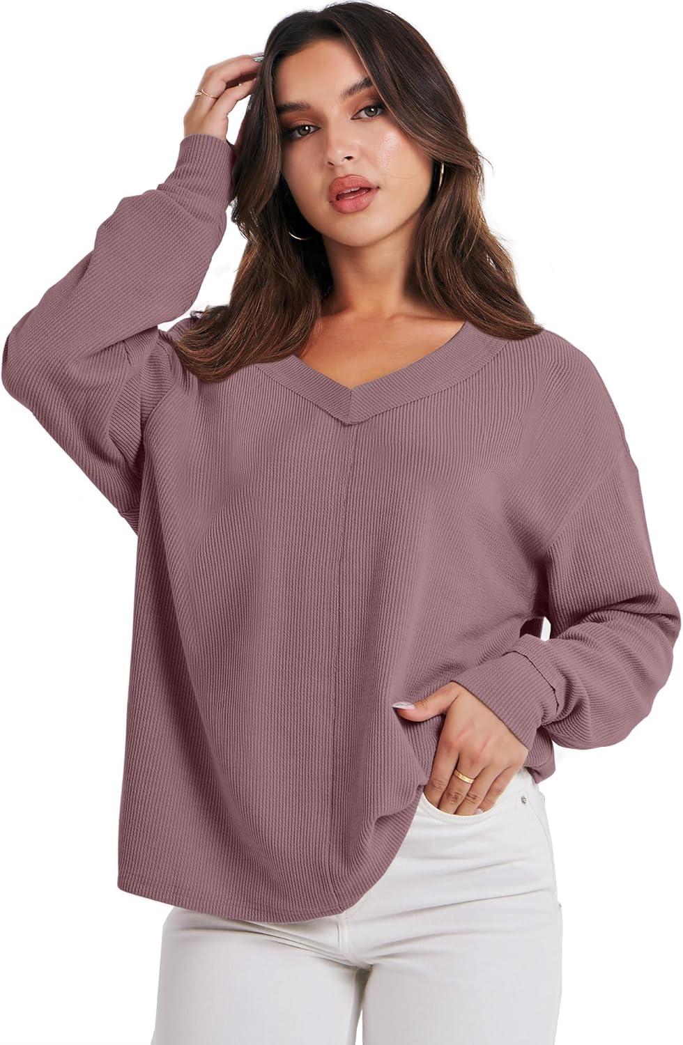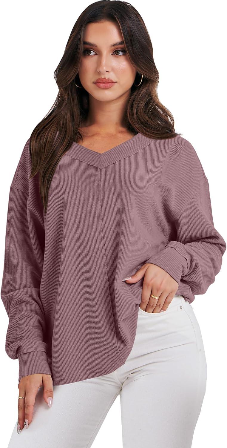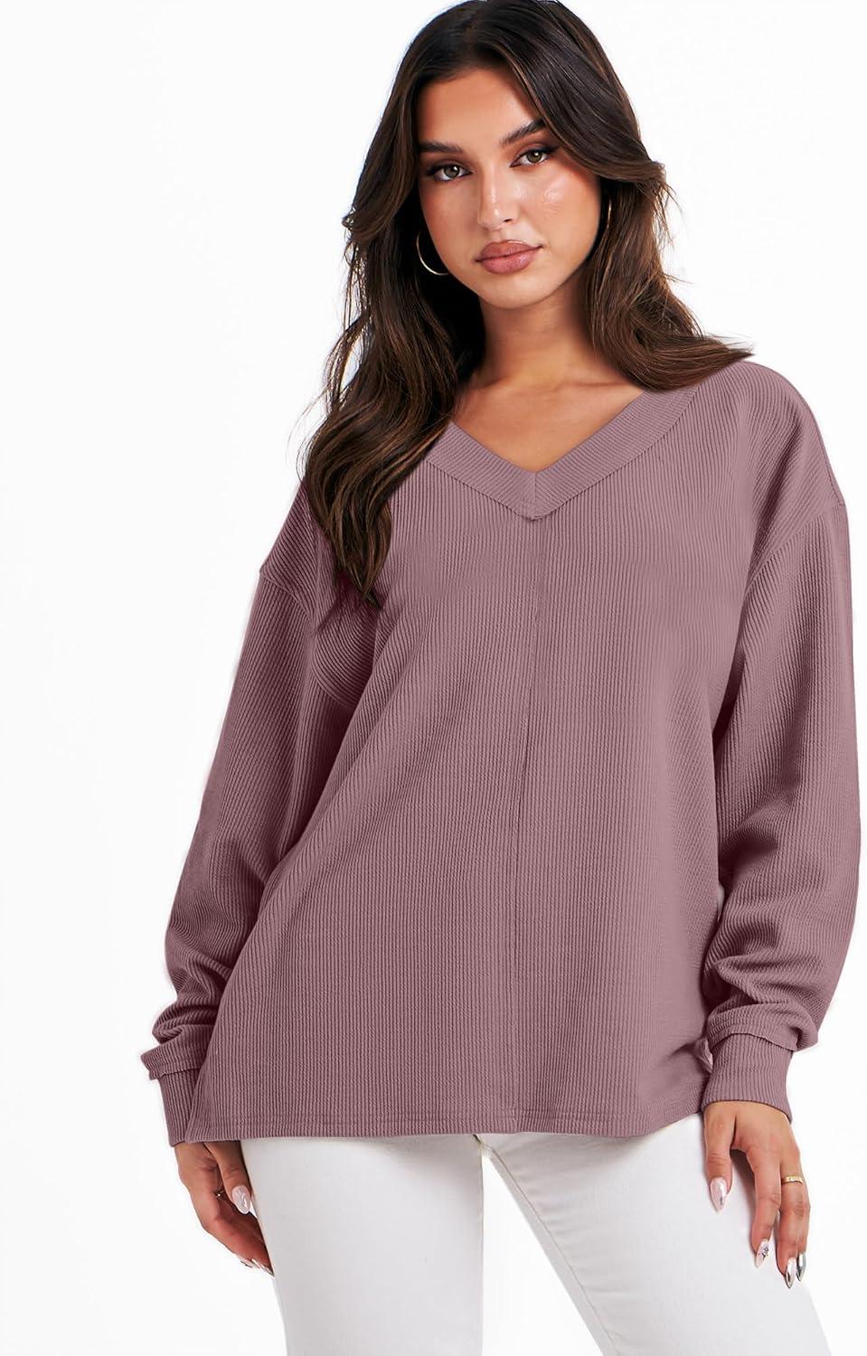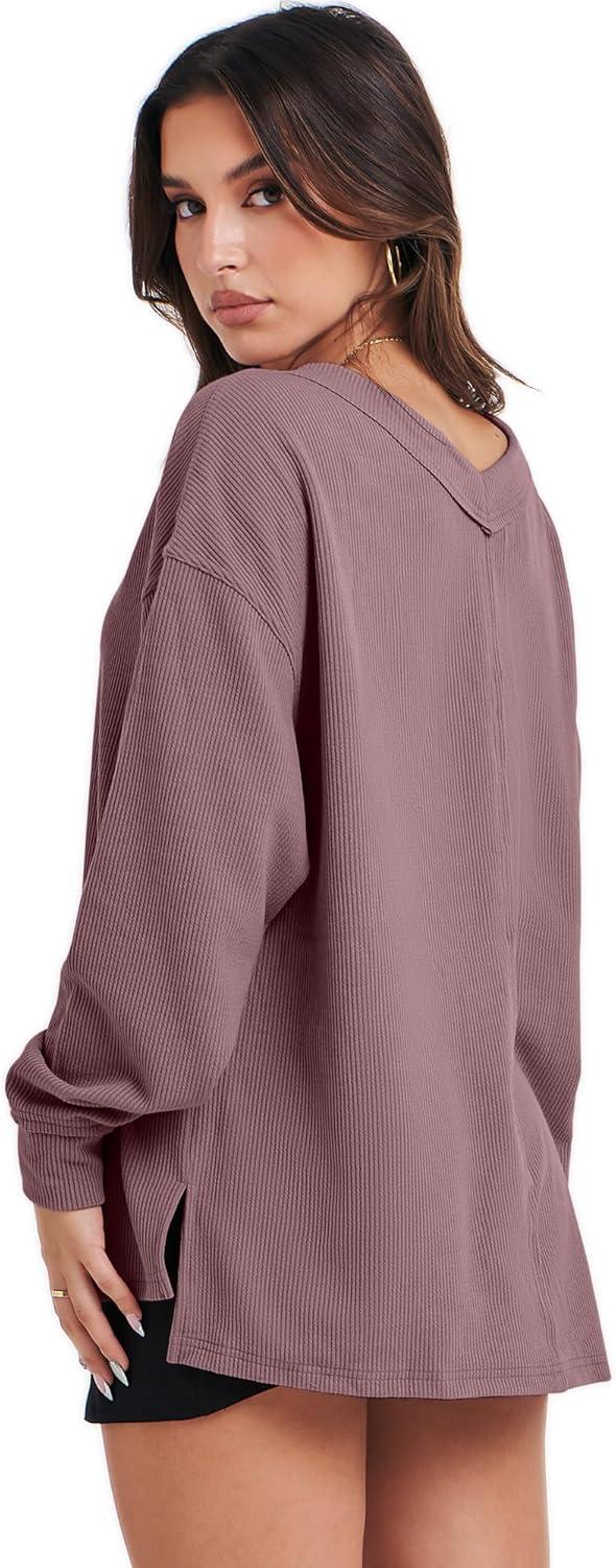 imageANRABESS Oversized Long Sleeve Shirts for Women Off the Shoulder Sweatshirt Loose V Neck Tunic Tops High Low Sweater 2025Pink