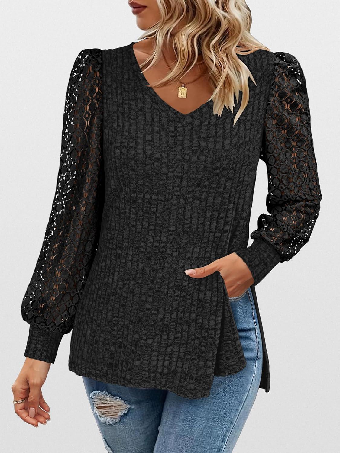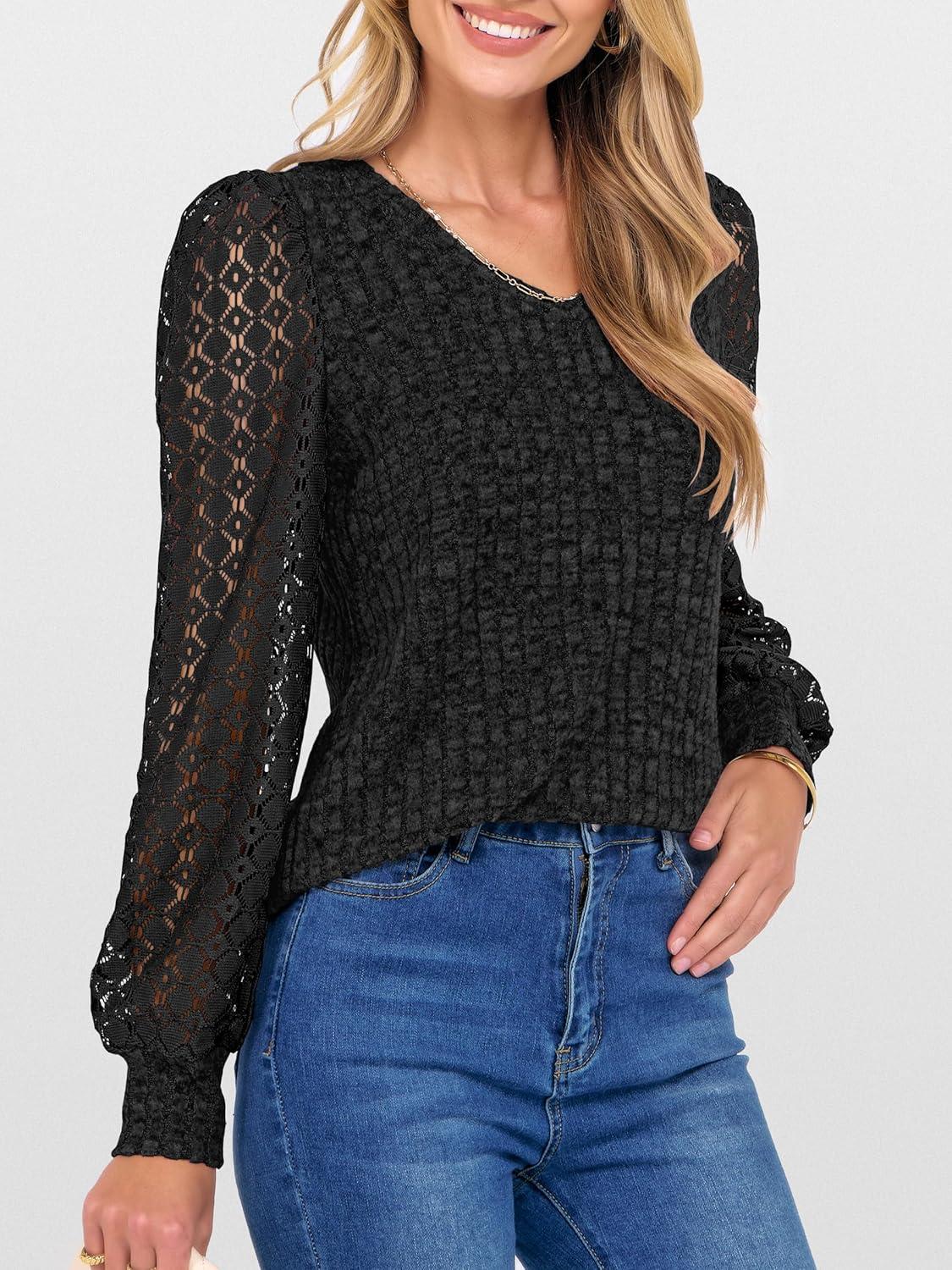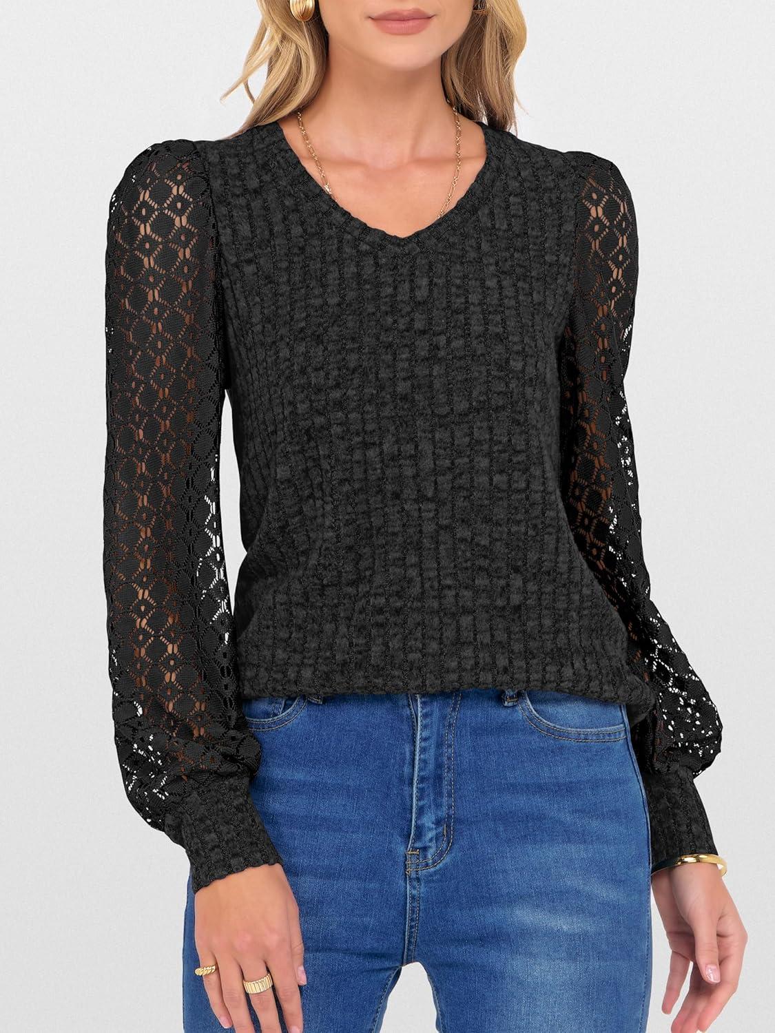 ANRABESS Shirts for Women Lace Long Sleeve V Neck Tunic Tops Casual Loose Fit Blouses Lightweight Sweaters 2025 Fall Clothes(Black)