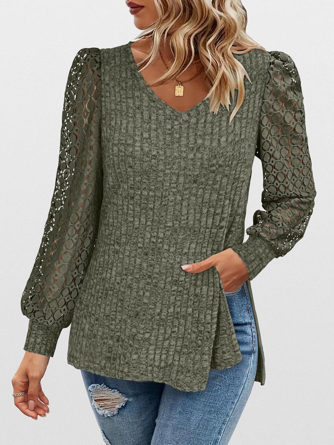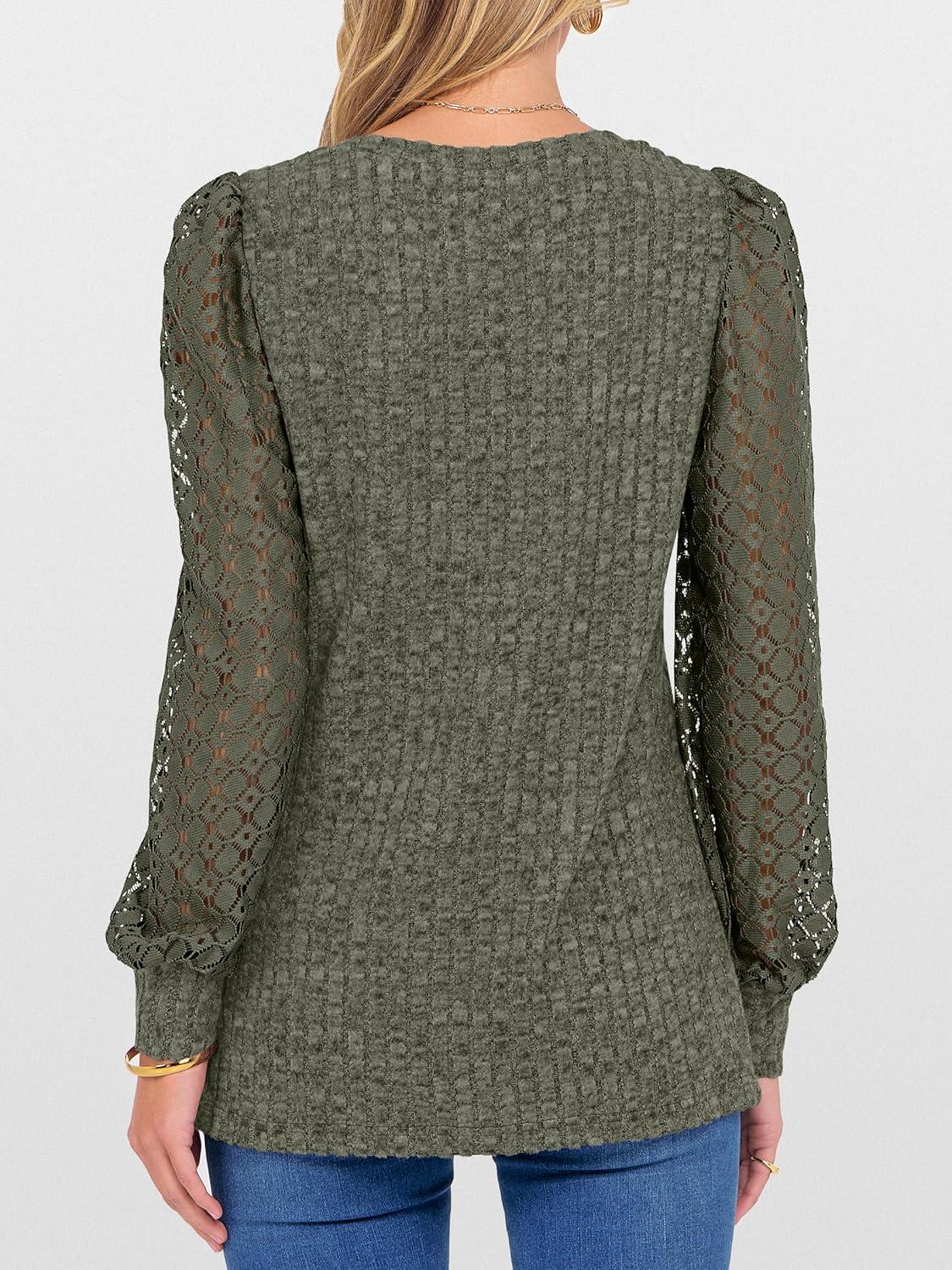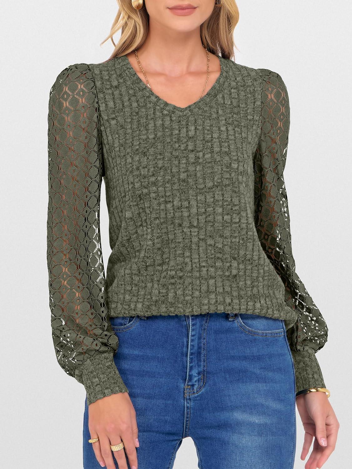ANRABESS Shirts for Women Lace Long Sleeve V Neck Tunic Tops Casual Loose Fit Blouses Lightweight Sweaters 2025 Fall Clothes(Deep Green)