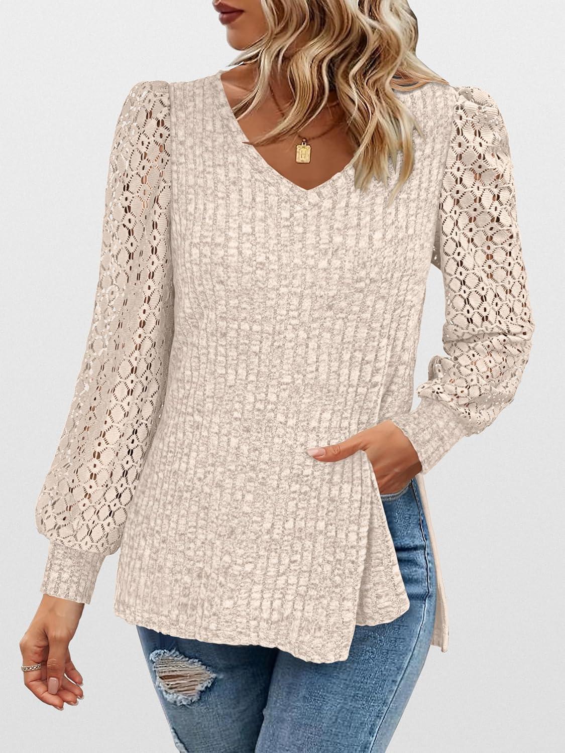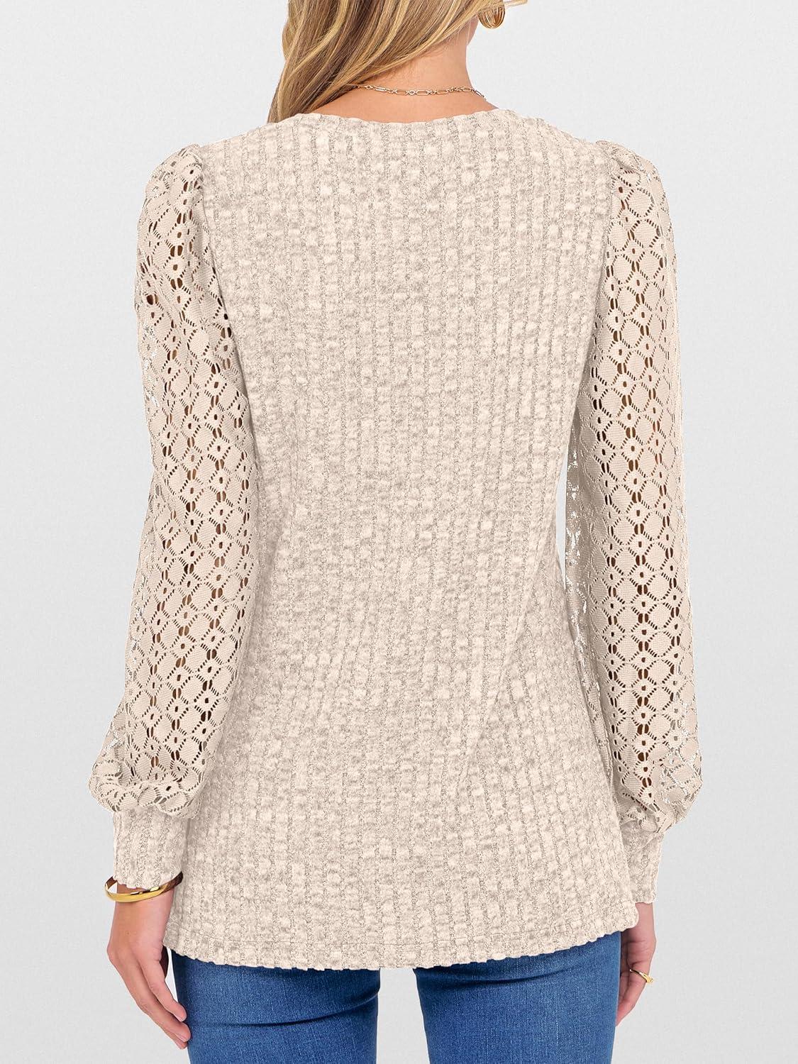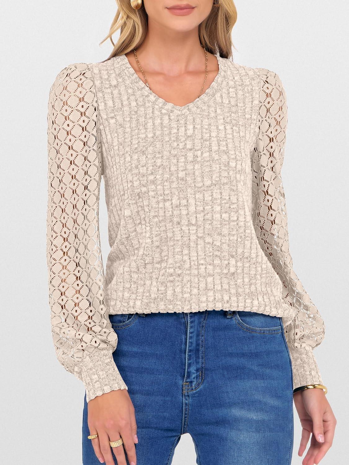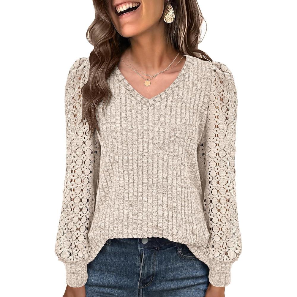 ANRABESS Shirts for Women Lace Long Sleeve V Neck Tunic Tops Casual Loose Fit Blouses Lightweight Sweaters 2025 Fall Clothes(Light Khaki)