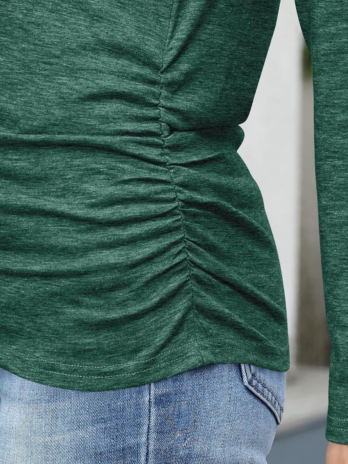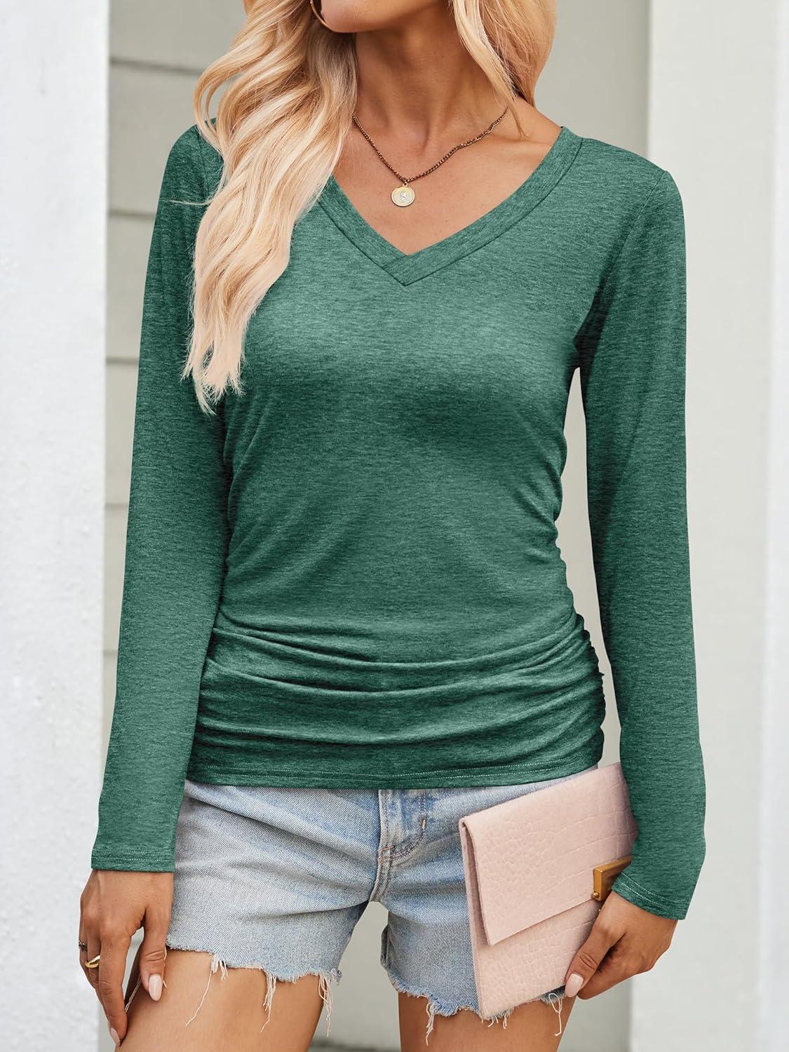 ANRABESS Shirts for Women Long Sleeve V Neck Tops Dressy Business Casual Side Ruched T-Shirts 2025 Fall Tee Blouses Outfits(Forest Green)