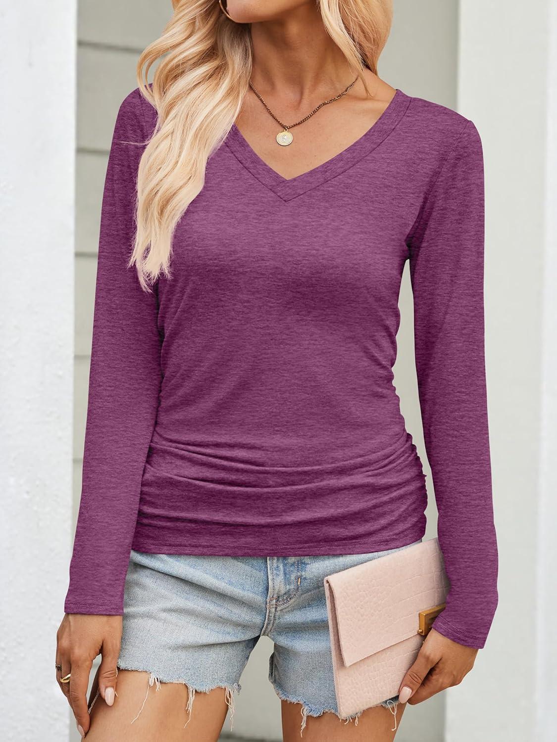 imageANRABESS Shirts for Women Long Sleeve V Neck Tops Dressy Business Casual Side Ruched TShirts 2025 Fall Tee Blouses OutfitsFuchsia