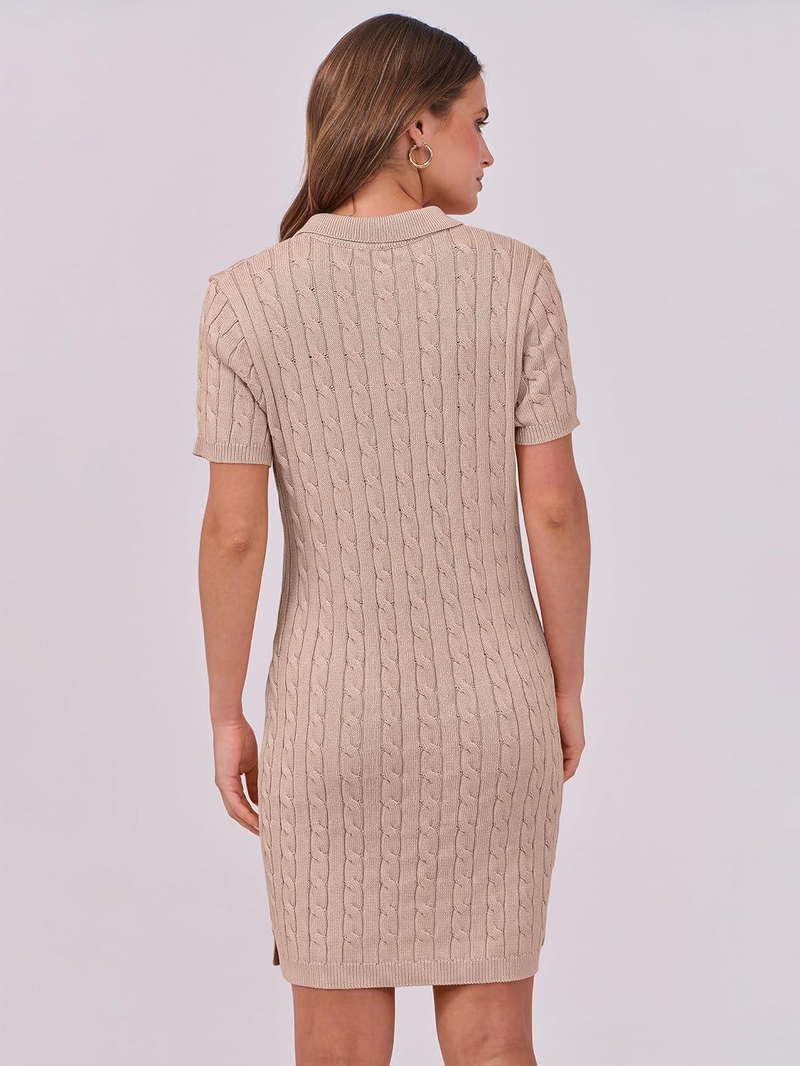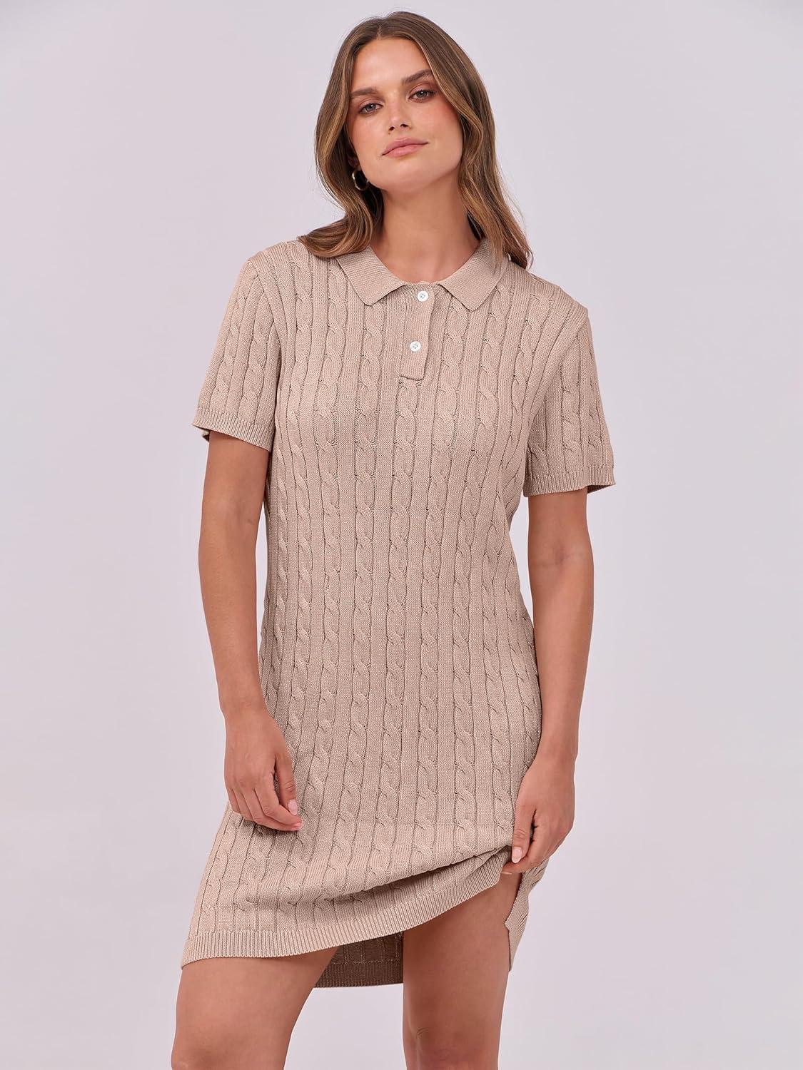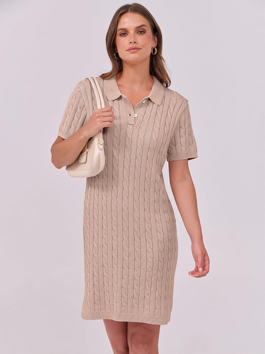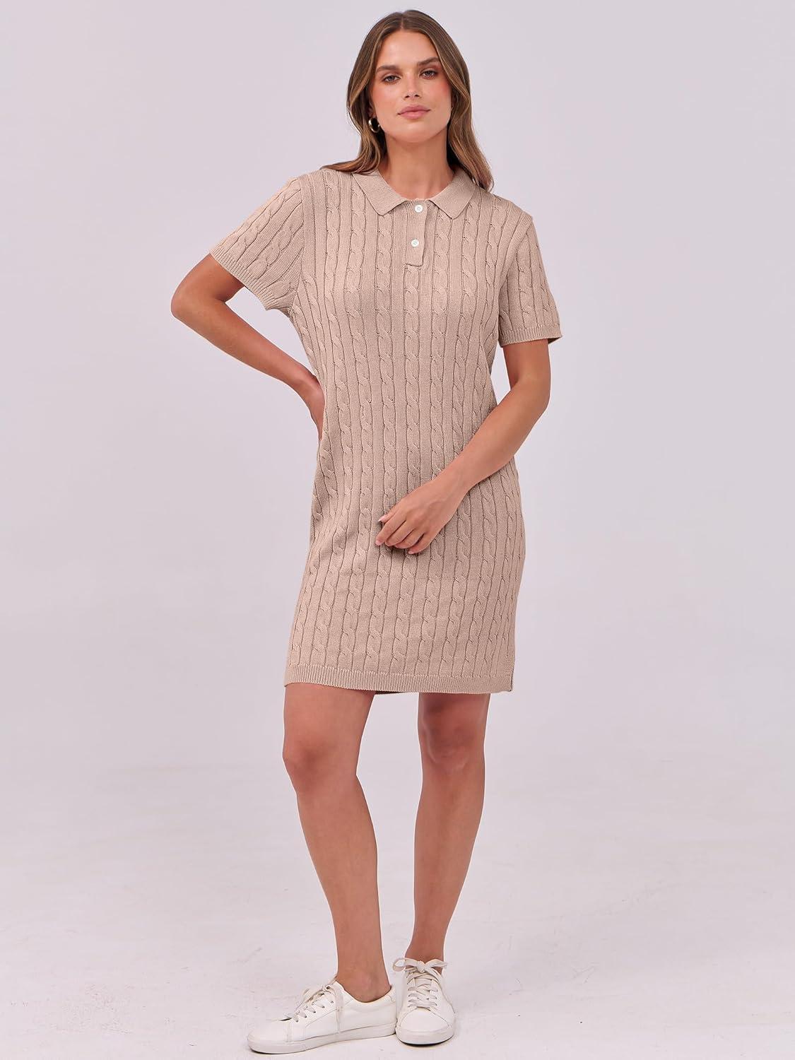 ANRABESS Short Sleeve Sweater Dress for Women Summer Casual V Neck Cable Knit Mini Polo Dresses 2025 Trendy(Khaki)