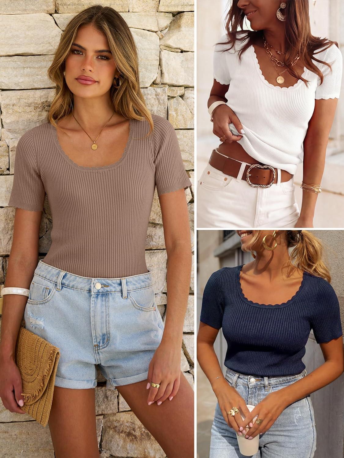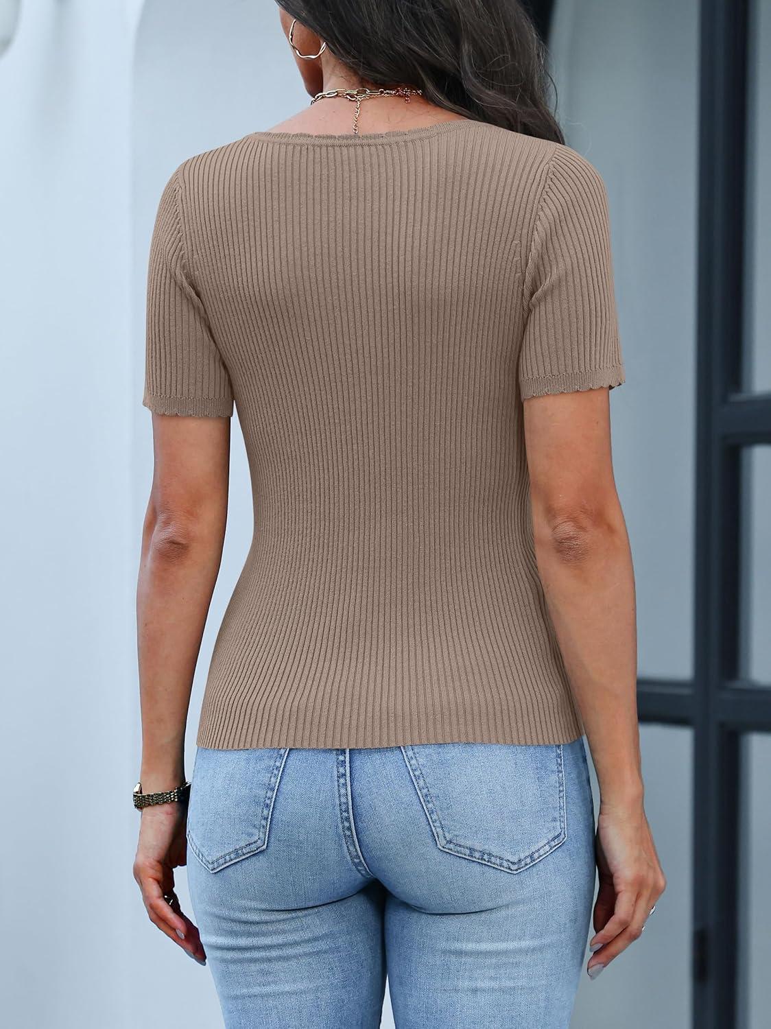 ANRABESS Short Sleeve Sweater for Women Scoop Neck Casual Lightweight Ribbed Knit Pullover Tops 2026 Spring Summer Outfits(Khaki)