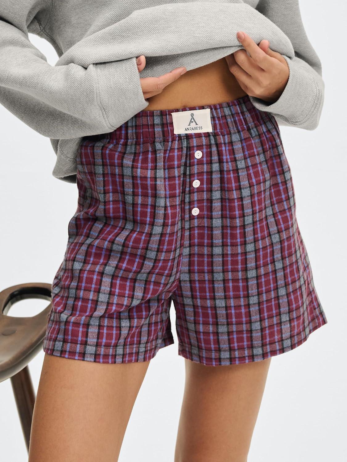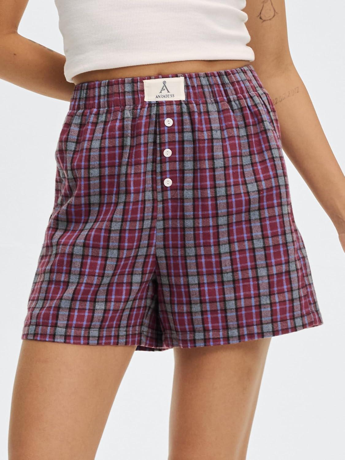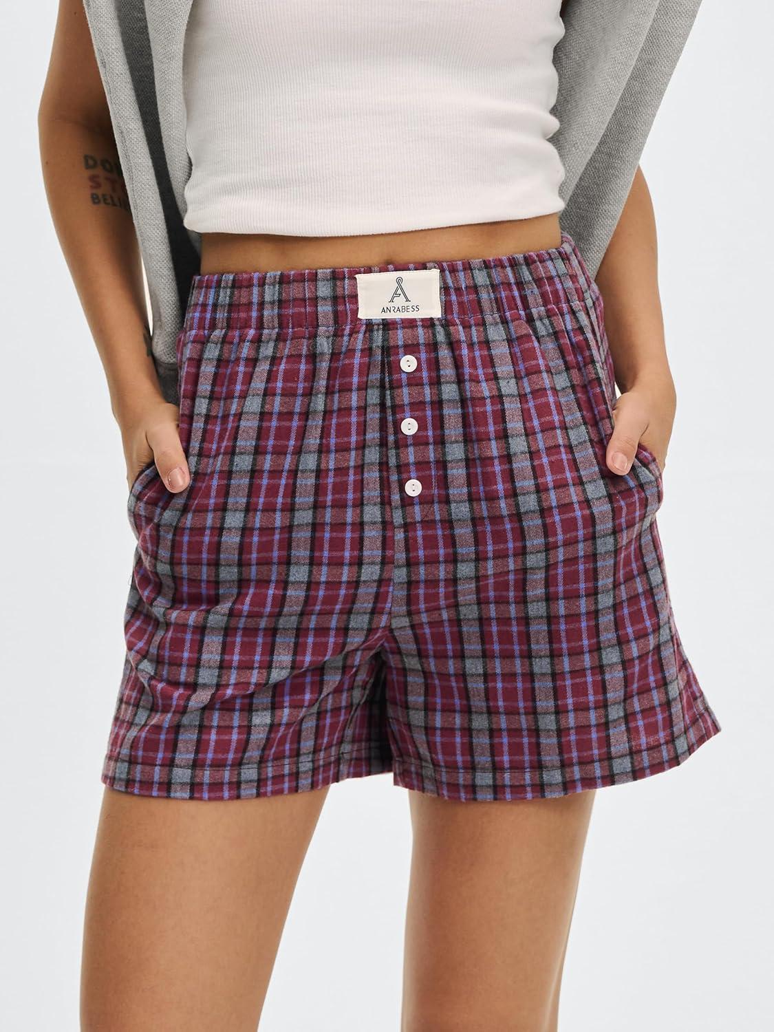 ANRABESS Shorts for Women 2026 Summer Casual Lounge Pajama Sleep Gingham Boxer Shorts Soft Comfy Beach Pj Bottoms Pockets(Red Grey Plaid)
