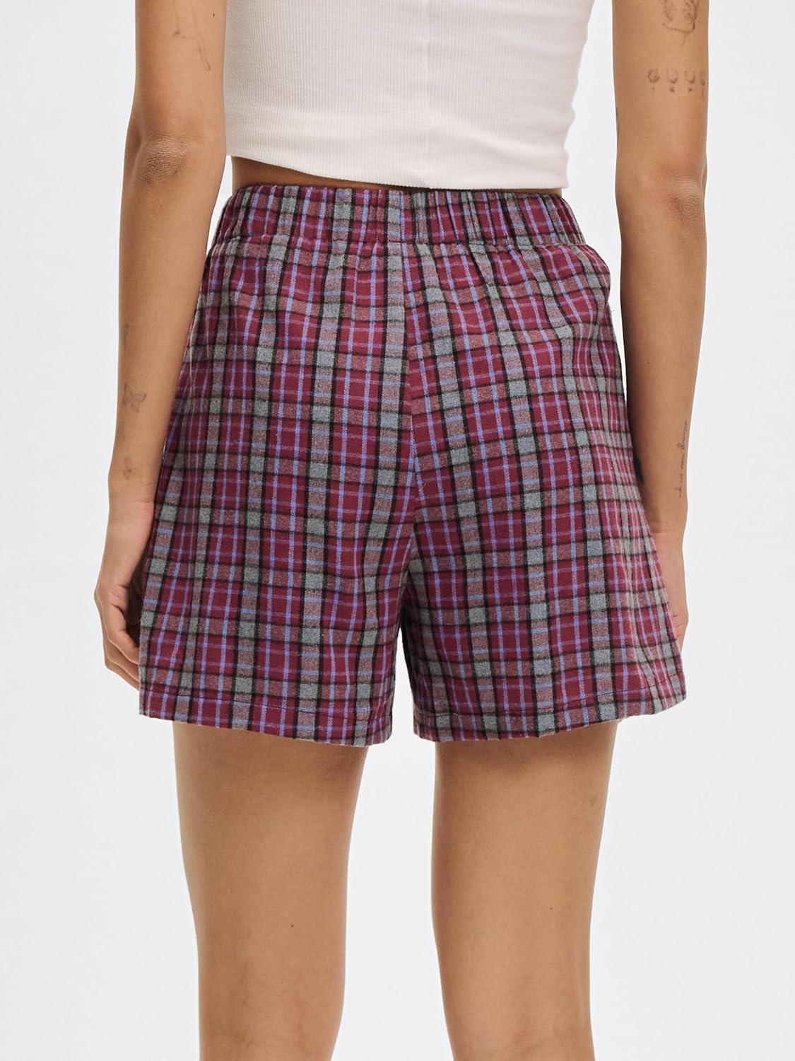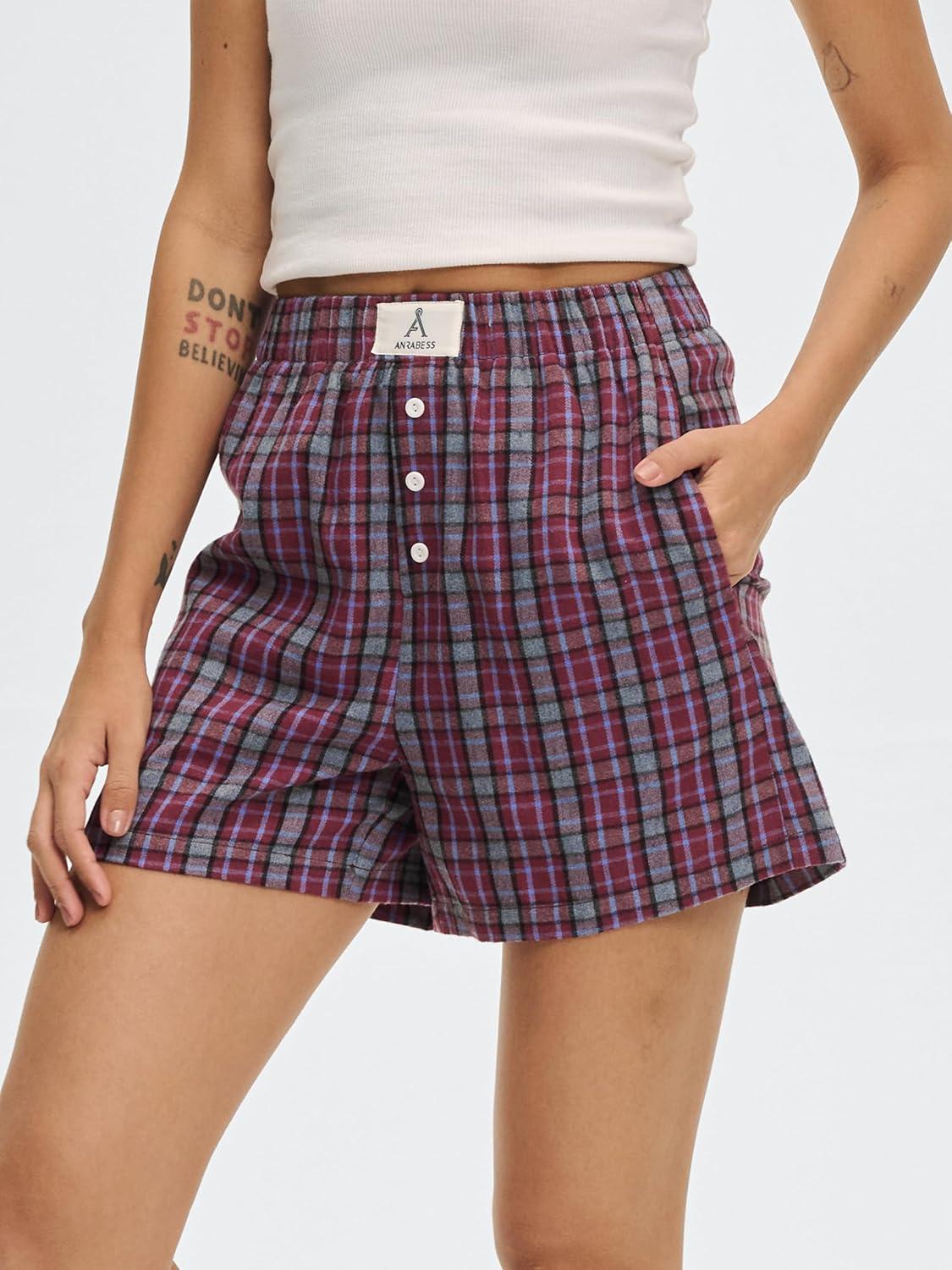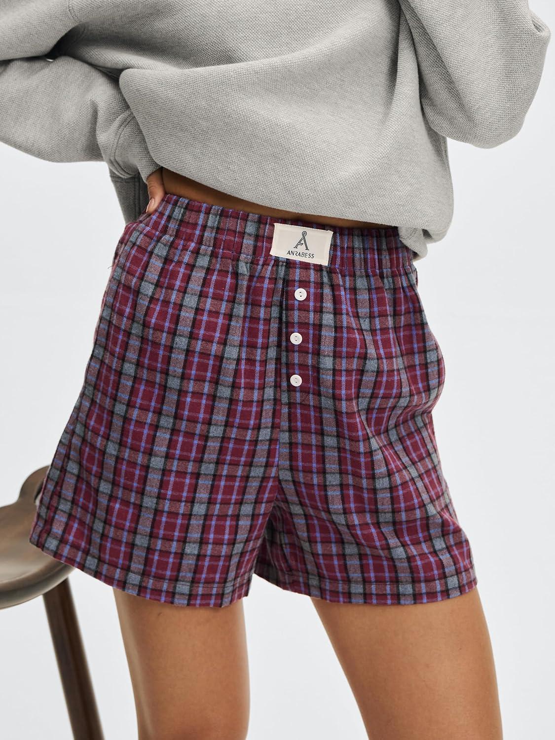 ANRABESS Shorts for Women 2026 Summer Casual Lounge Pajama Sleep Gingham Boxer Shorts Soft Comfy Beach Pj Bottoms Pockets(Red Grey Plaid)