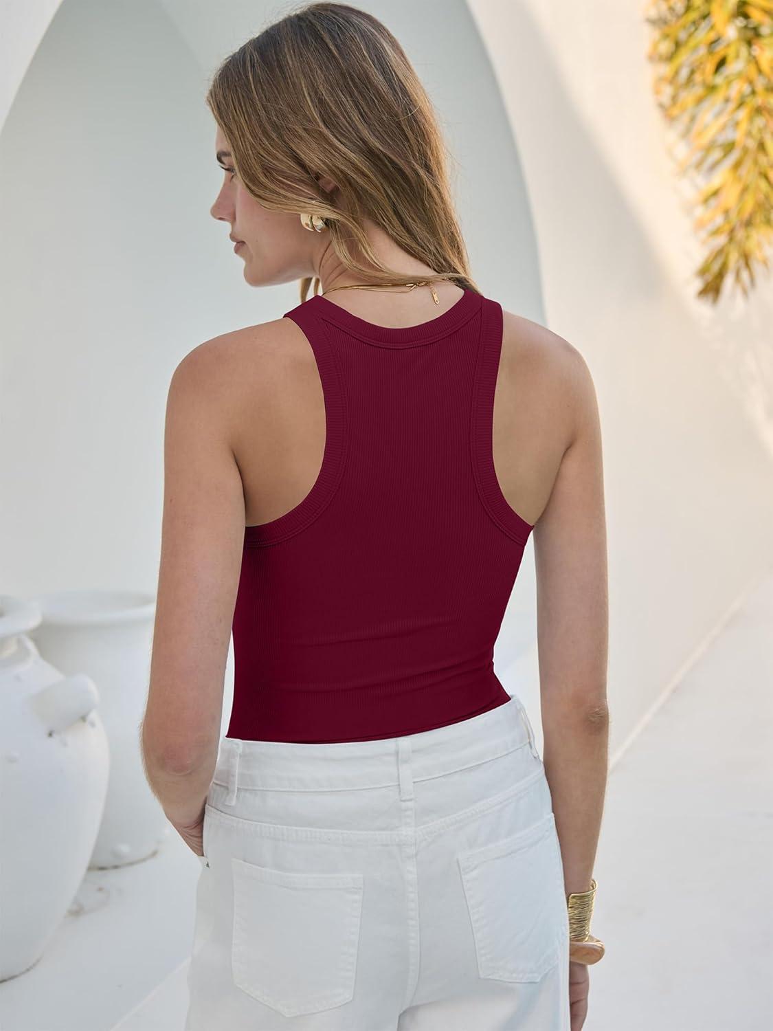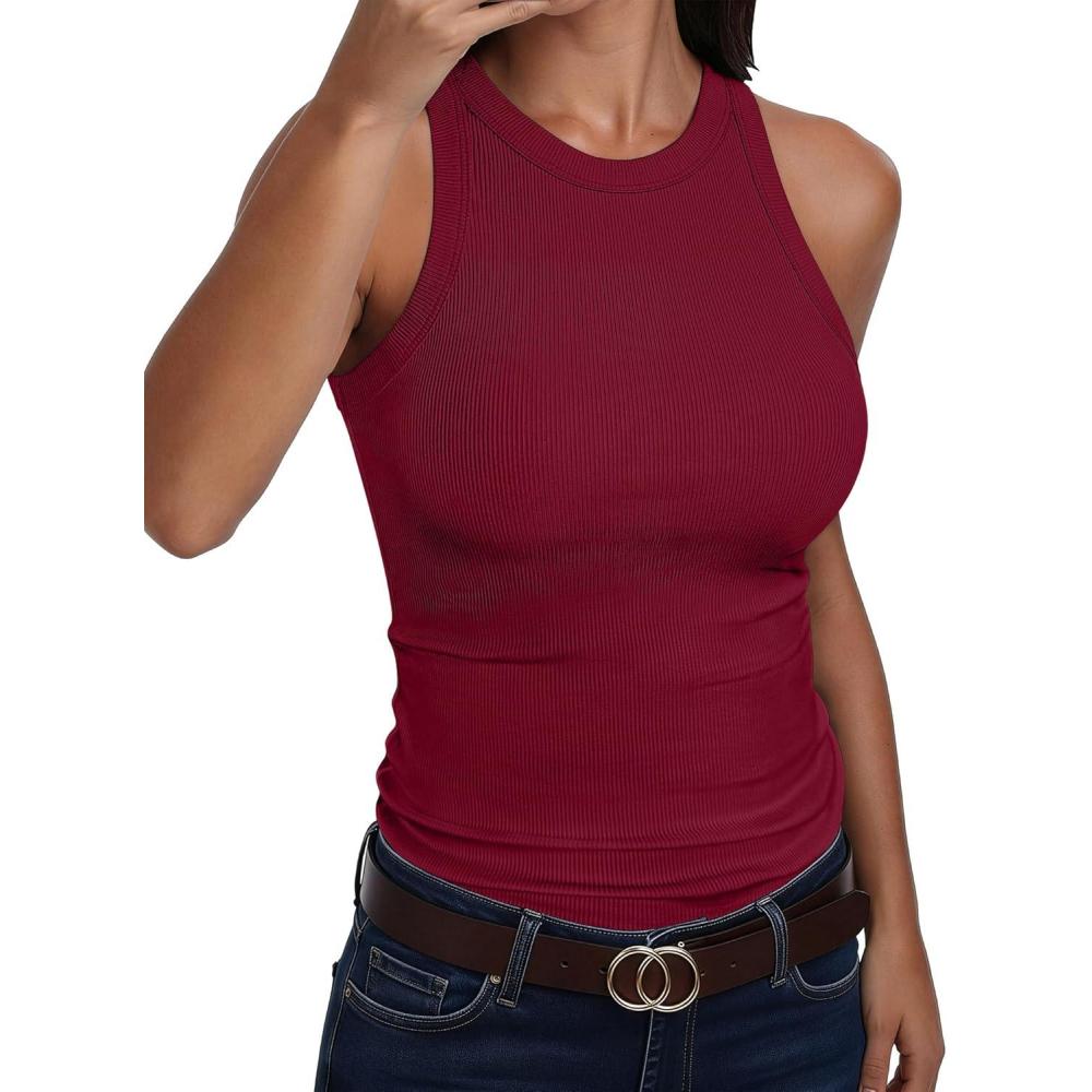 ANRABESS Sleeveless Tank Tops for Women High Neck Racerback Ribbed Knit Top Summer 2026 Casual Basic Slim Fit Workout Shirts(Deep Red)
