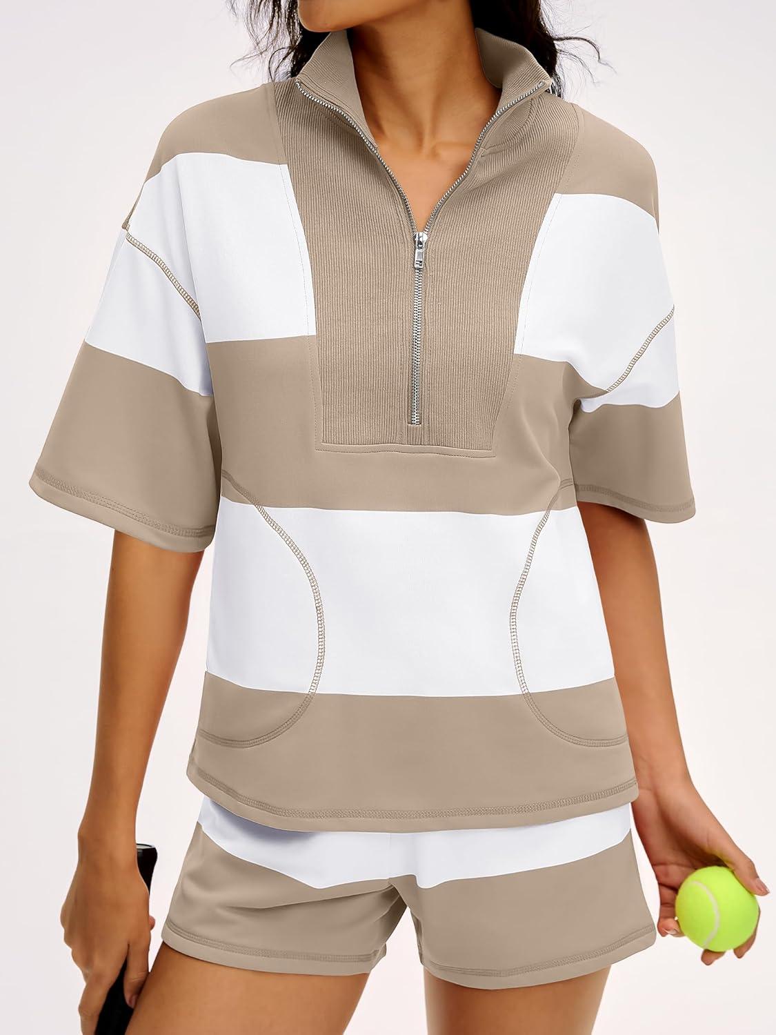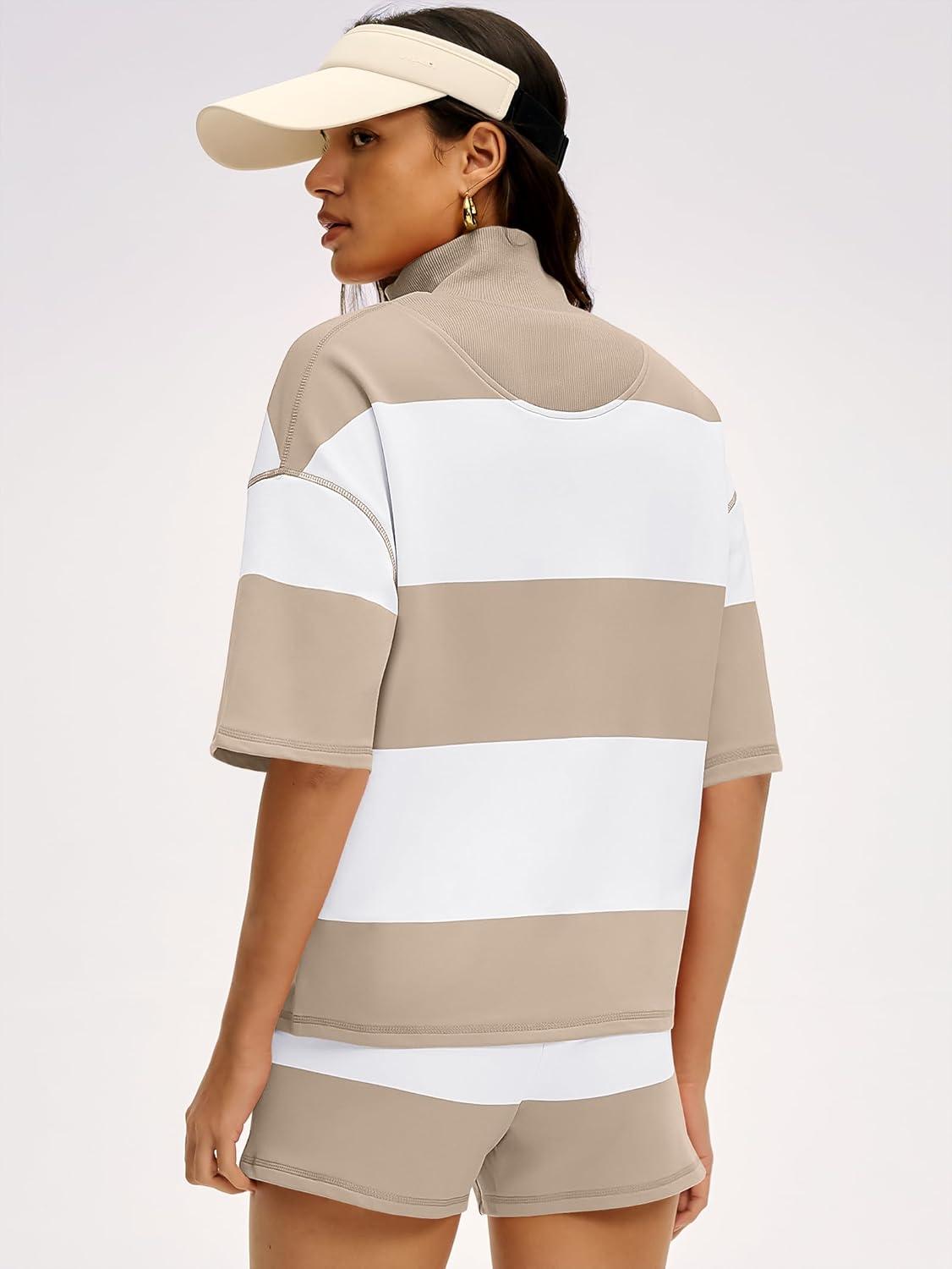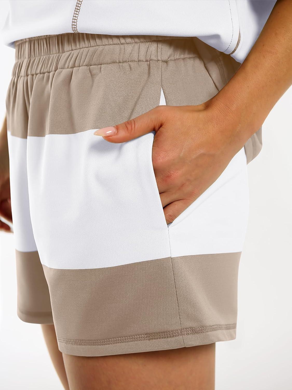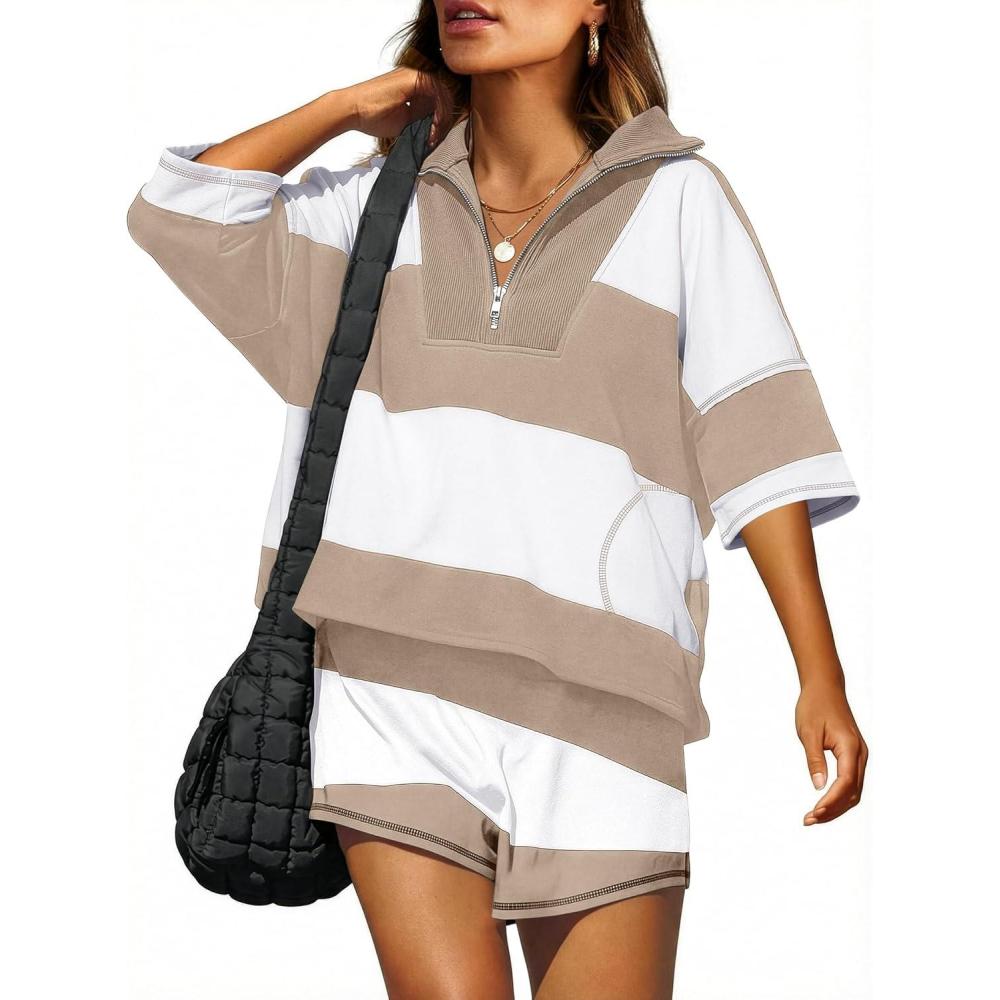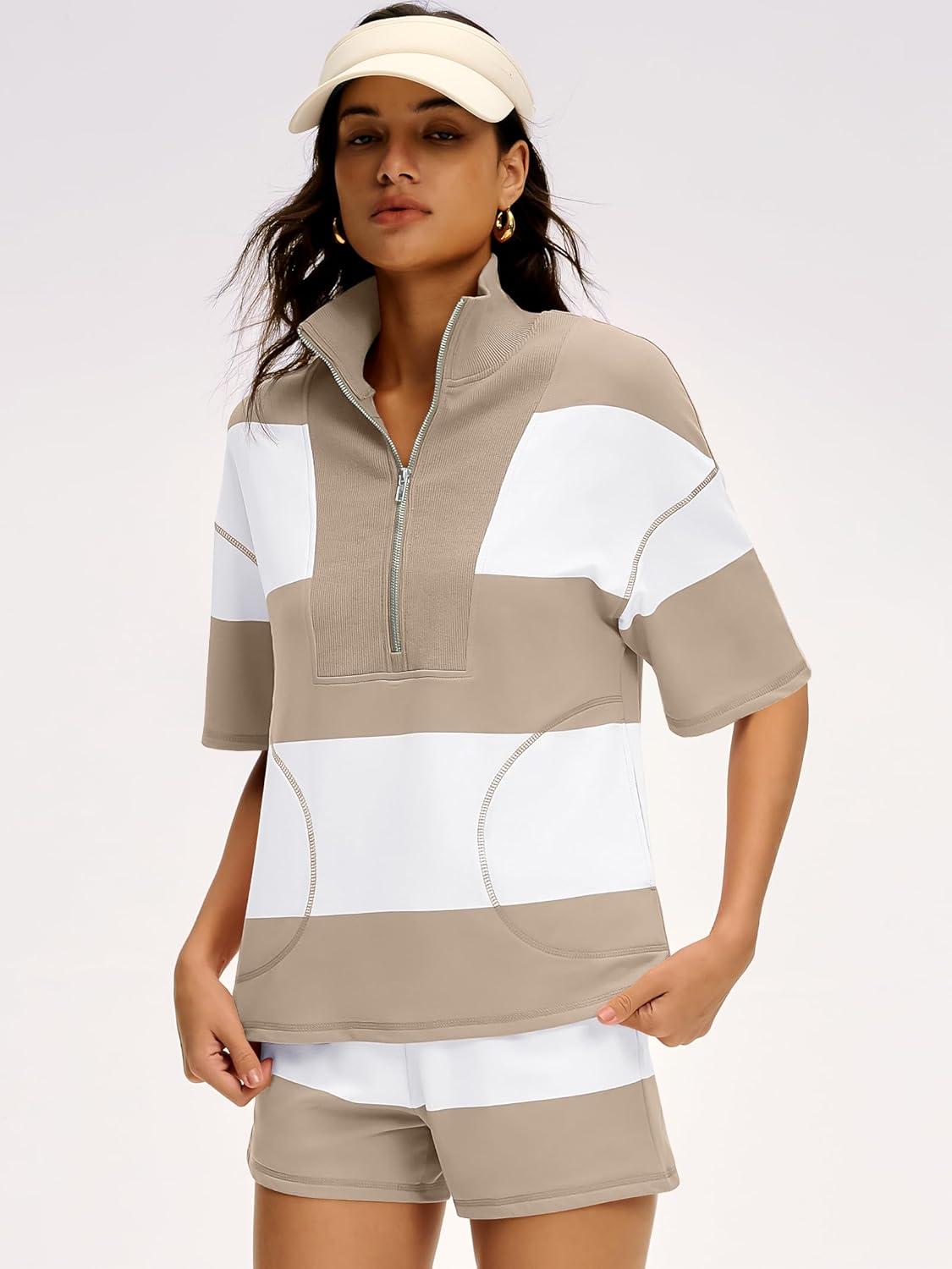ANRABESS Striped Short Sets for Women 2 Piece Outfits Summer Casual Oversized Workout Athletisure Travel Lounge Matching Sets(Light Khaki White)