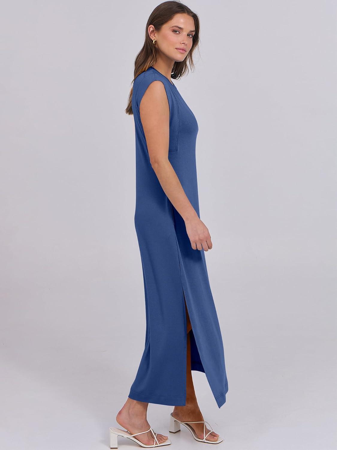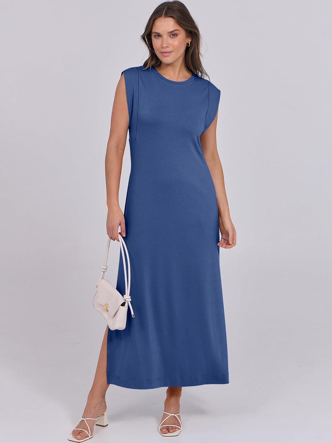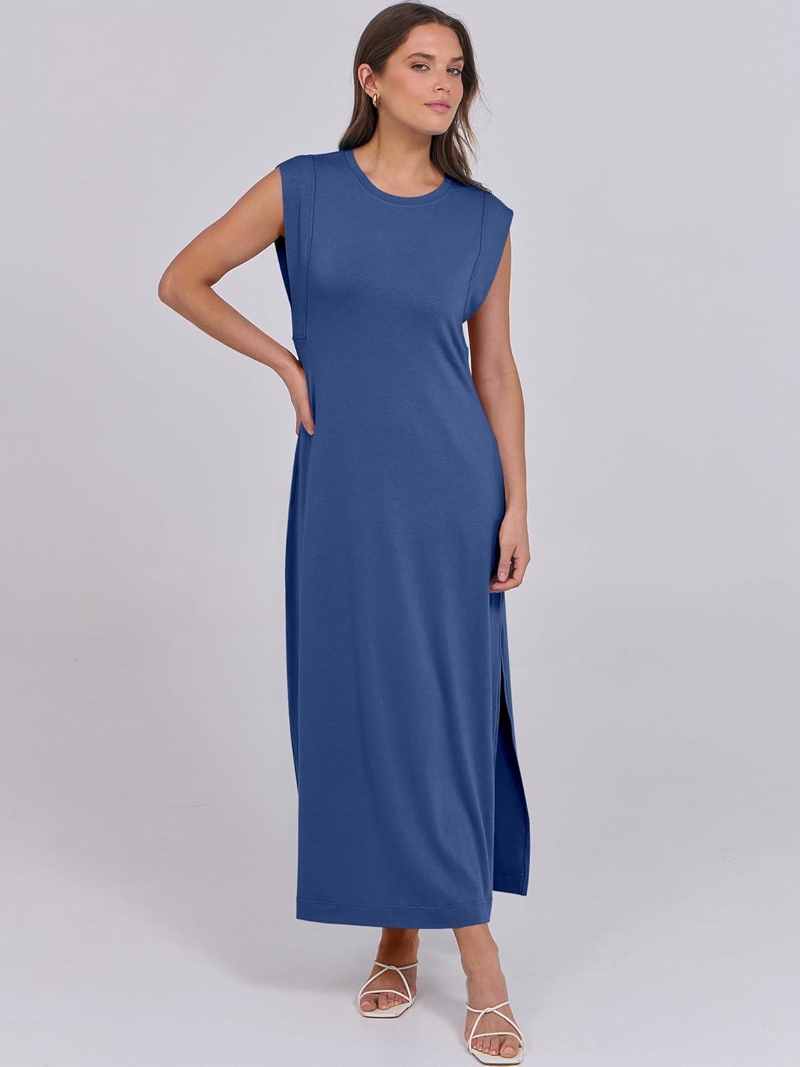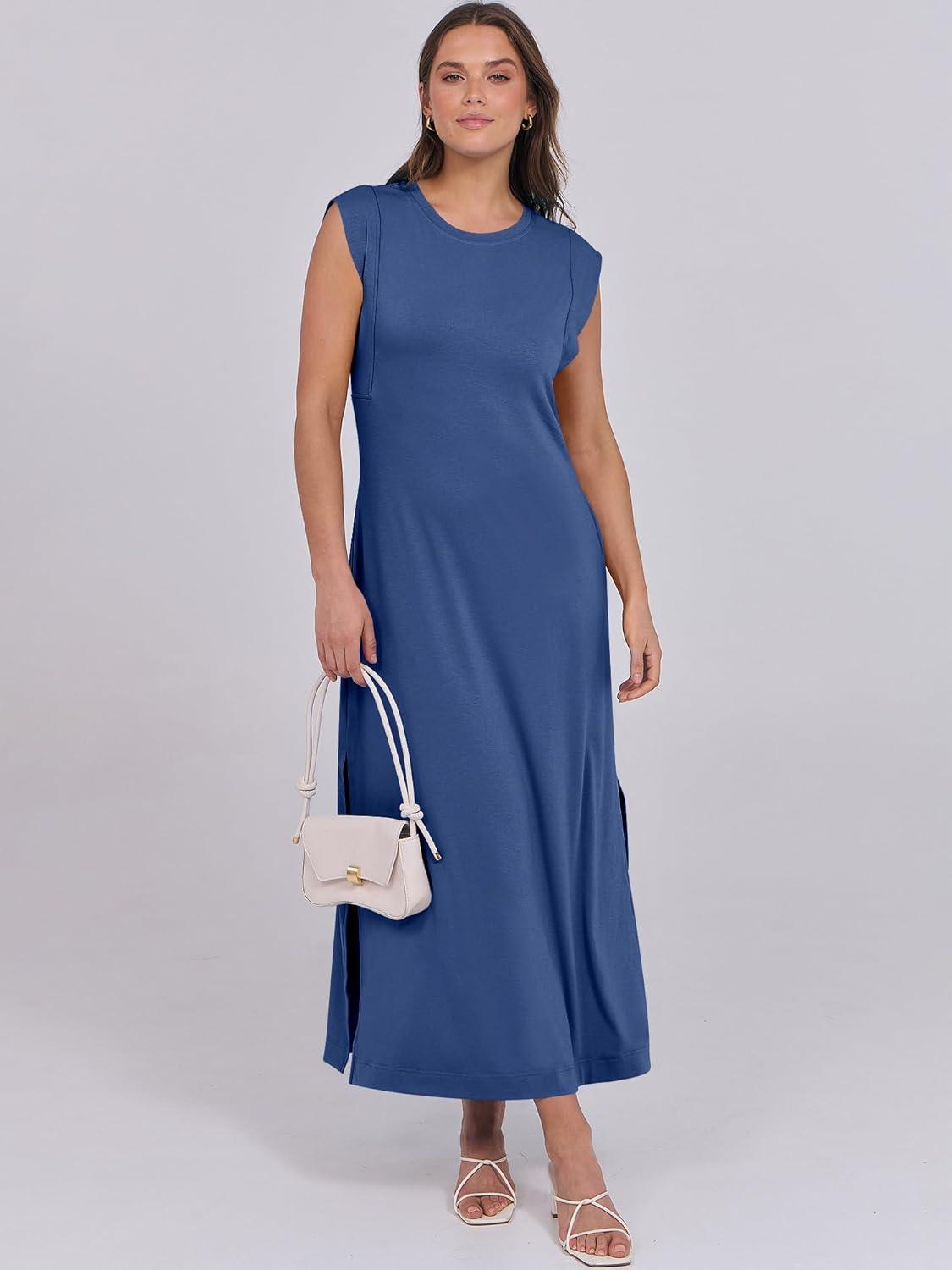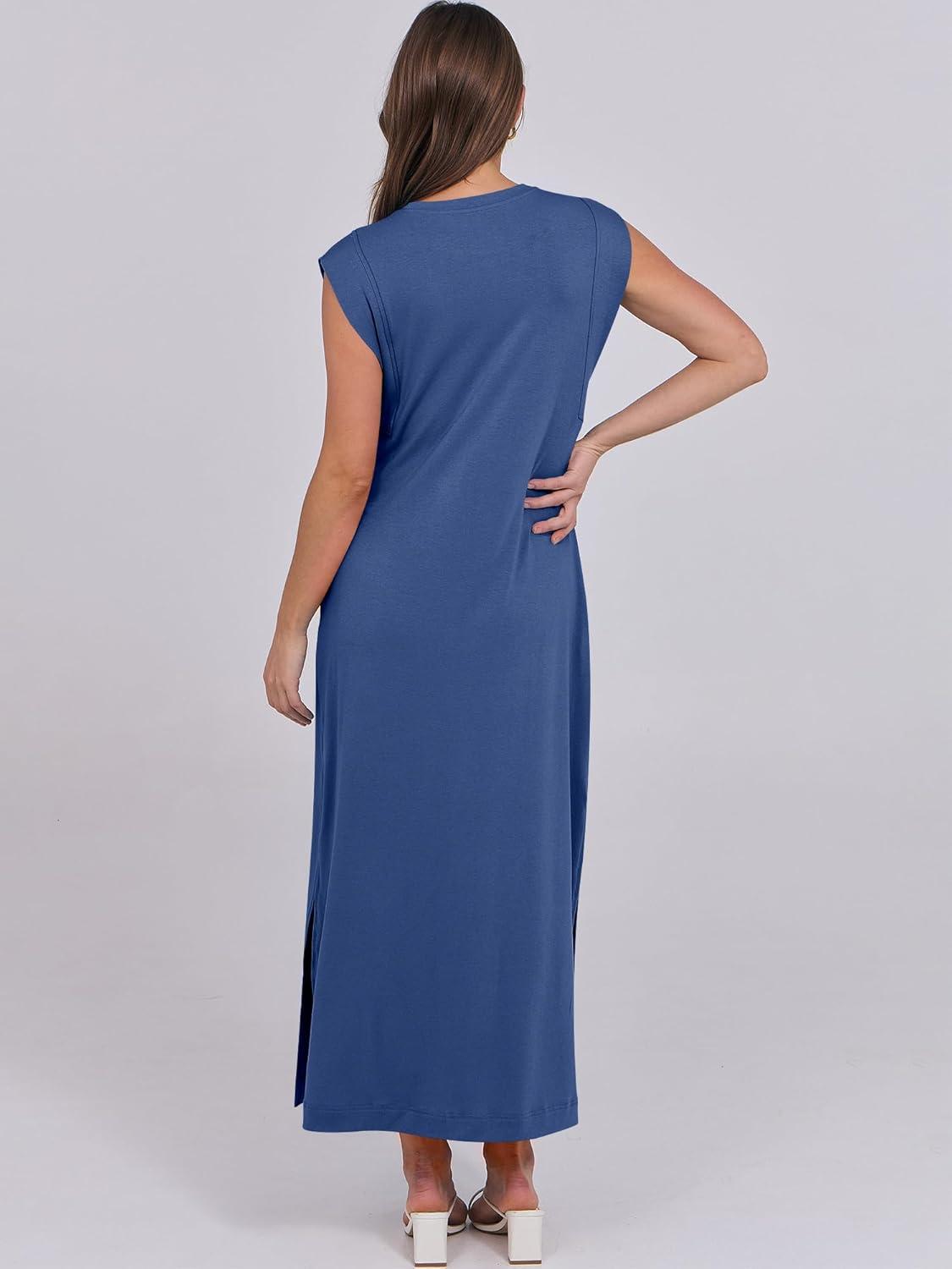 ANRABESS Summer Dress for Women 2025 Maxi Sundresses Casual Cap Sleeve Crew Neck Loose Split Beach Travel Vacation Outfits(Dark Blue)