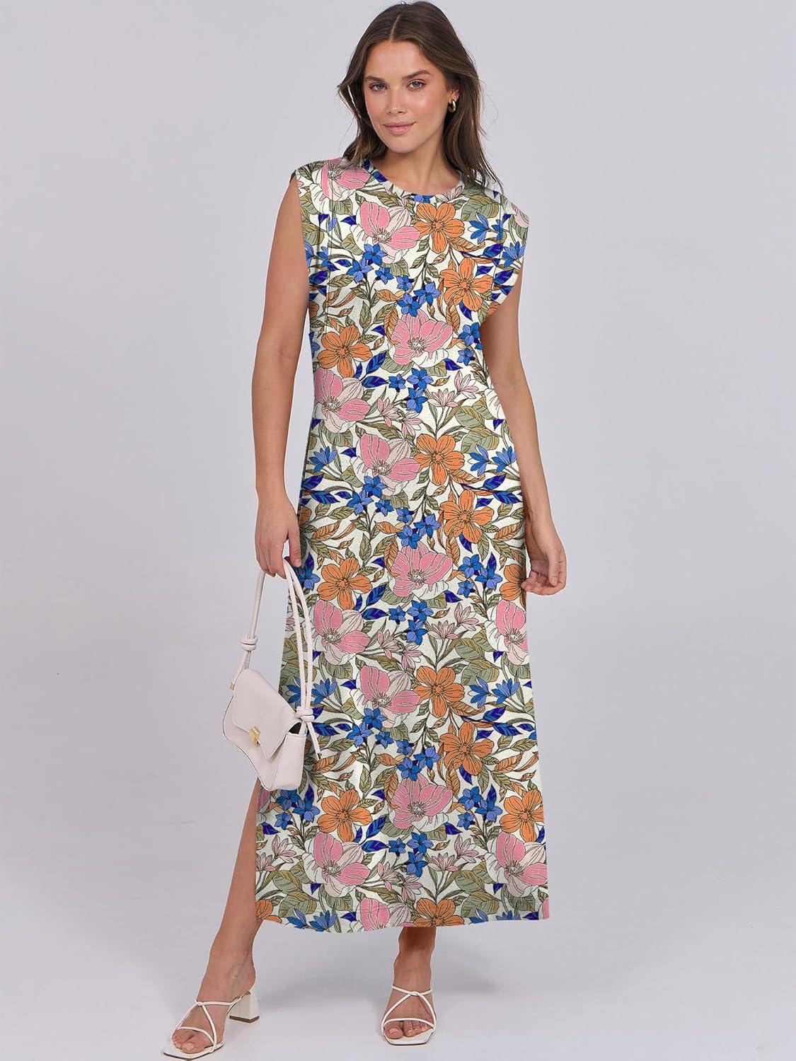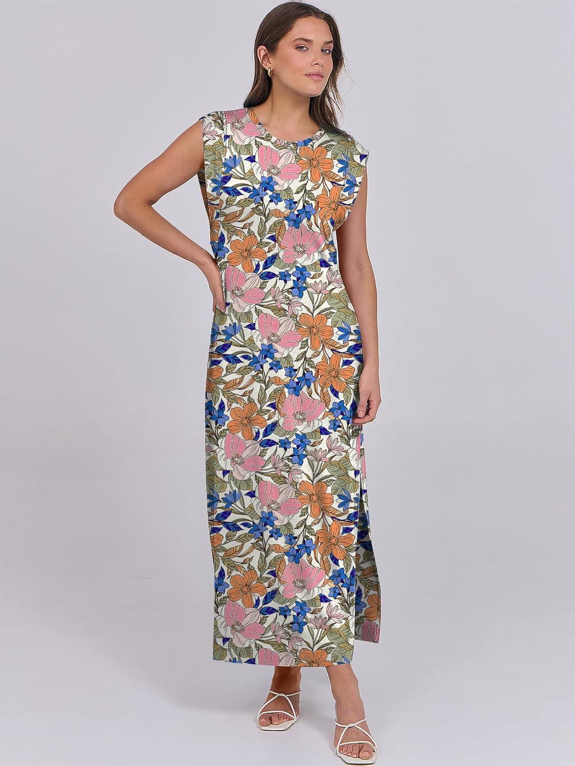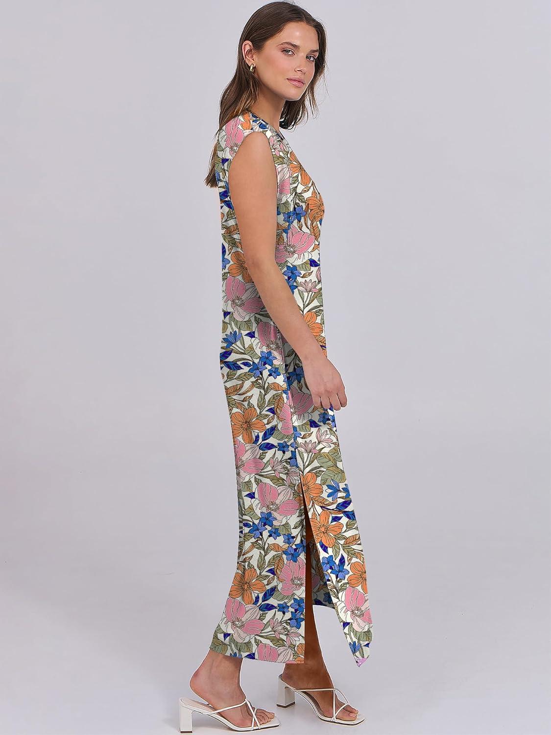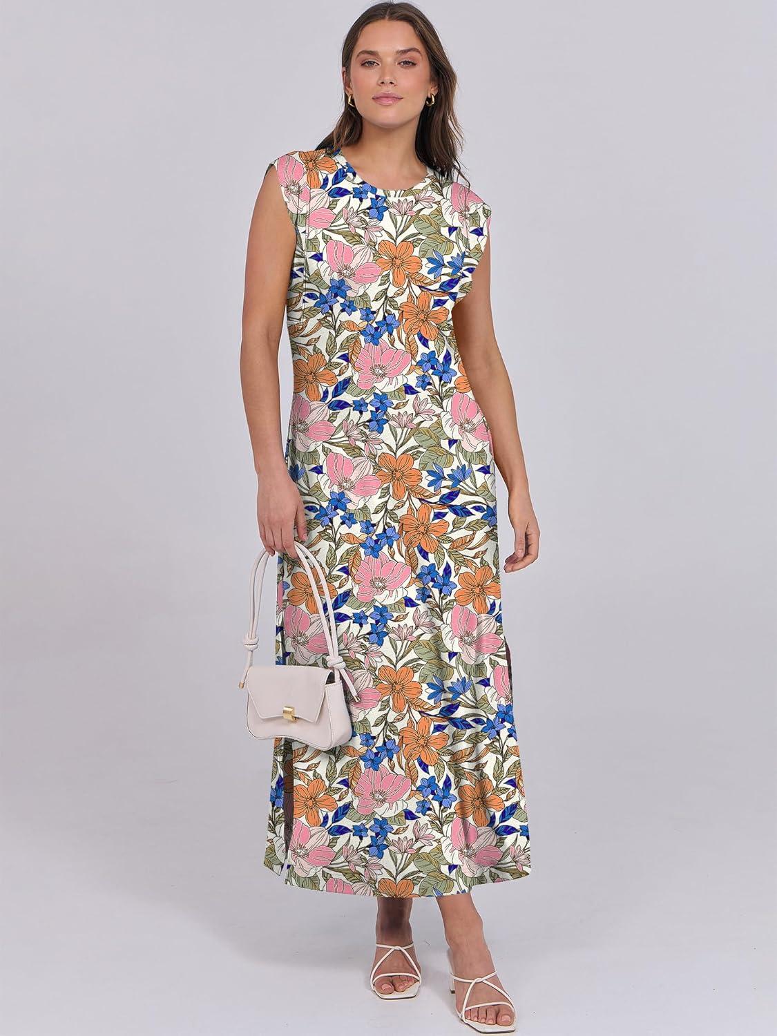 ANRABESS Summer Dress for Women 2025 Maxi Sundresses Casual Cap Sleeve Crew Neck Loose Split Beach Travel Vacation Outfits(Floral Blue Orange Pink)