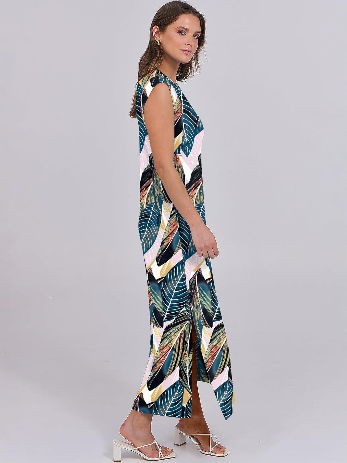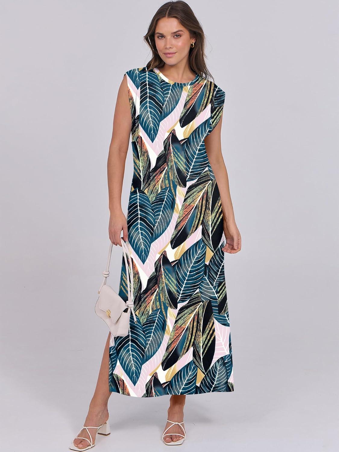 ANRABESS Summer Dress for Women 2025 Maxi Sundresses Casual Cap Sleeve Crew Neck Loose Split Beach Travel Vacation Outfits(Leaf Printed)