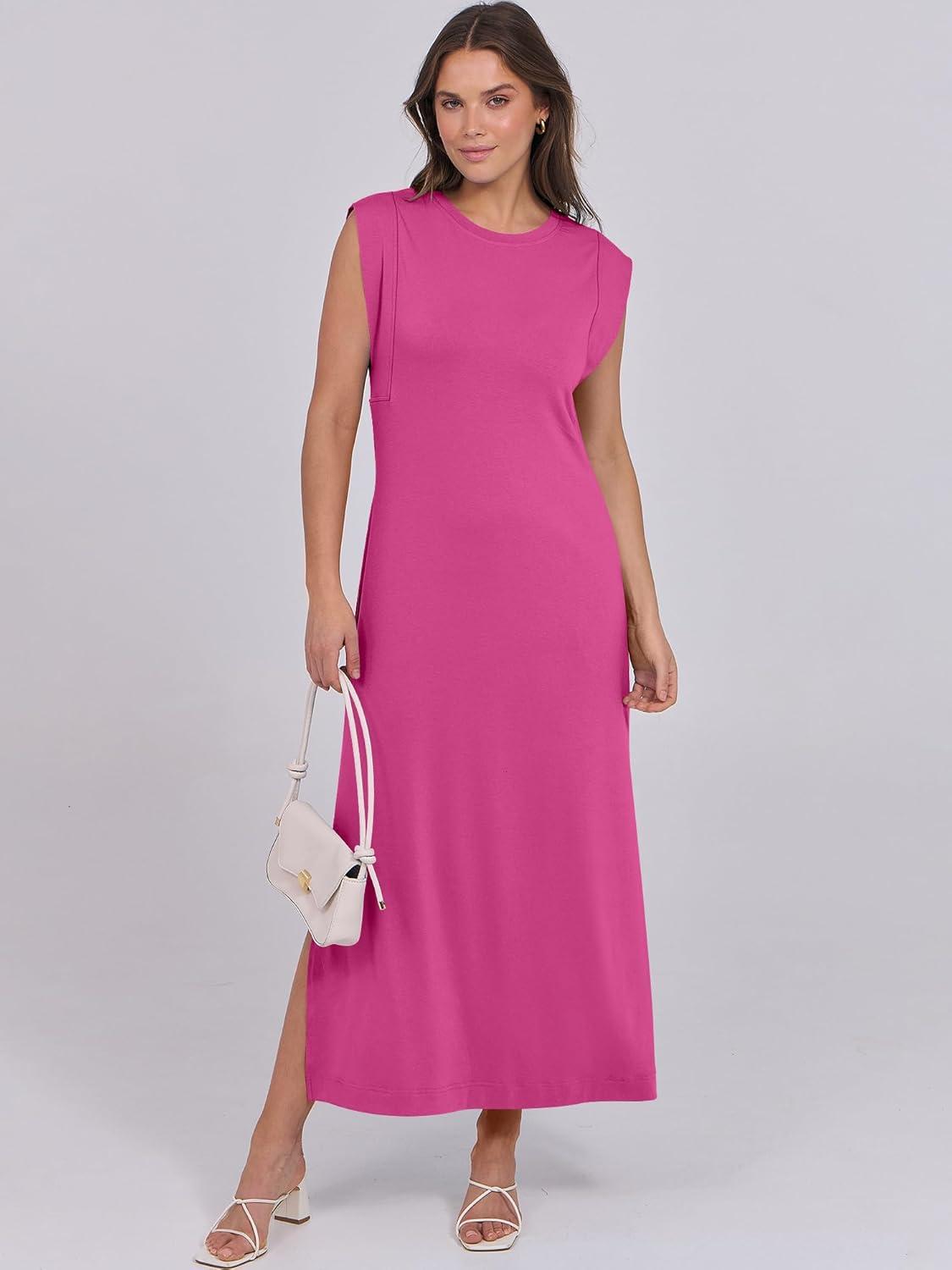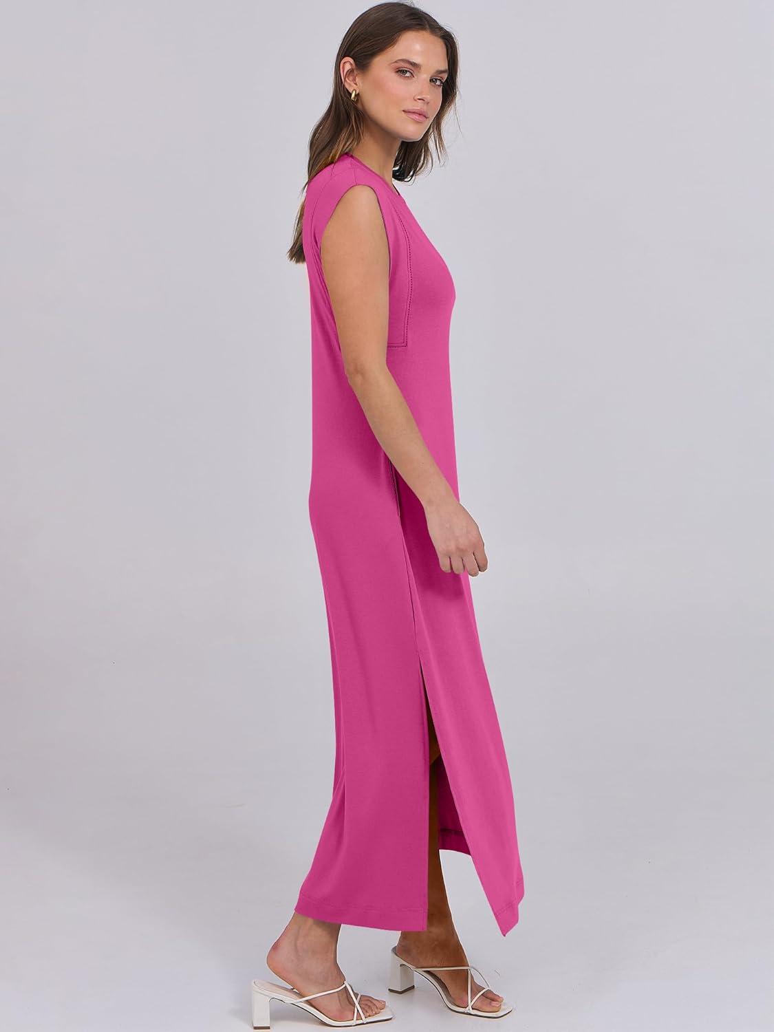 ANRABESS Summer Dress for Women 2025 Maxi Sundresses Casual Cap Sleeve Crew Neck Loose Split Beach Travel Vacation Outfits(Rose)