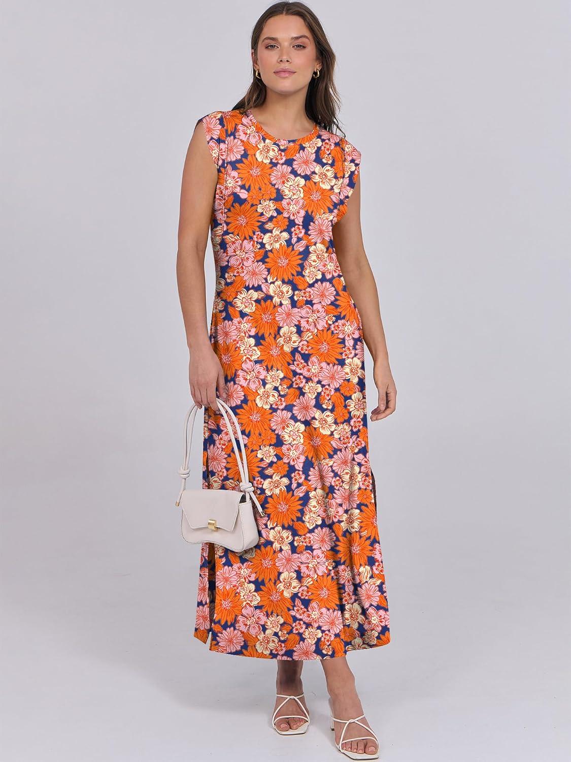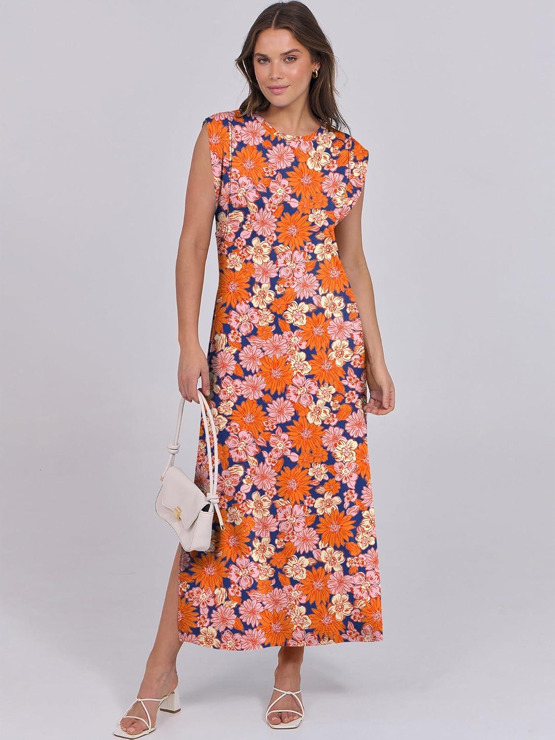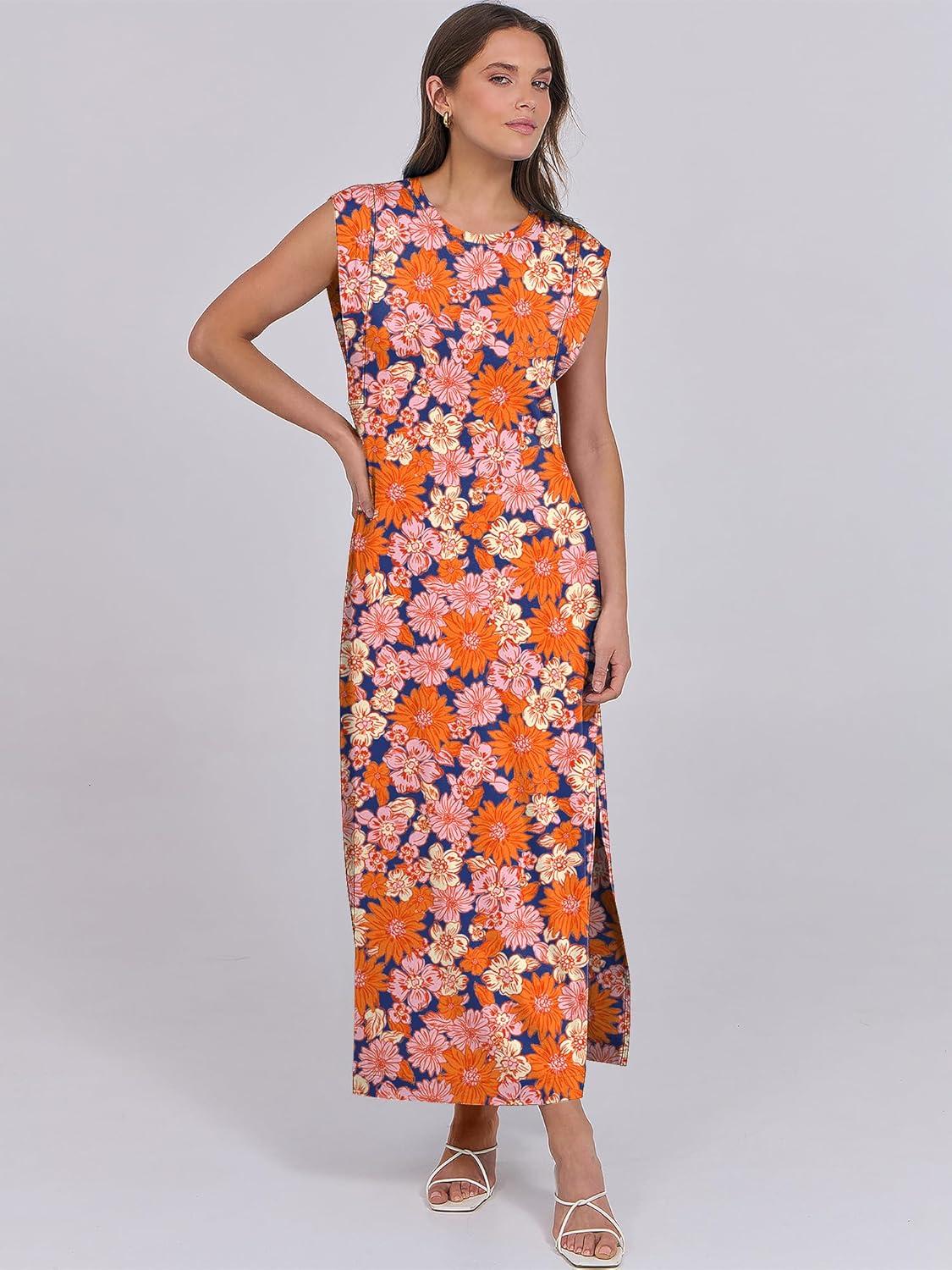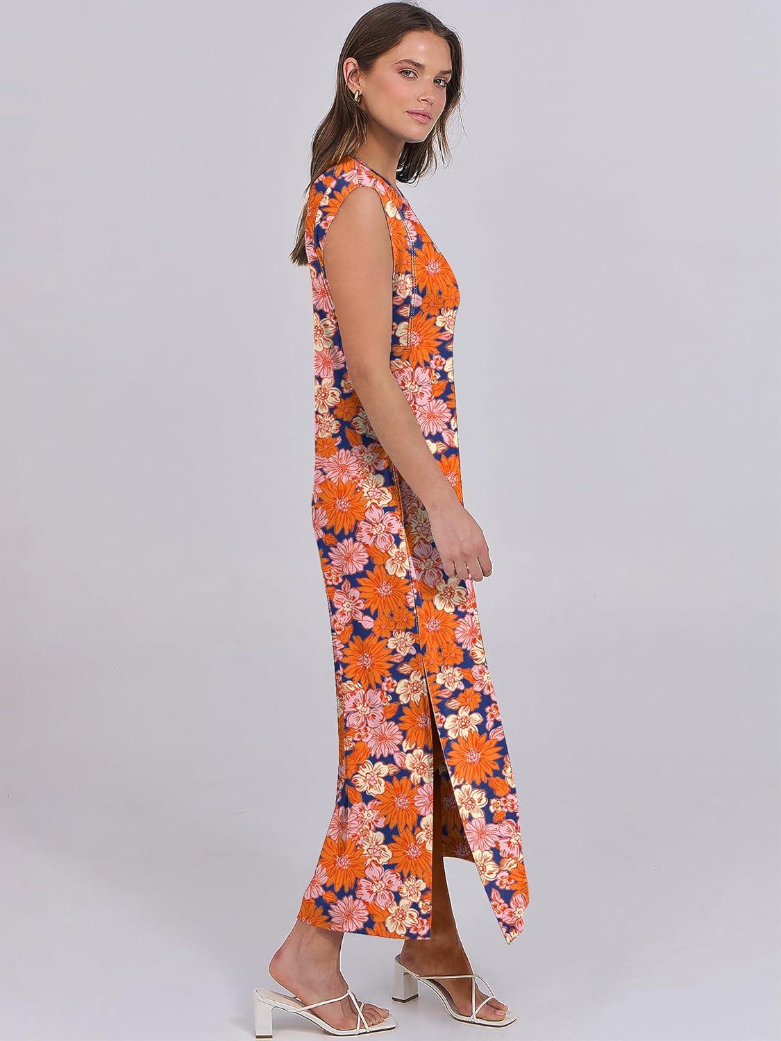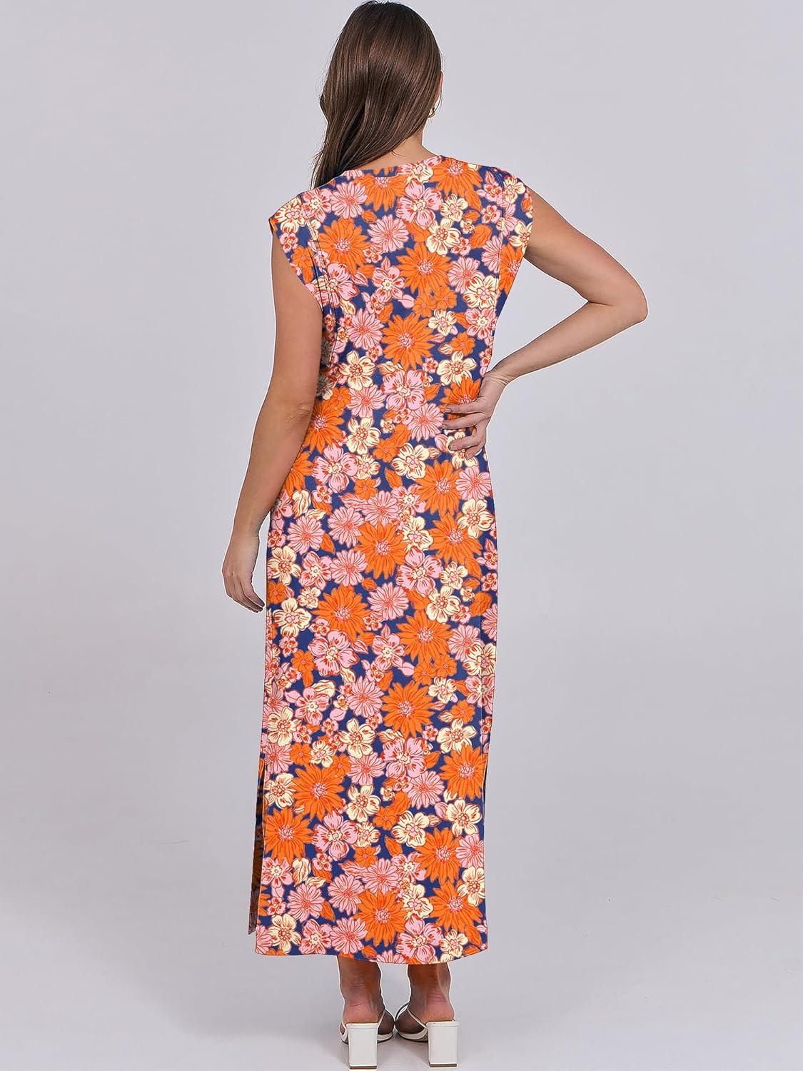 ANRABESS Summer Dress for Women 2026 Maxi Sundresses Casual Cap Sleeve Crew Neck Loose Split Beach Travel Vacation Outfits(Floral Orange Pink)