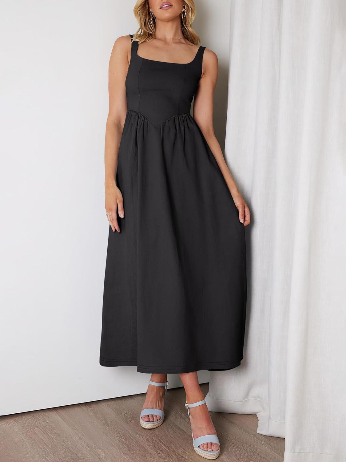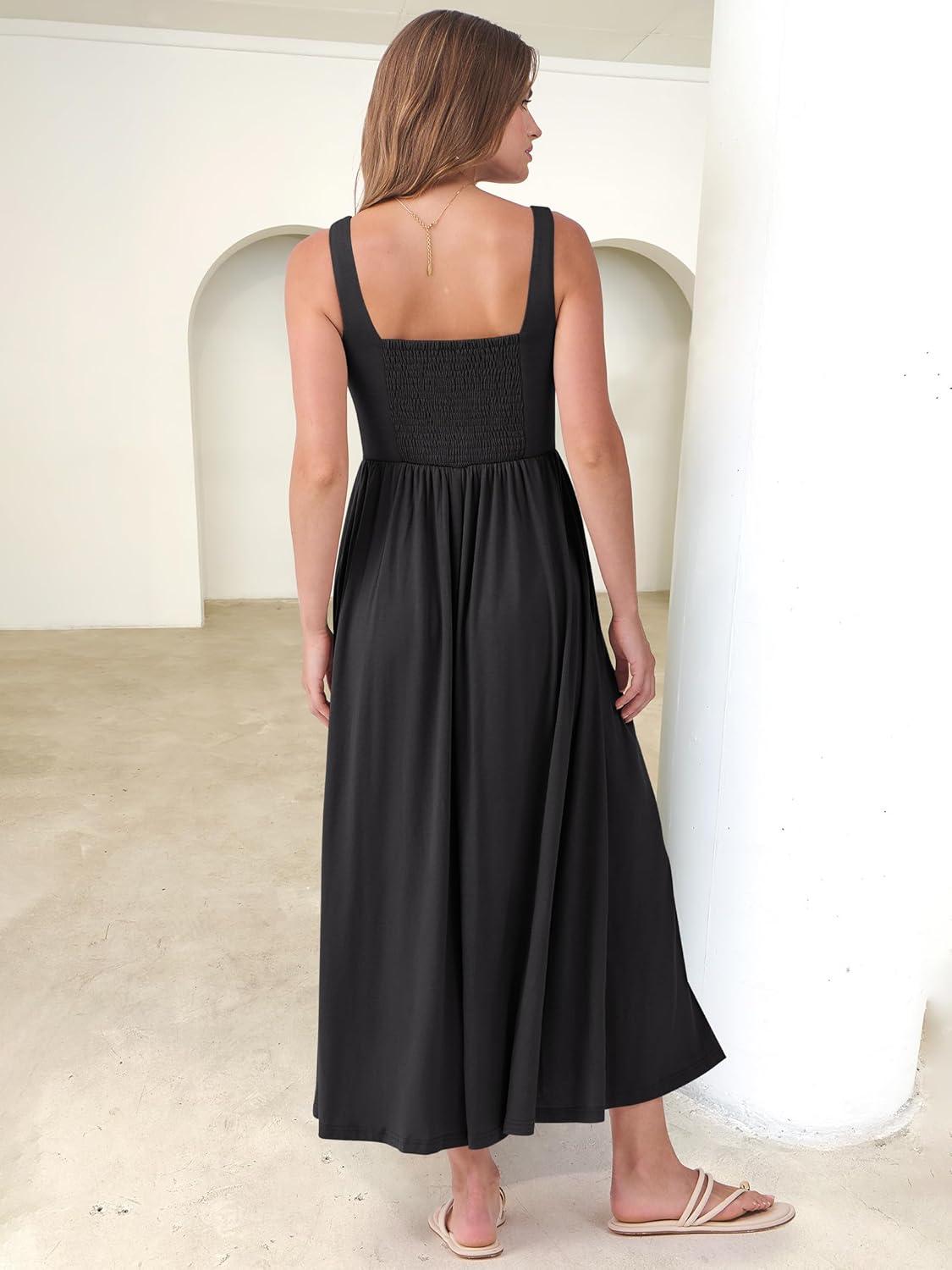 ANRABESS Sundresses for Women 2025 Summer Casual Sleeveless Square Neck Smocked Flowy Beach Vacation Midi Dress with Pockets(Black)
