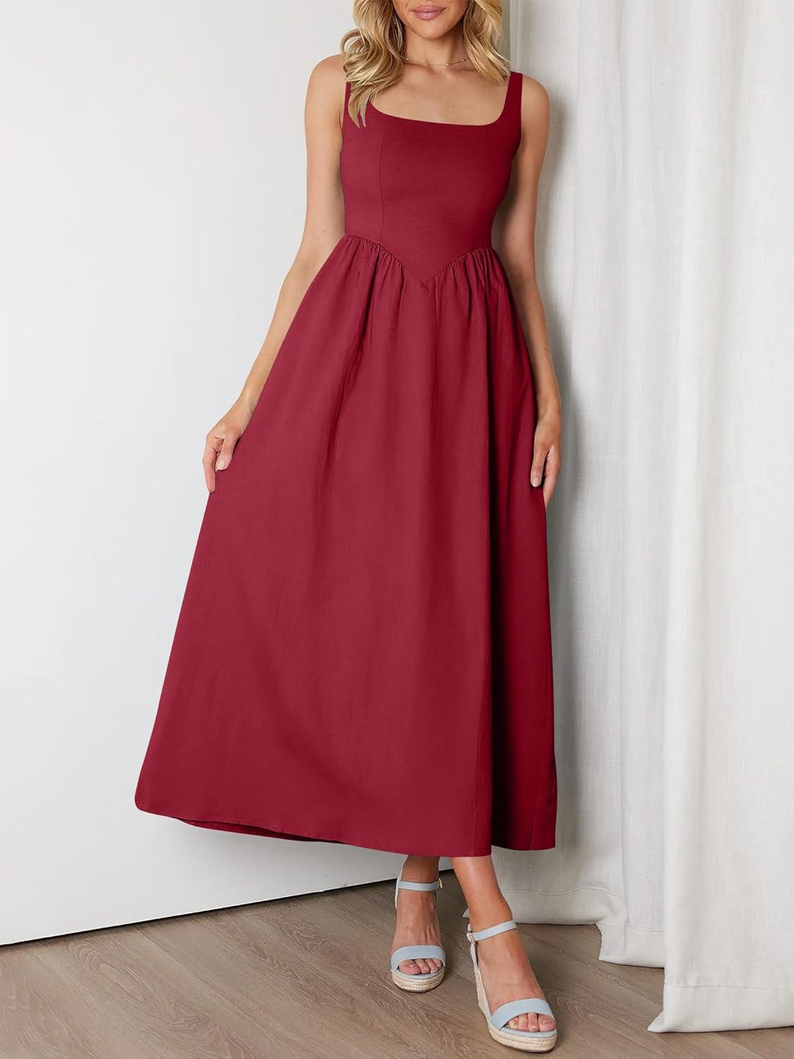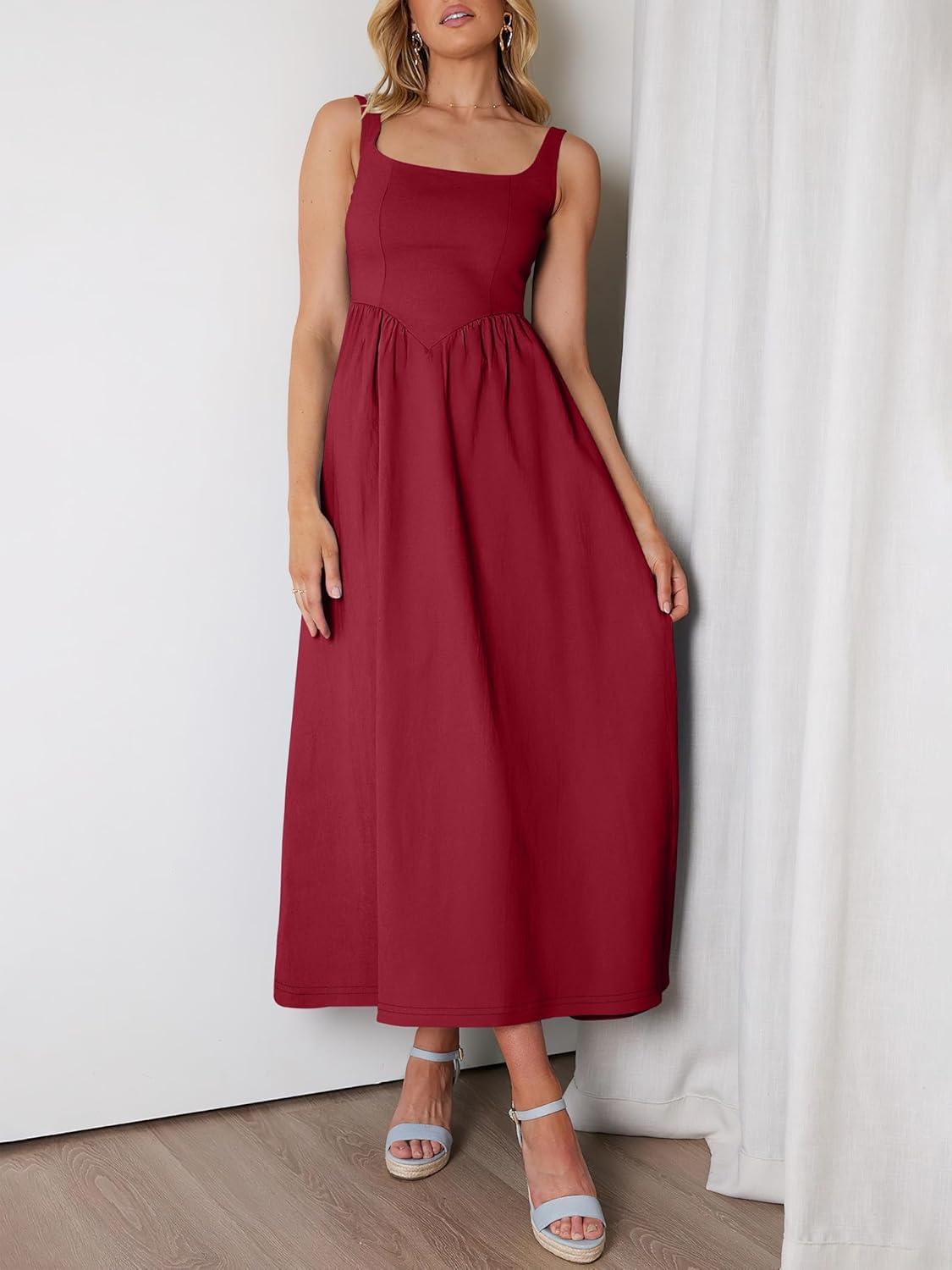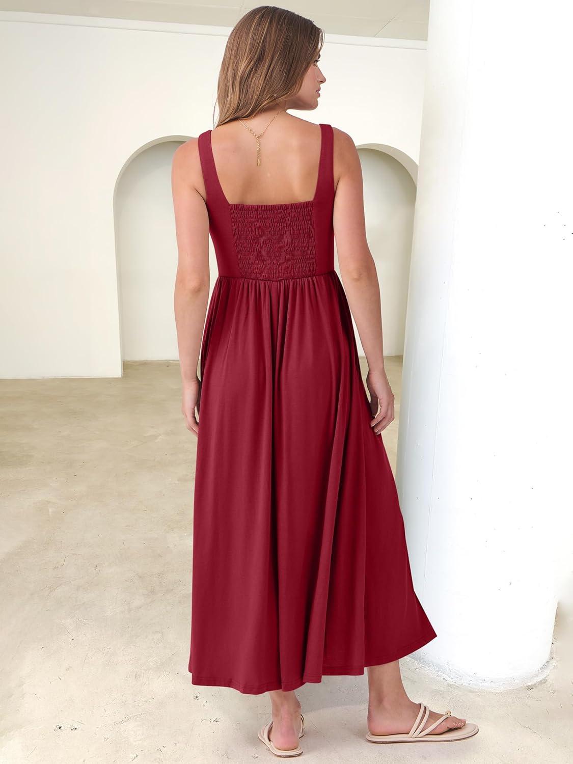 ANRABESS Sundresses for Women 2025 Summer Casual Sleeveless Square Neck Smocked Flowy Beach Vacation Midi Dress with Pockets(Burgundy)