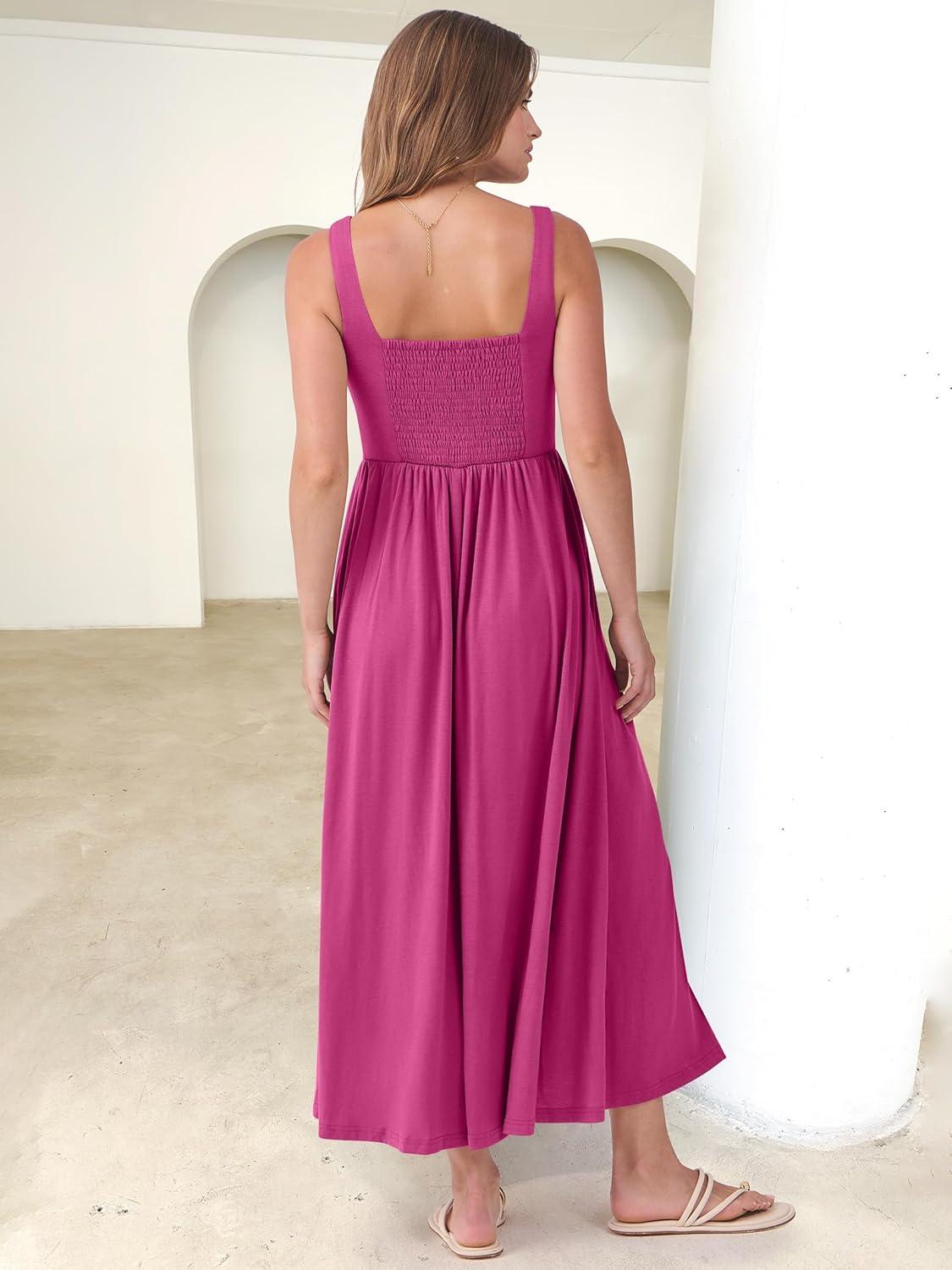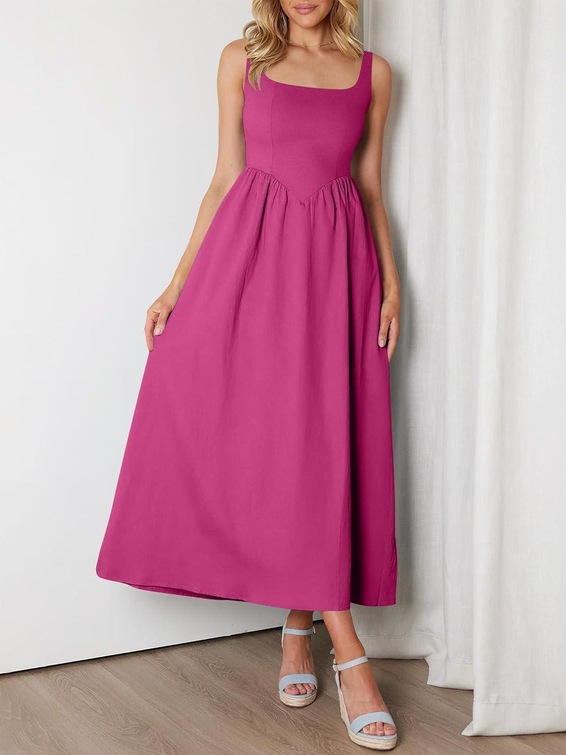 ANRABESS Sundresses for Women 2025 Summer Casual Sleeveless Square Neck Smocked Flowy Beach Vacation Midi Dress with Pockets(Hot Pink)