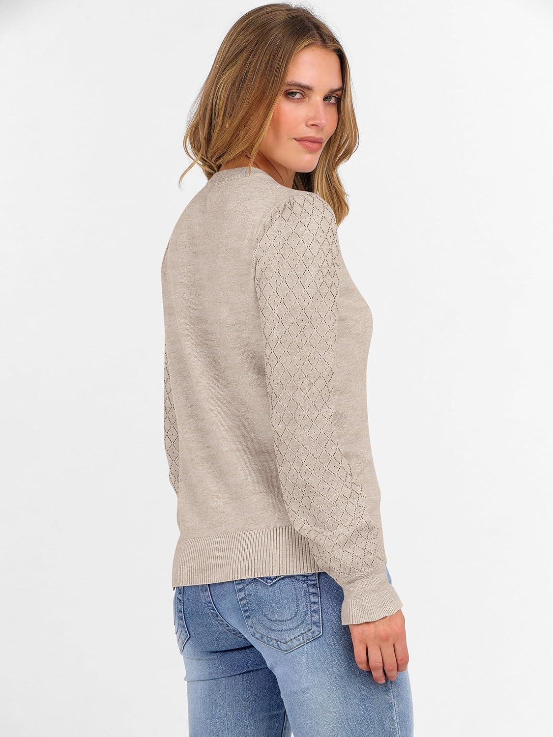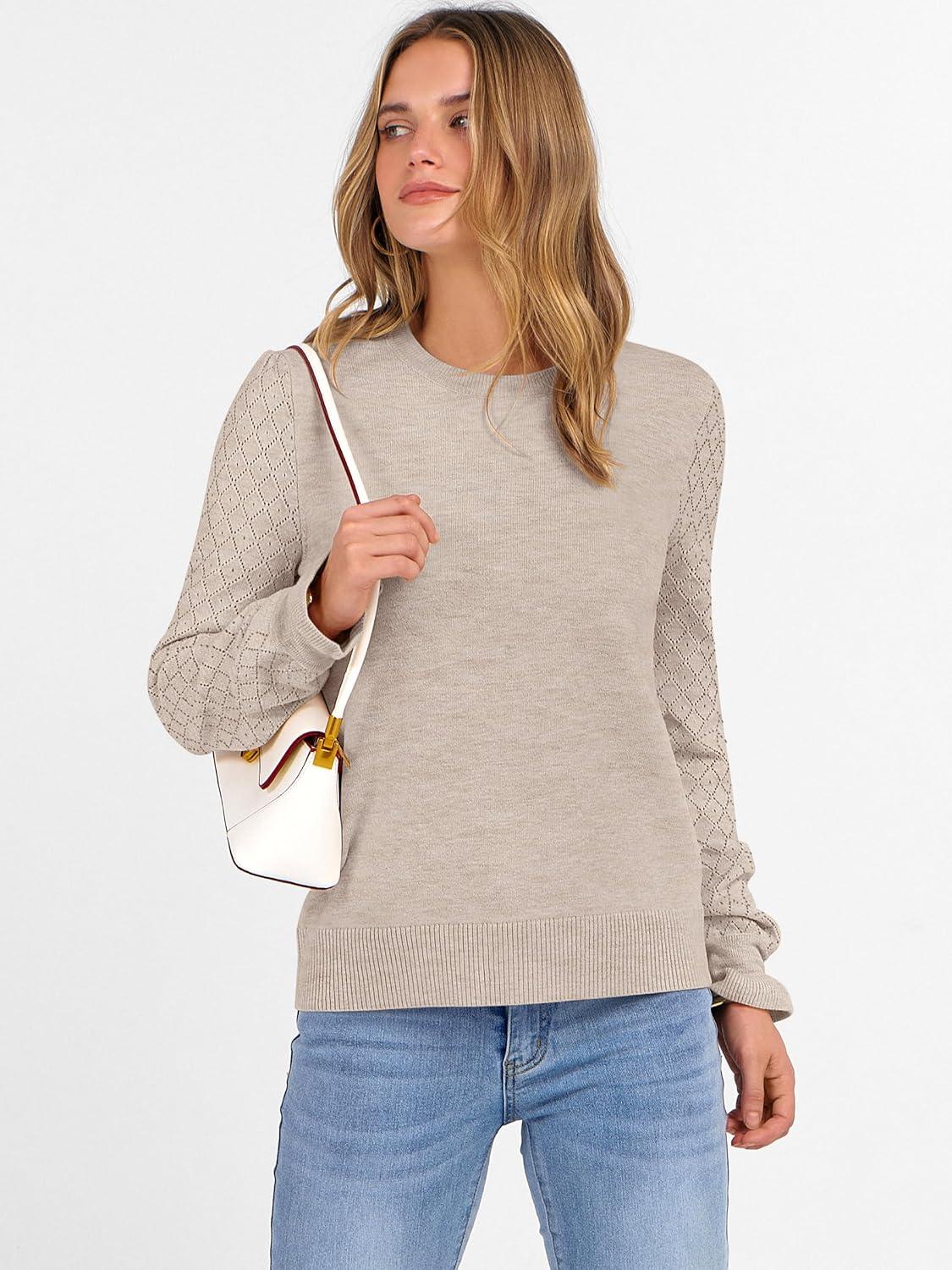 ANRABESS Women's Lace Long Sleeve Sweater Tops: 2025 fall essentials with a regular fit, sizes S-XXL (S=US 4-6 to XXL=US 20-22). Made from 38% Polyester, 30% PBT, 20% Acrylic, 12% Nylon—lightweight with medium stretch, thickness, and softness. This fall outfits for women 2025 features a crewneck, lace puff cuffs, ribbed trims, and hollow-out sleeves, versatile for daily, business, or casual wear—must-have for fall/winter.