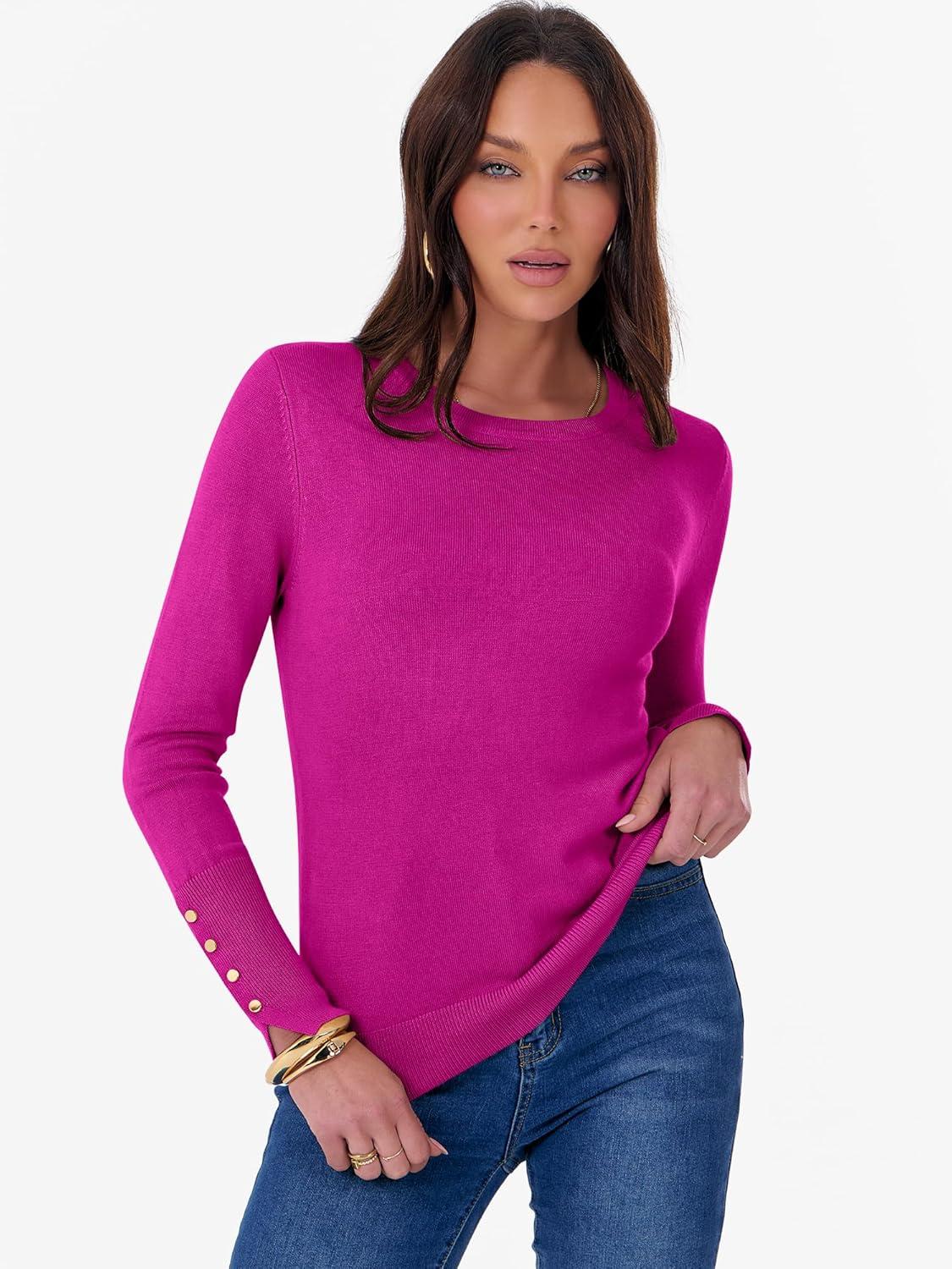 imageANRABESS Sweaters for Women Long Sleeve Crewneck Fitted Business Casual Pullover Tops 2025 Fall Outfits with Button CuffBright Plum Red
