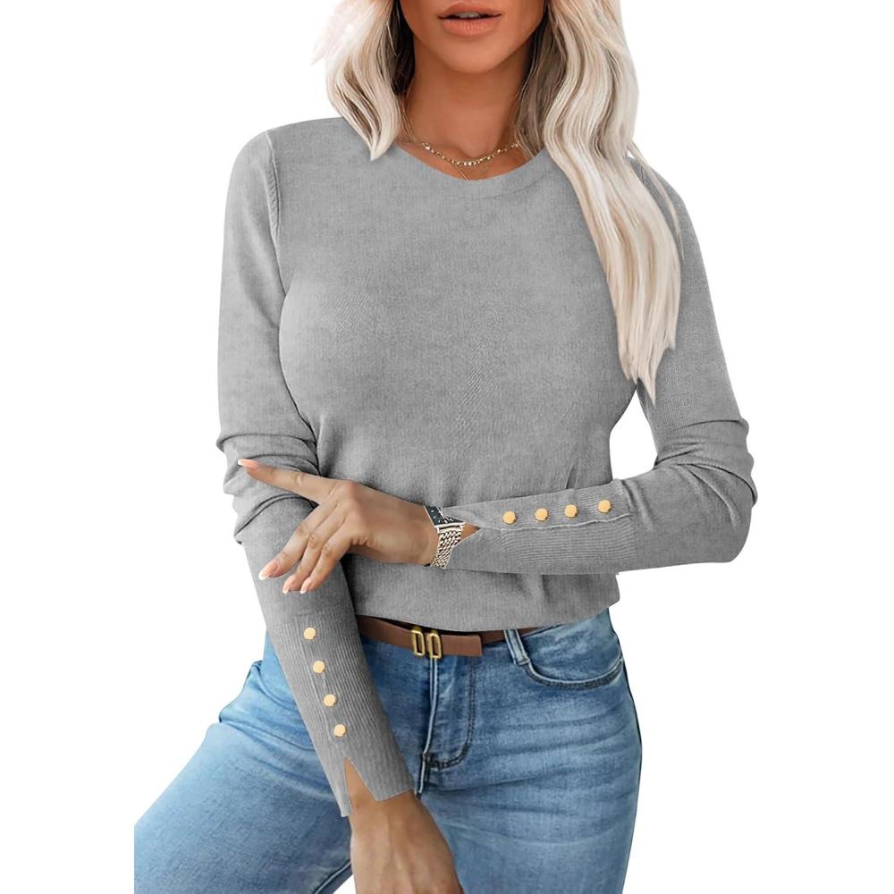 ANRABESS Sweaters for Women Long Sleeve Crewneck Fitted Business Casual Pullover Tops 2025 Fall Outfits with Button Cuff(Grey)