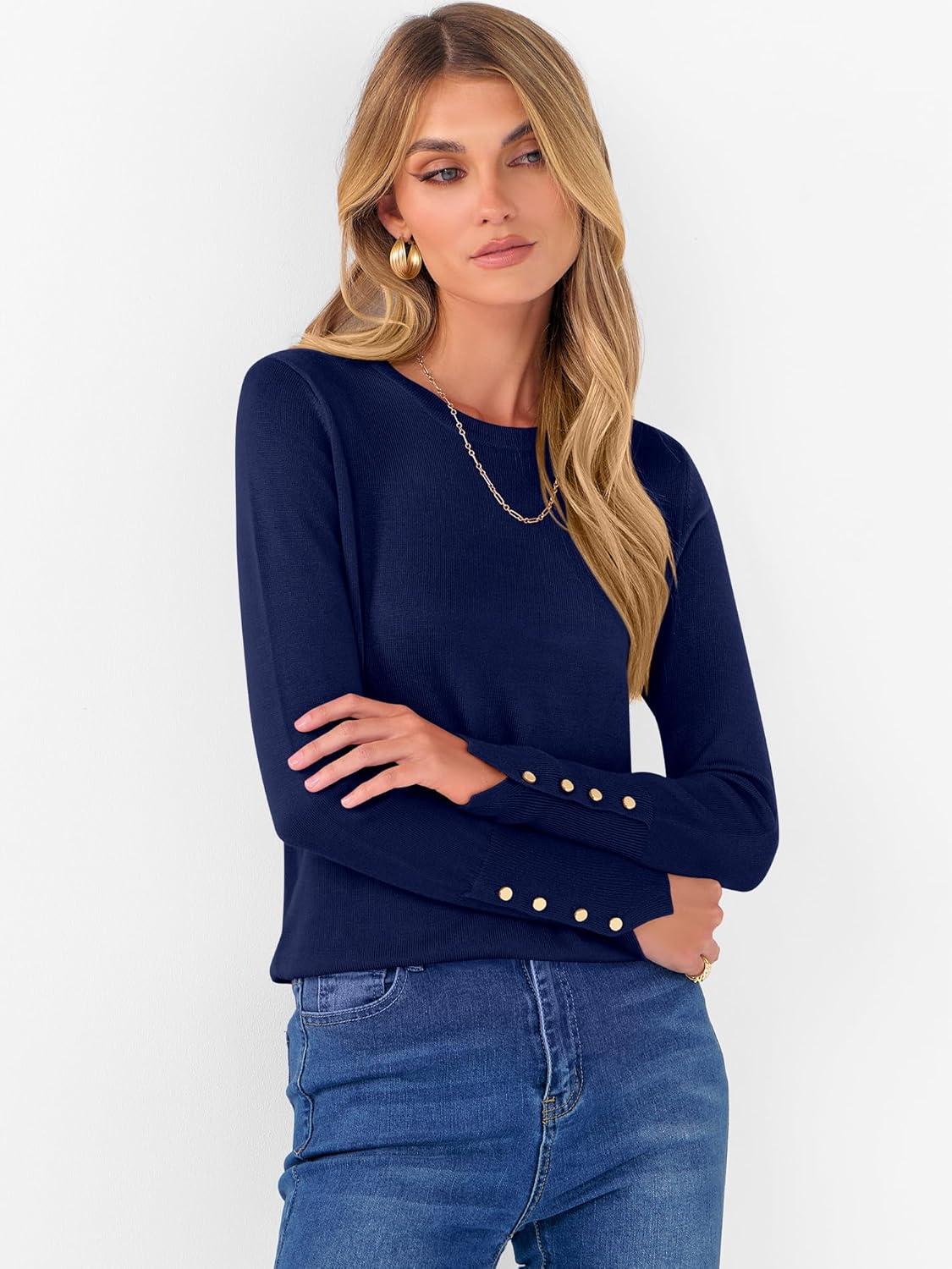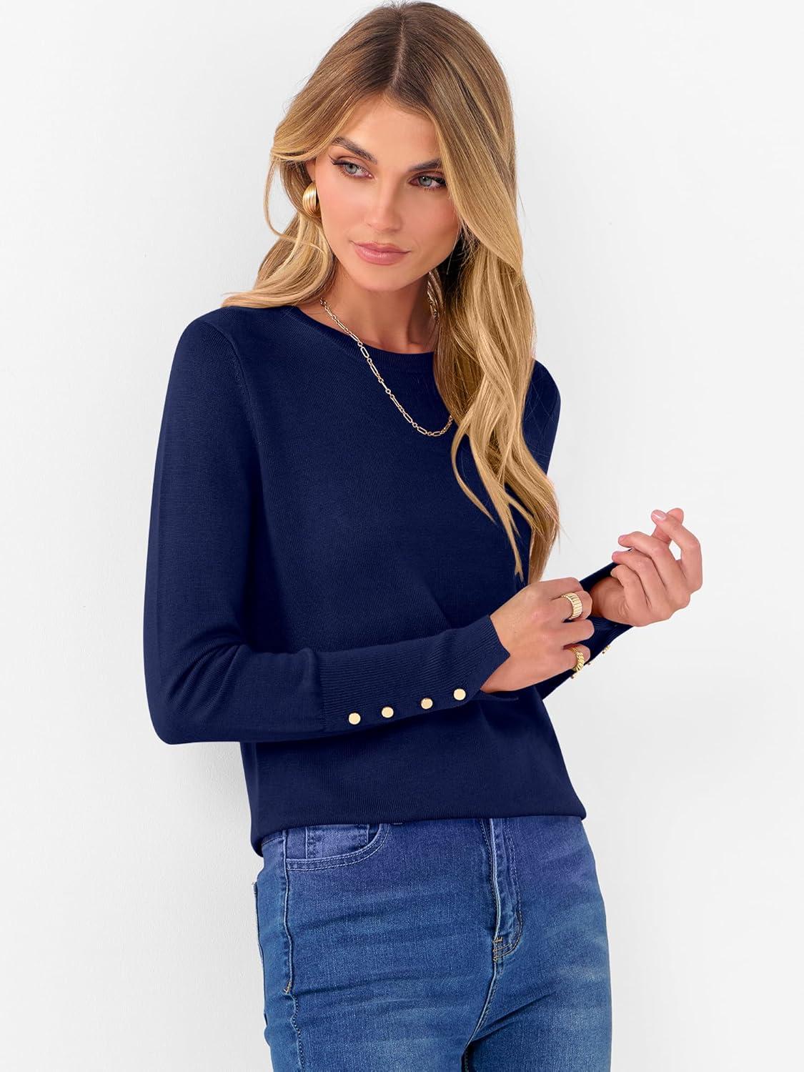 ANRABESS Sweaters for Women Long Sleeve Crewneck Fitted Business Casual Pullover Tops 2025 Fall Outfits with Button Cuff(Navy Blue)