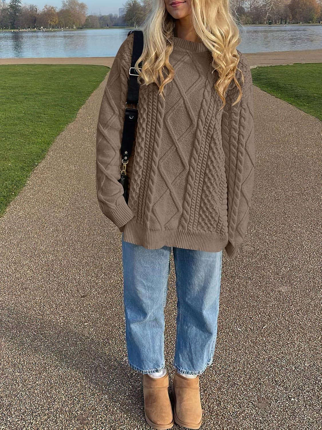 ANRABESS Sweaters for Women Oversized Cable Knit Fall Long Sleeve Crewneck Casual Pullover Sweater Tops 2025 Winter Outfits(Coffee)