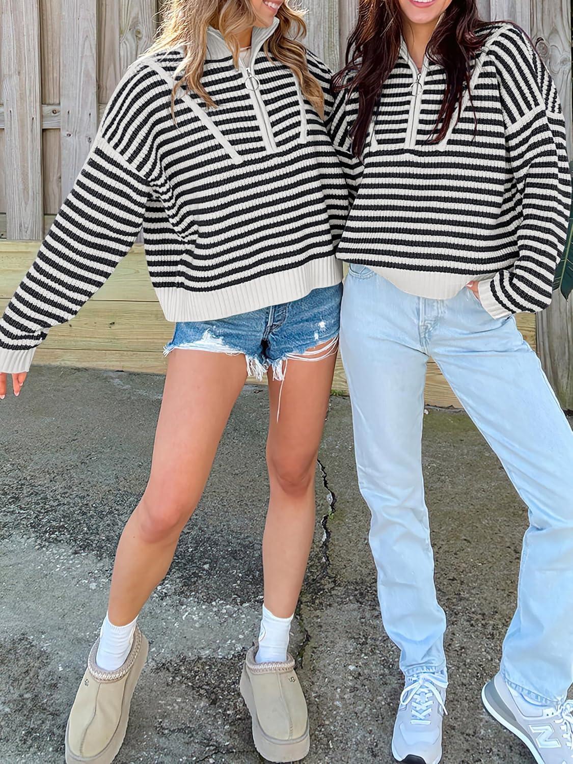 ANRABESS Sweaters for Women Striped Half Zip Long Sleeve Ribbed Knit Pullover Comfy Casual Lightweight Tops 2025 Fall Fashion(Striped Black Beige)