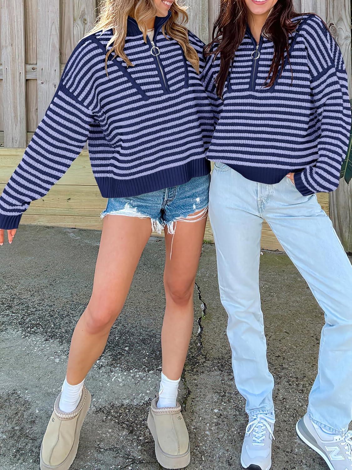 ANRABESS Sweaters for Women Striped Half Zip Long Sleeve Ribbed Knit Pullover Comfy Casual Lightweight Tops 2025 Fall Fashion(Striped Navy Purple)