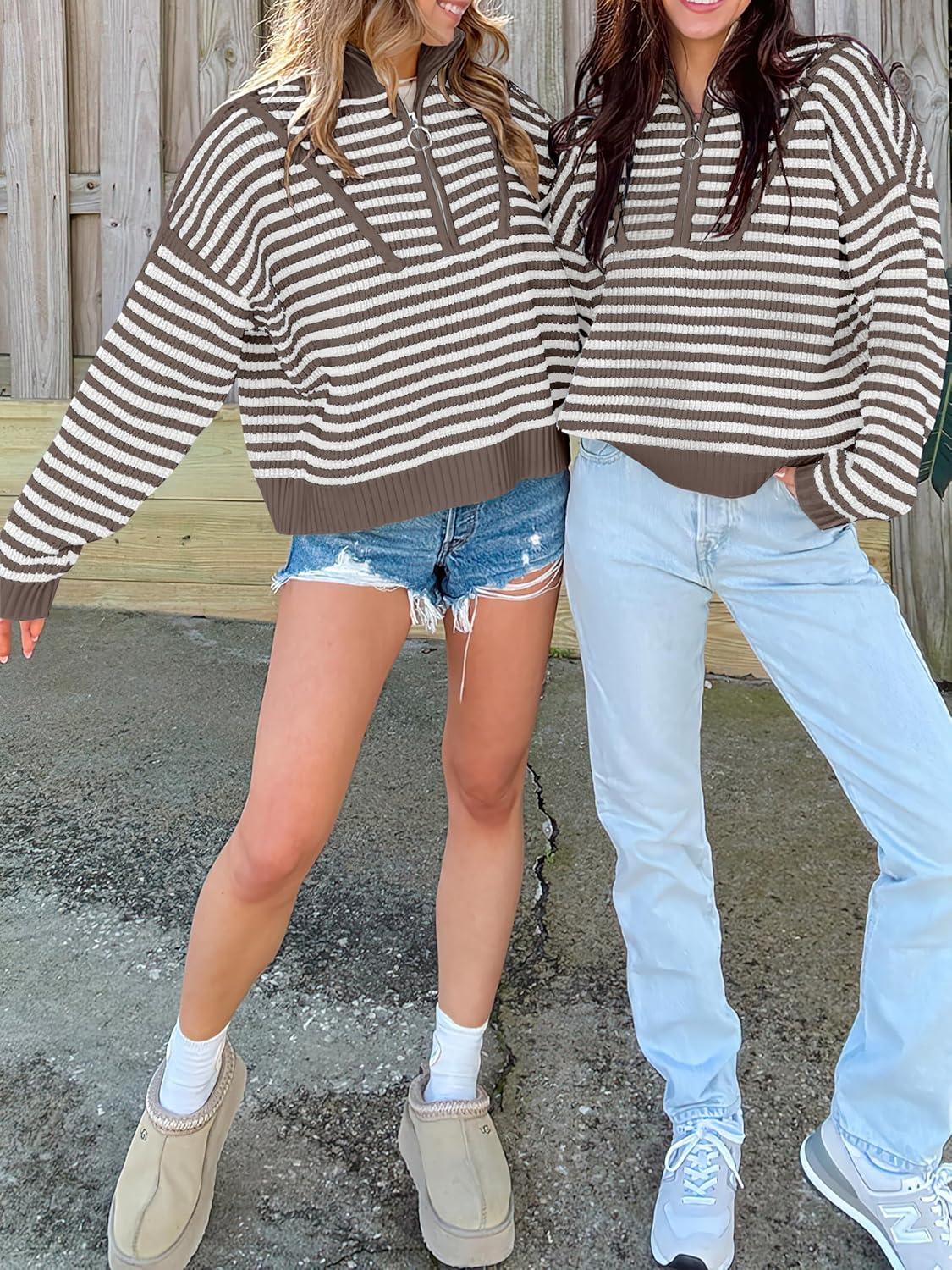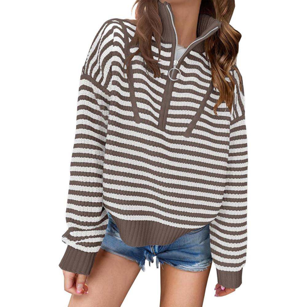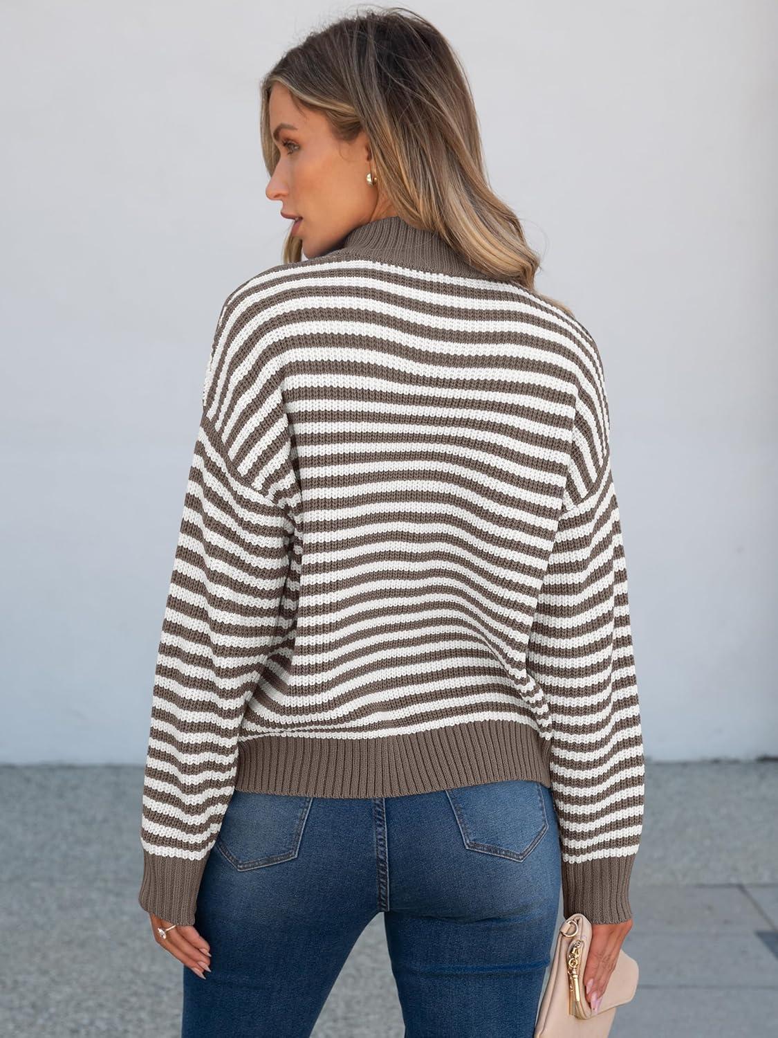 ANRABESS Sweaters for Women Striped Half Zip Long Sleeve Ribbed Knit Pullover Comfy Casual Lightweight Tops 2025 Fall Fashion(Striped White Khaki)