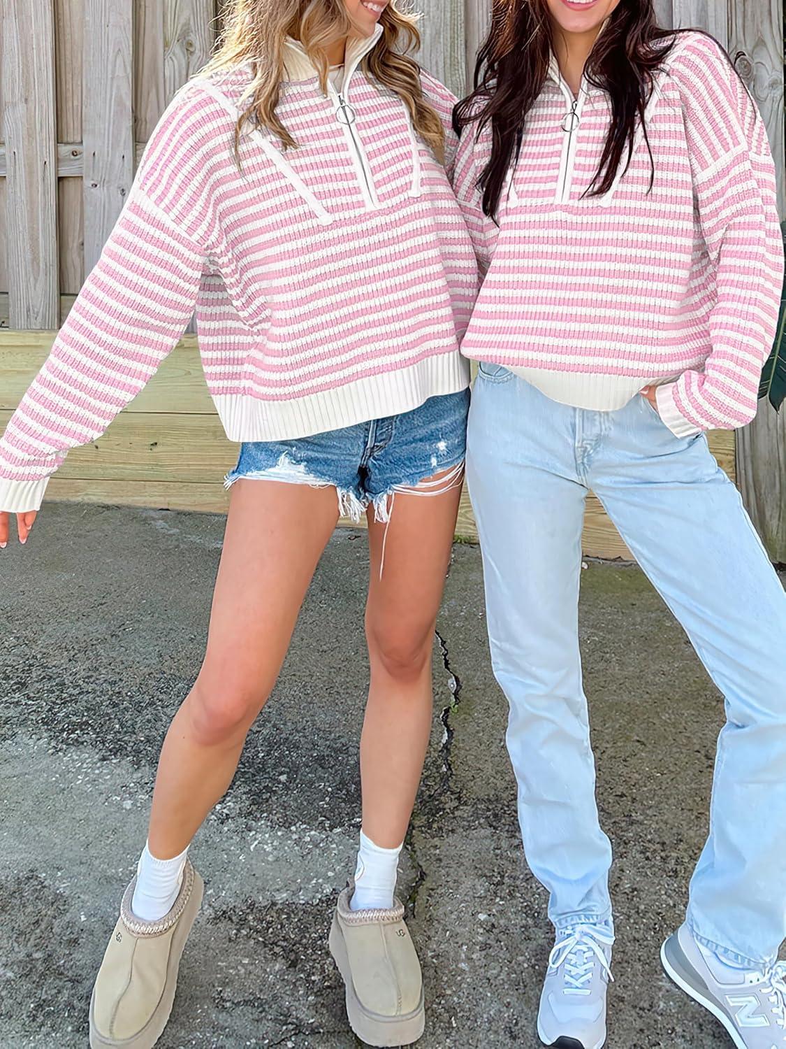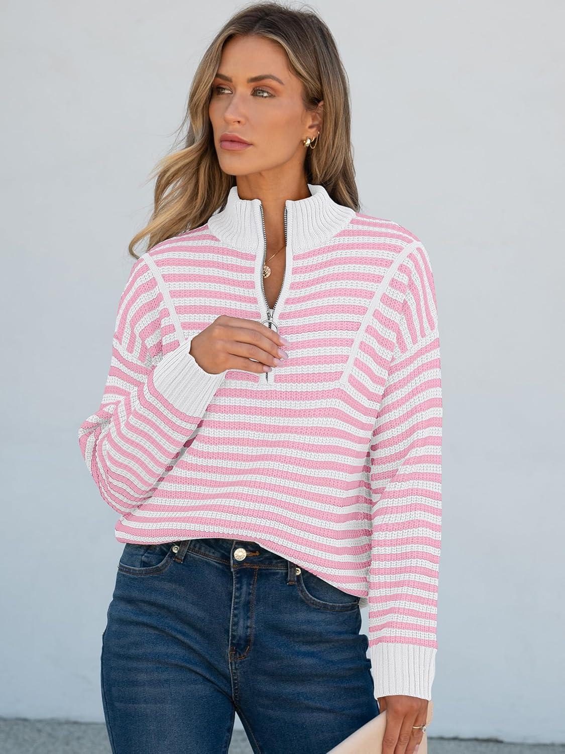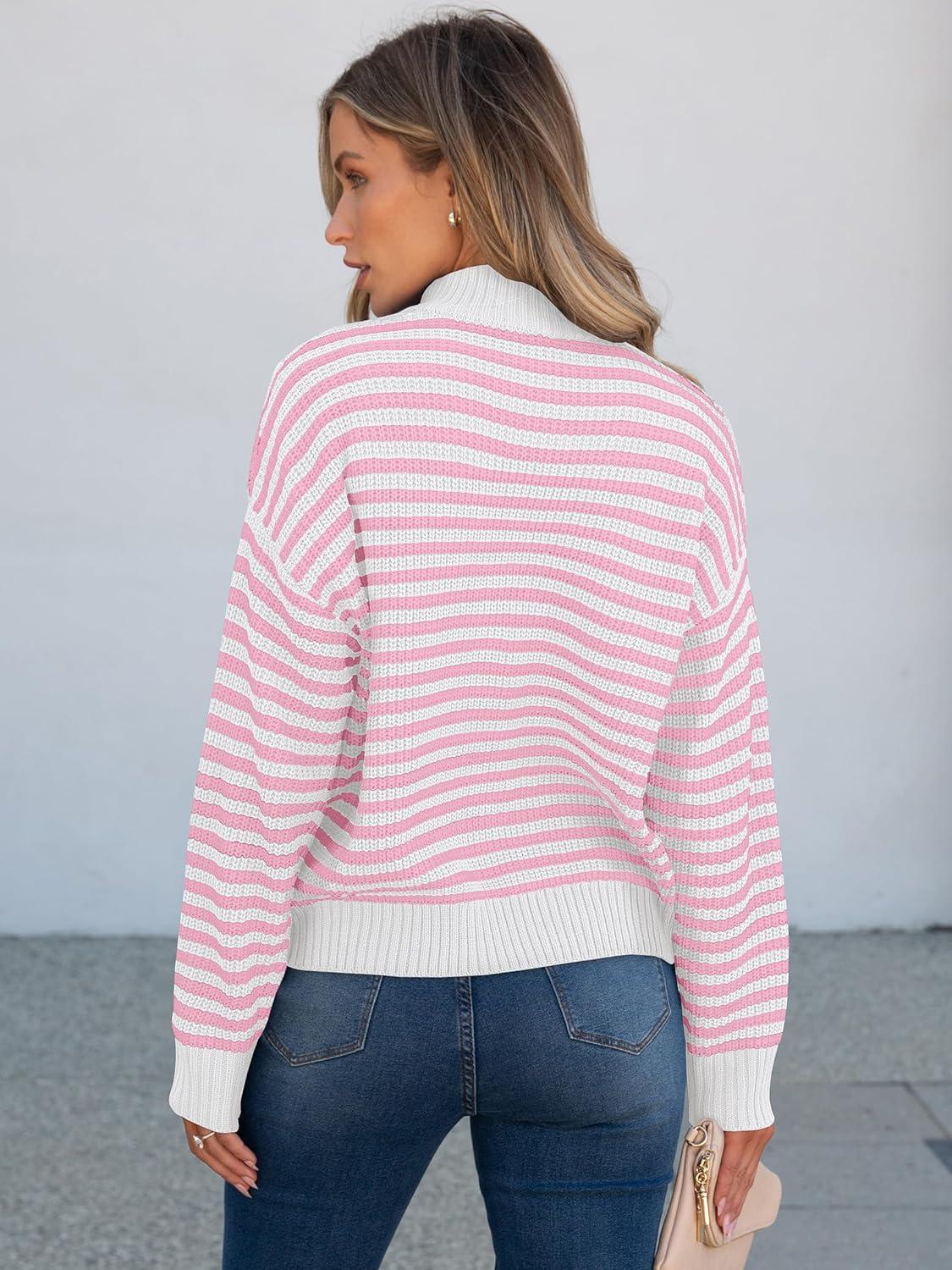 ANRABESS Sweaters for Women Striped Half Zip Long Sleeve Ribbed Knit Pullover Comfy Casual Lightweight Tops 2025 Fall Fashion(Striped White Light Pink)