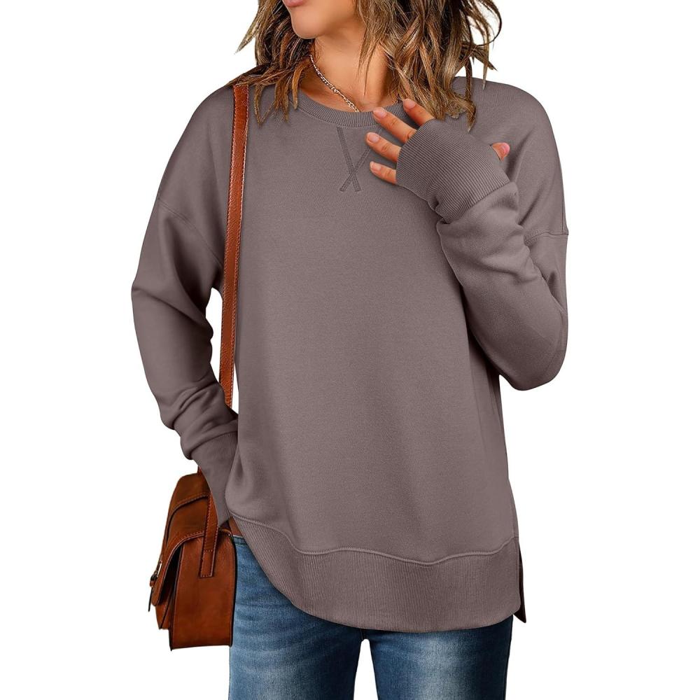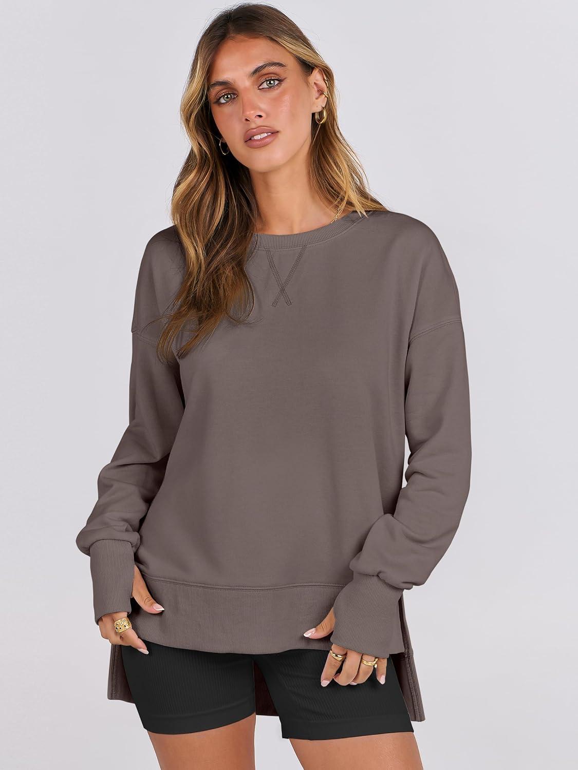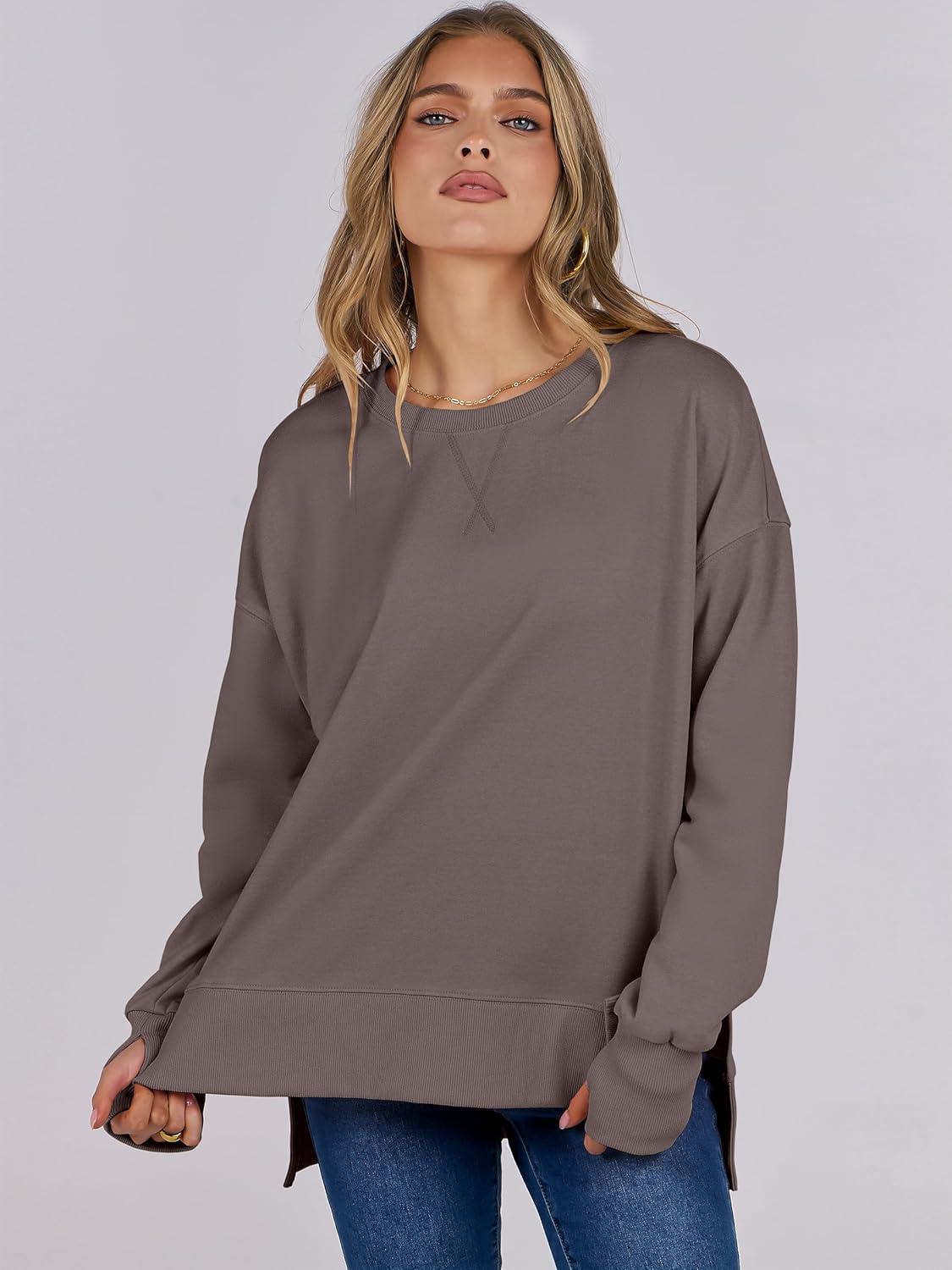 imageANRABESS Sweatshirts for Women 2025 Fall Long Sleeve Shirts Oversized Crewneck Lightweight Side Split Casual Pullover TopsBurnt Brown