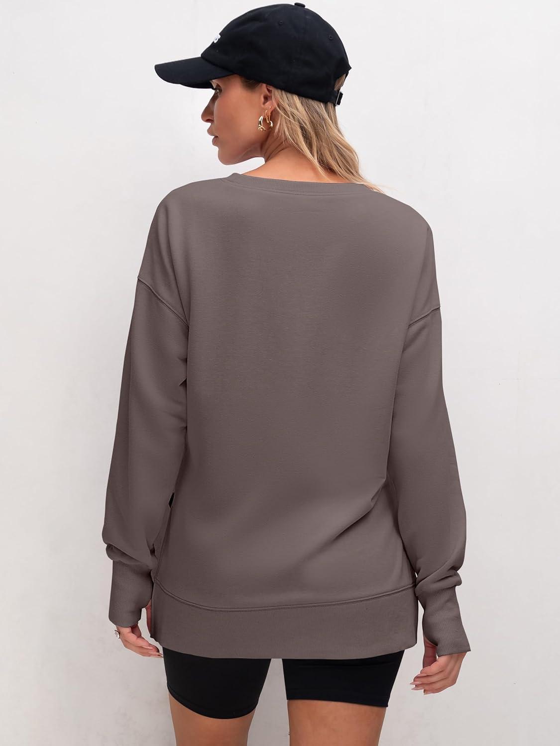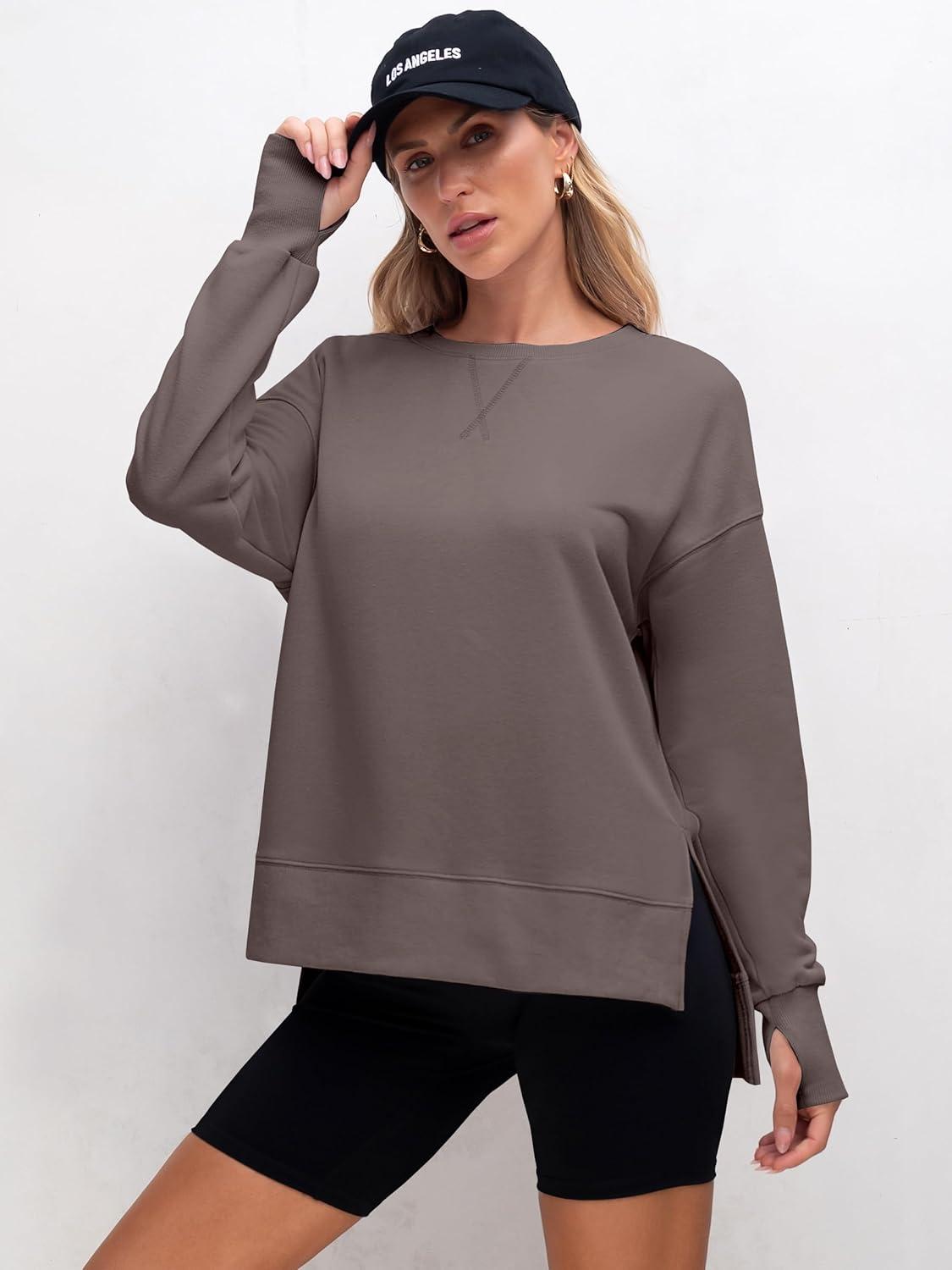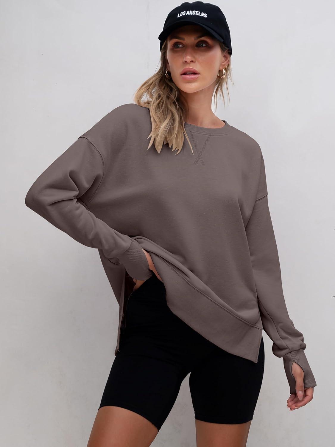 imageANRABESS Sweatshirts for Women 2025 Fall Long Sleeve Shirts Oversized Crewneck Lightweight Side Split Casual Pullover TopsBurnt Brown